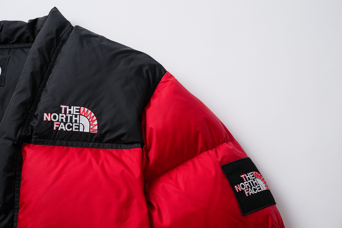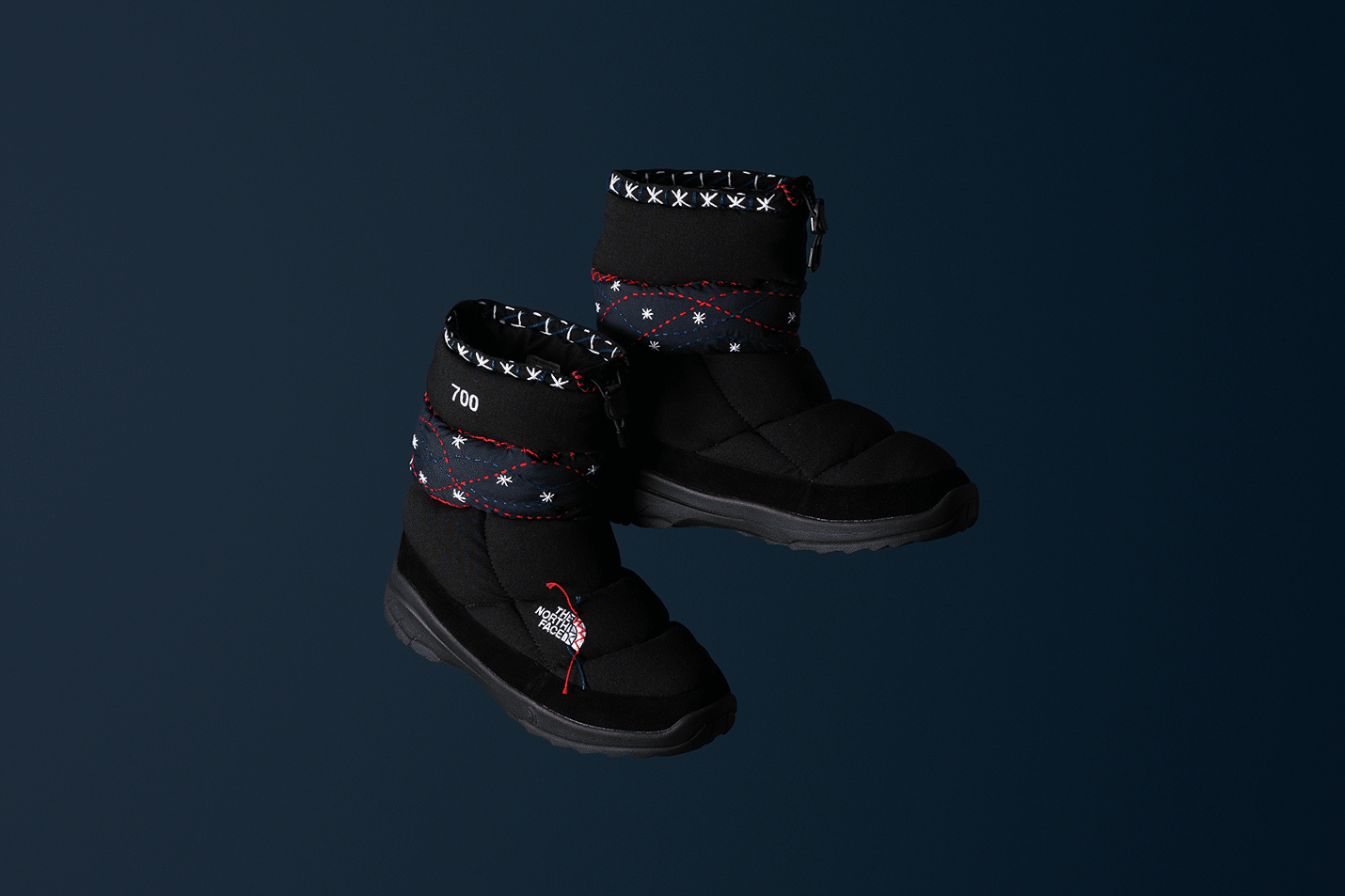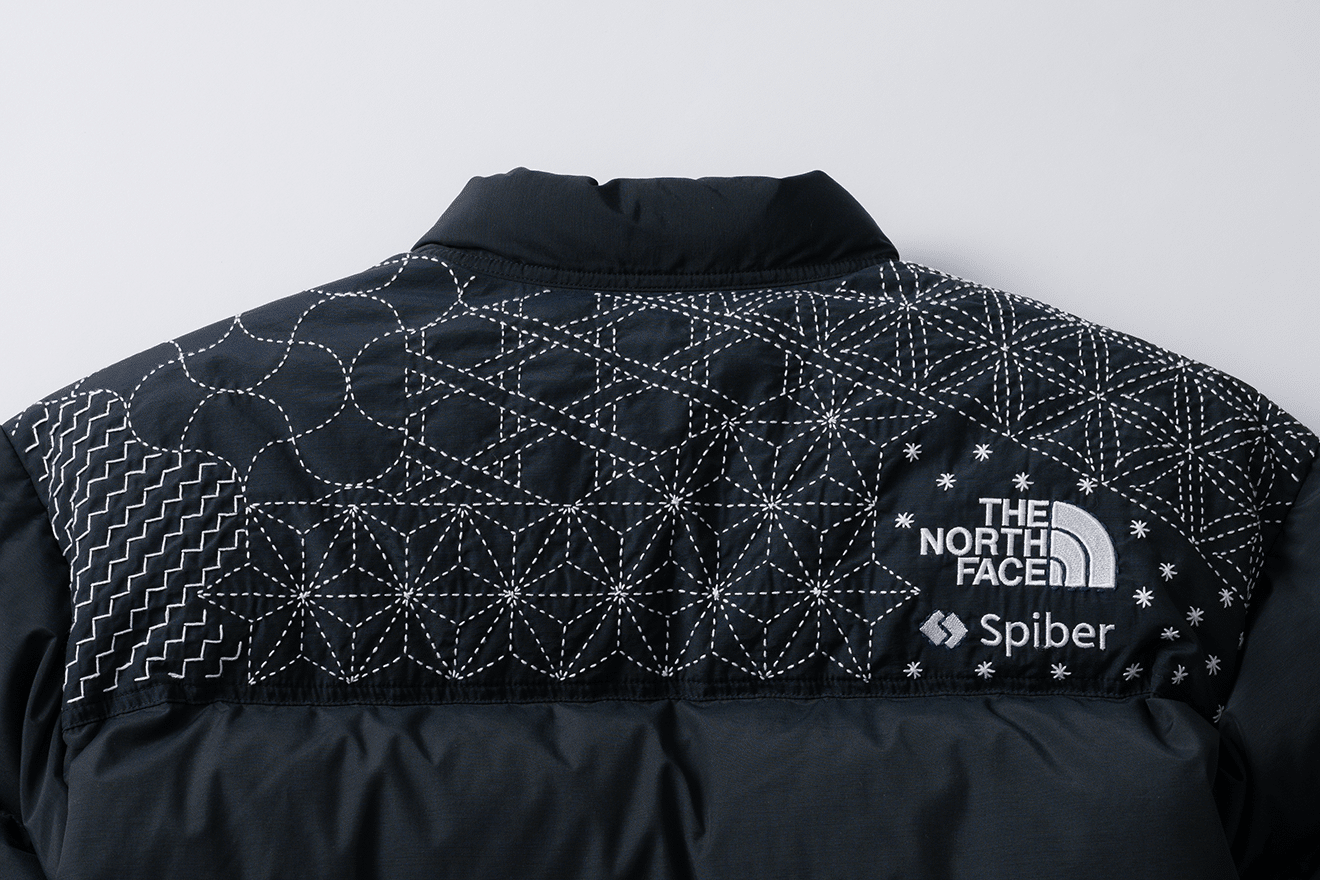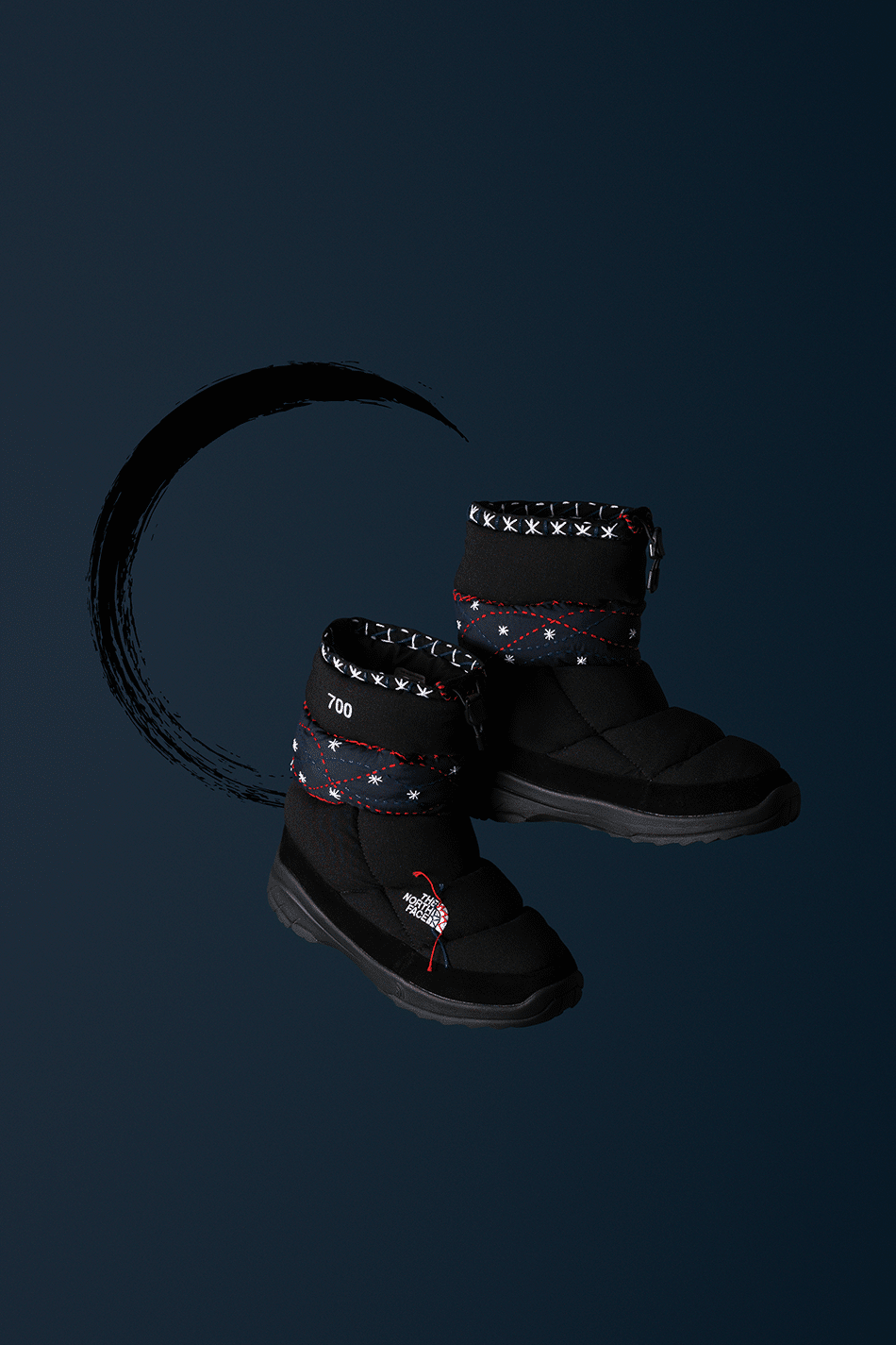 サシコギャルズと『THE NORTH FACE』のコラボレーションによって形になった刺し子シリーズは、ダウンジャケットからTシャツ、ブーツまで全5型を展開。卓越した職人技から生まれるいわば一点もので、その価値を感じながら愛着を持って長く使い続けられる商品です。デザインだけでなく、着心地ももちろん抜群。いずれも『THE NORTH FACE』の定番アイテムがベースになっているので高い実用性を備えています。その目玉となるのは、1992年に登山用として登場し、今では街着としても人気の高いヌプシジャケットを、江戸時代の庶民の防寒着のはんてん風にアレンジした一着。はんてんの特徴であるゆったりとした肩まわりやジップレスのフロントを取り入れつつ、ヌプシジャケットらしい高い保温性も継承しています。肩のダウンパネルは丈夫な厚手生地に切り替え、デザイン性と補強の役割を兼ねた刺し子を施しました。日本の伝統文化の趣とアウトドア由来の実用性を両立させた傑作品です。