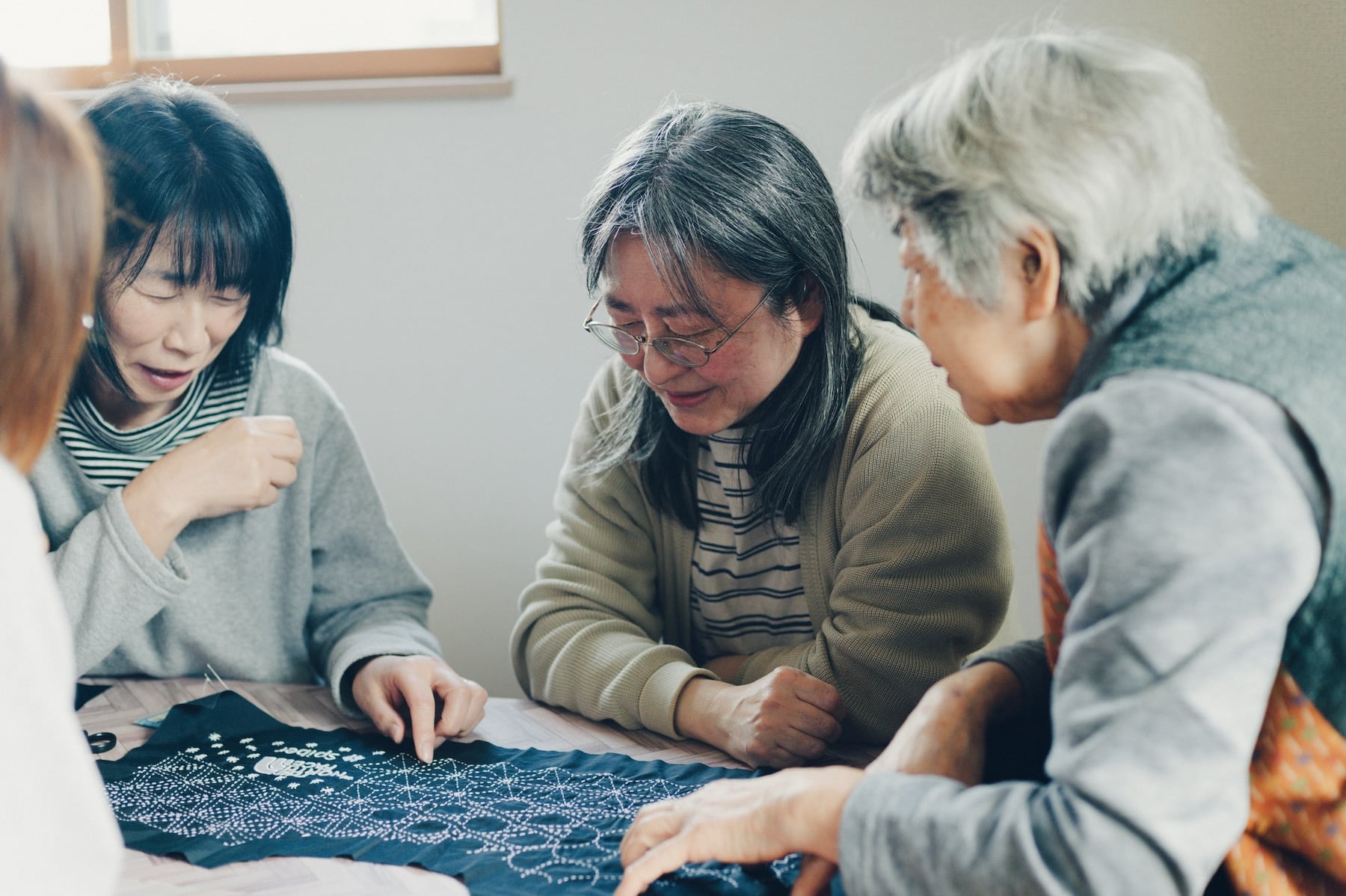 「刺し子さんたちは40代から80代と幅広く、技術講習や打ち合わせで集まると本当に賑やかなんです。休憩時間には持ち寄ったお菓子を囲んでおしゃべりが止まらない。その様子を見た藤原さんが、放課後の女子高生みたいだと言って名づけました。最初はギャルという言葉に抵抗はありましたが、今はぴったりだと思っています(笑)」