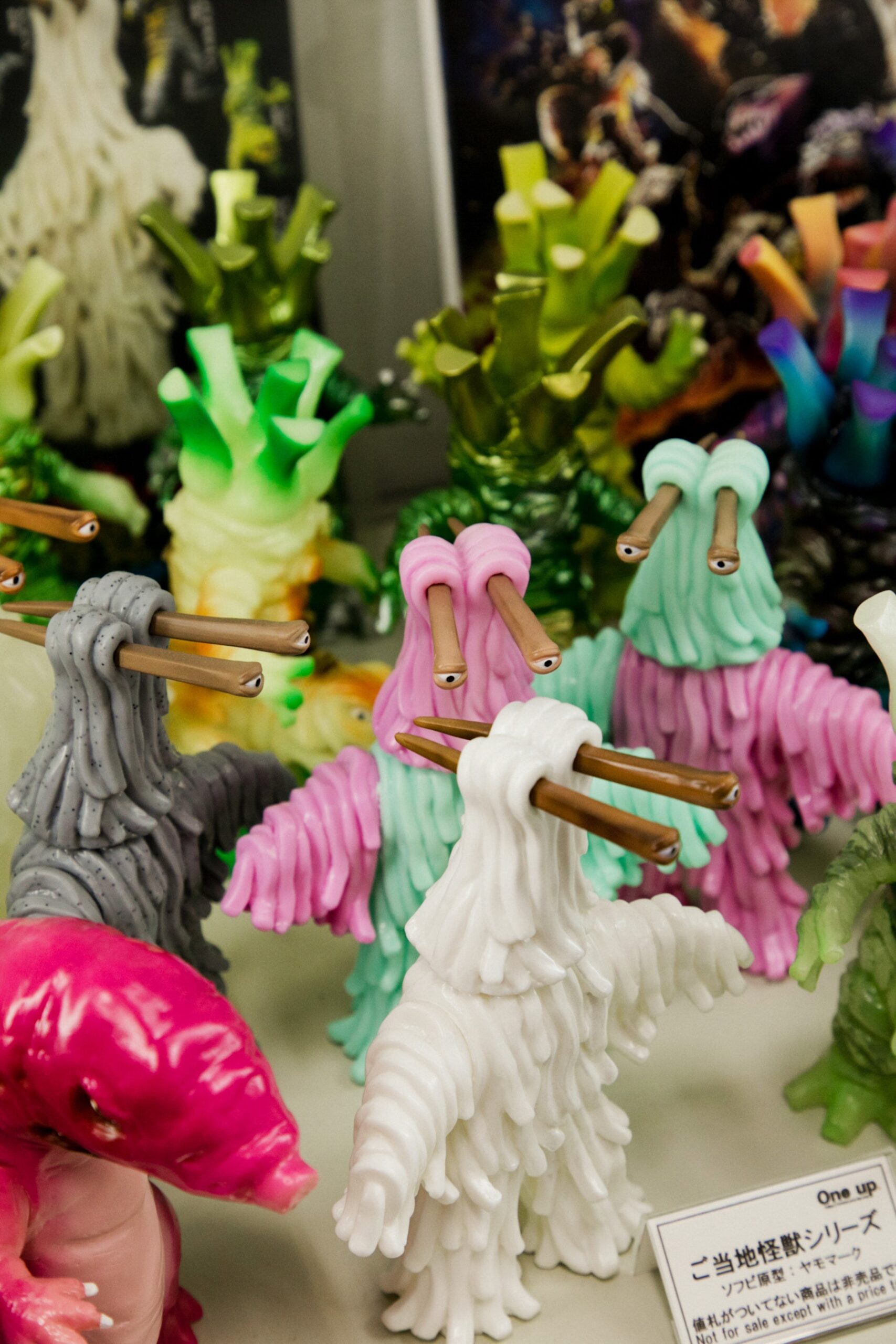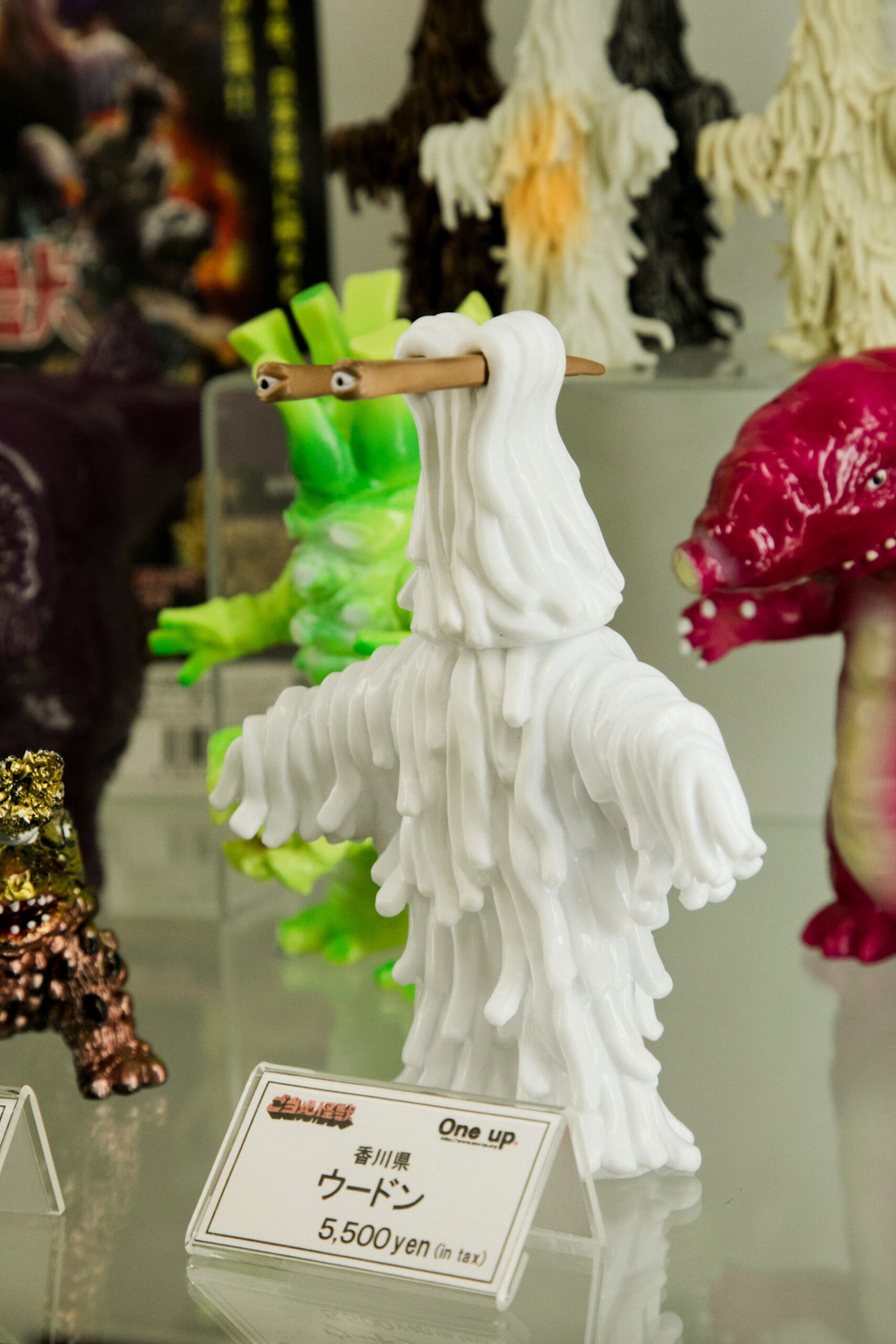 『One up.』が販売するオリジナルソフビの中でもオリジナル怪獣は人気のジャンルで、これを求めて来るファンも多いのだとか。中でも地方の名産、納豆やうどん、わさびなどとコラボした「ご当地怪獣」というシリーズが人気を博していて、海外のファンにも大人気! さらに、YouTuberやイラストレーター作家等のクリエイターとのコラボアイテムも充実しています。