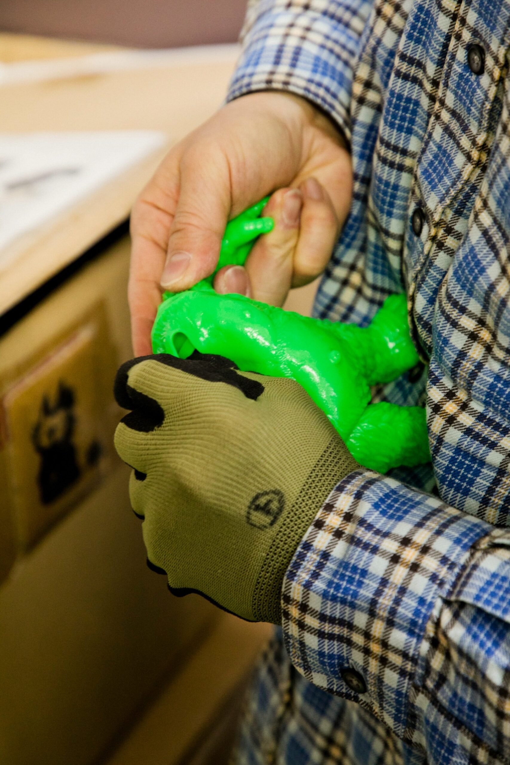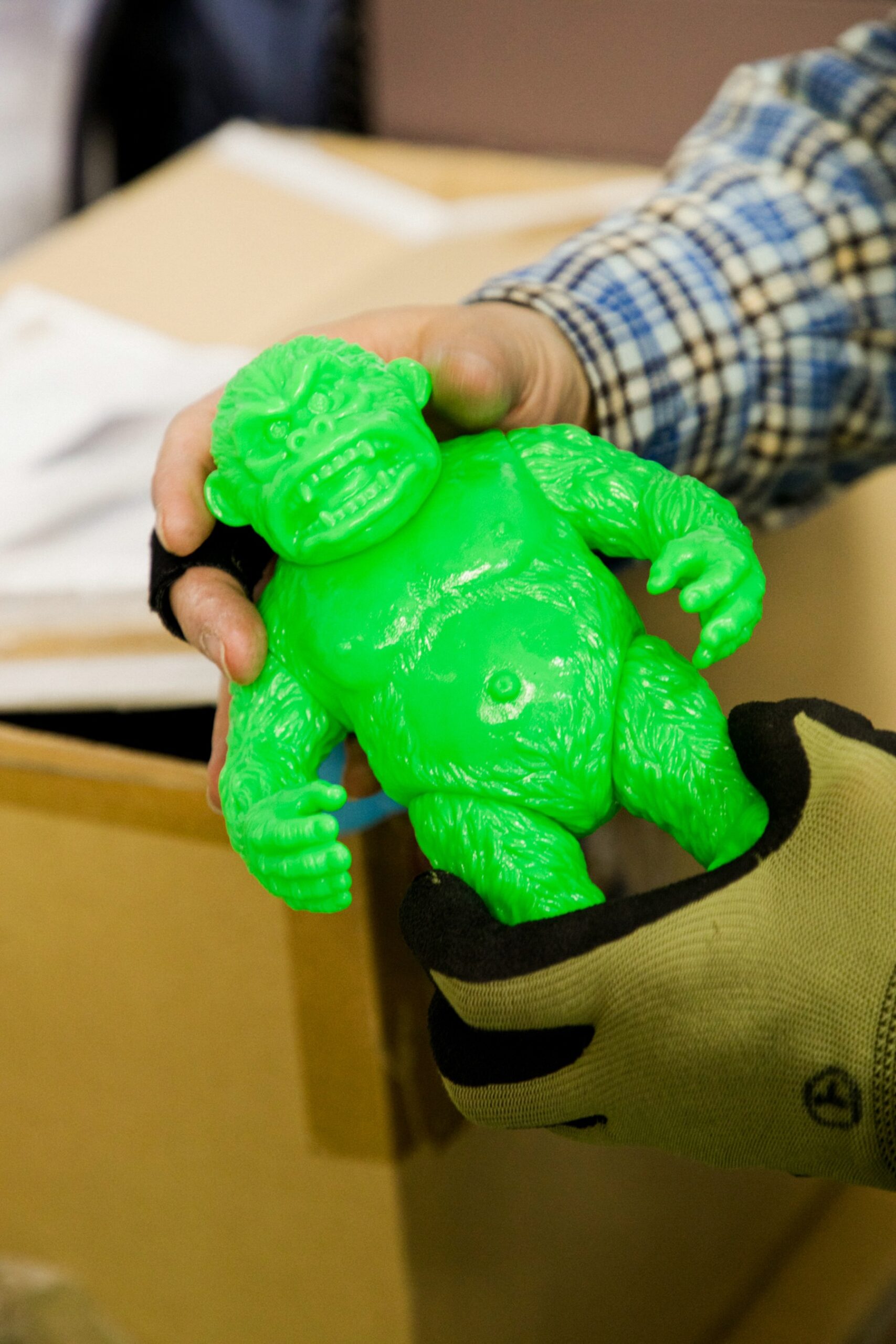 『One up.』では一部のソフビを店内で組み立て、販売しています。通常は工場で行う工程ですが、ここではパーツを直接取り寄せ、スタッフがひとつひとつ丁寧に組み立てを行なっています。ヒーターで部品を温め、柔らかくしてから組み立てるため、見た目以上にコツが必要です。