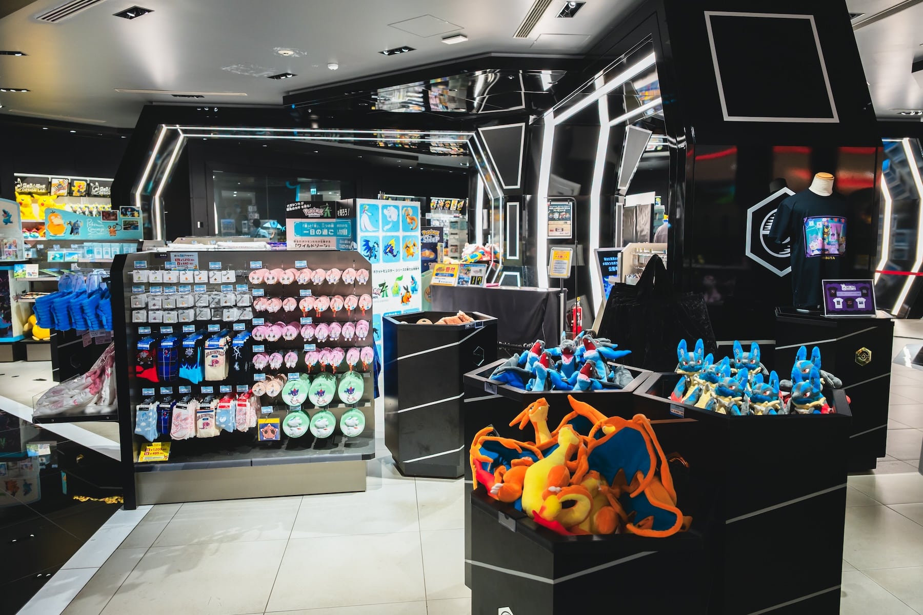 ホワイトやカジュアルなデザインを中心とした従来のポケモンセンターとは異なり、ブラックを基調とした空間にサイバーチックな照明をあしらった、クールでスタイリッシュな空間で、最新鋭技術と調和した新たな「ポケモン」空間を目指したそう。