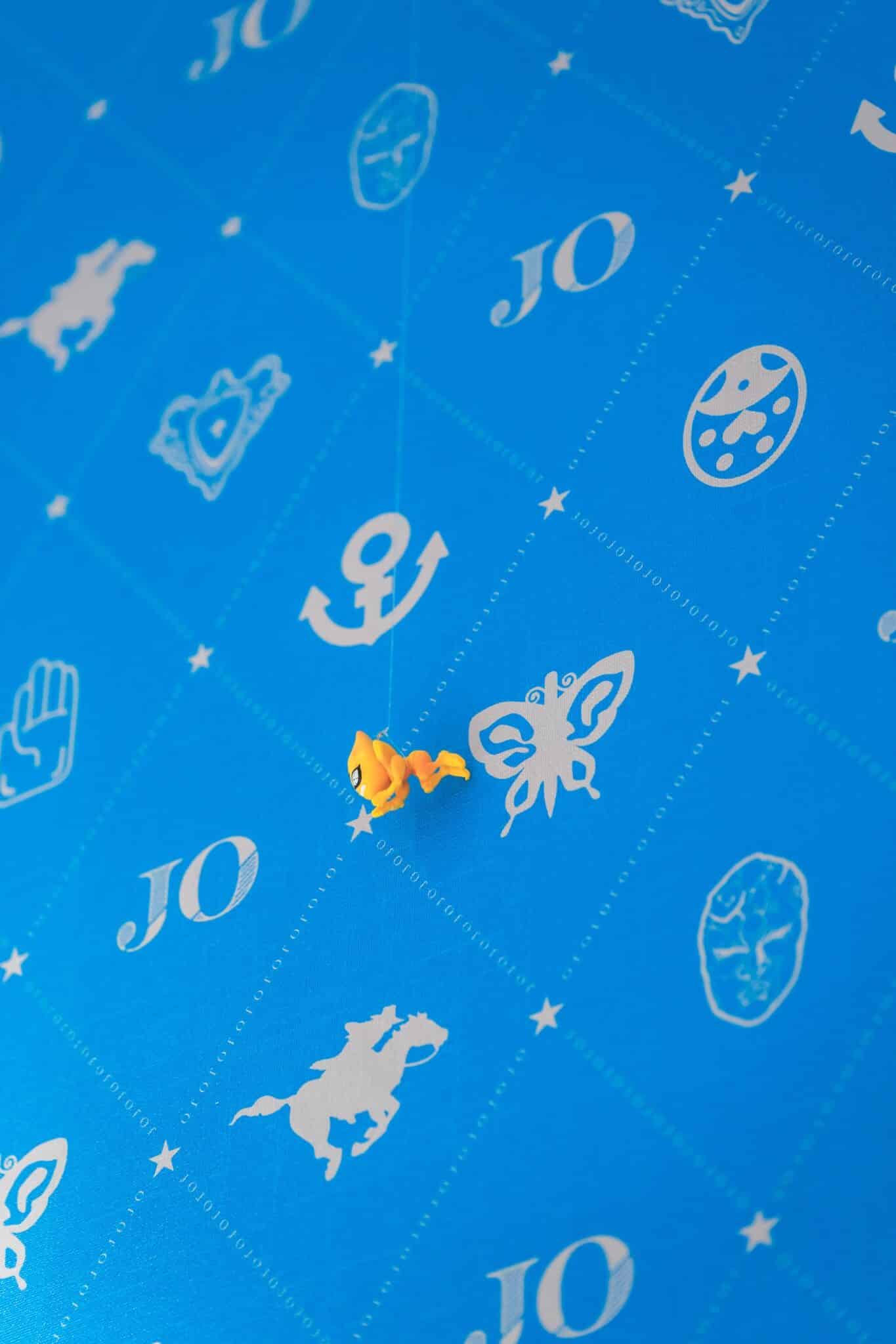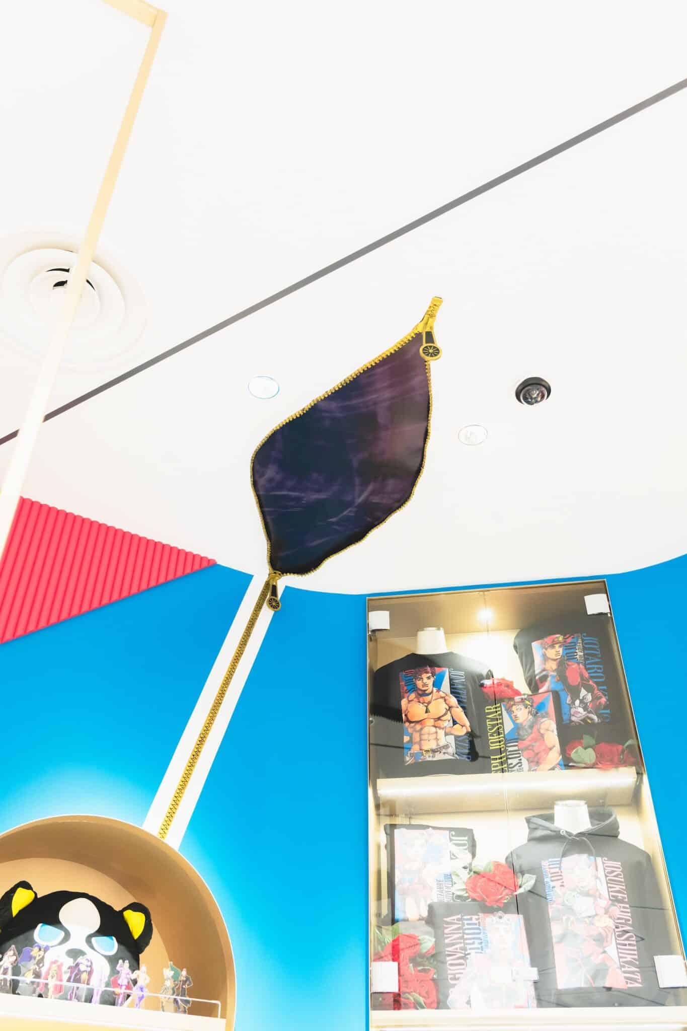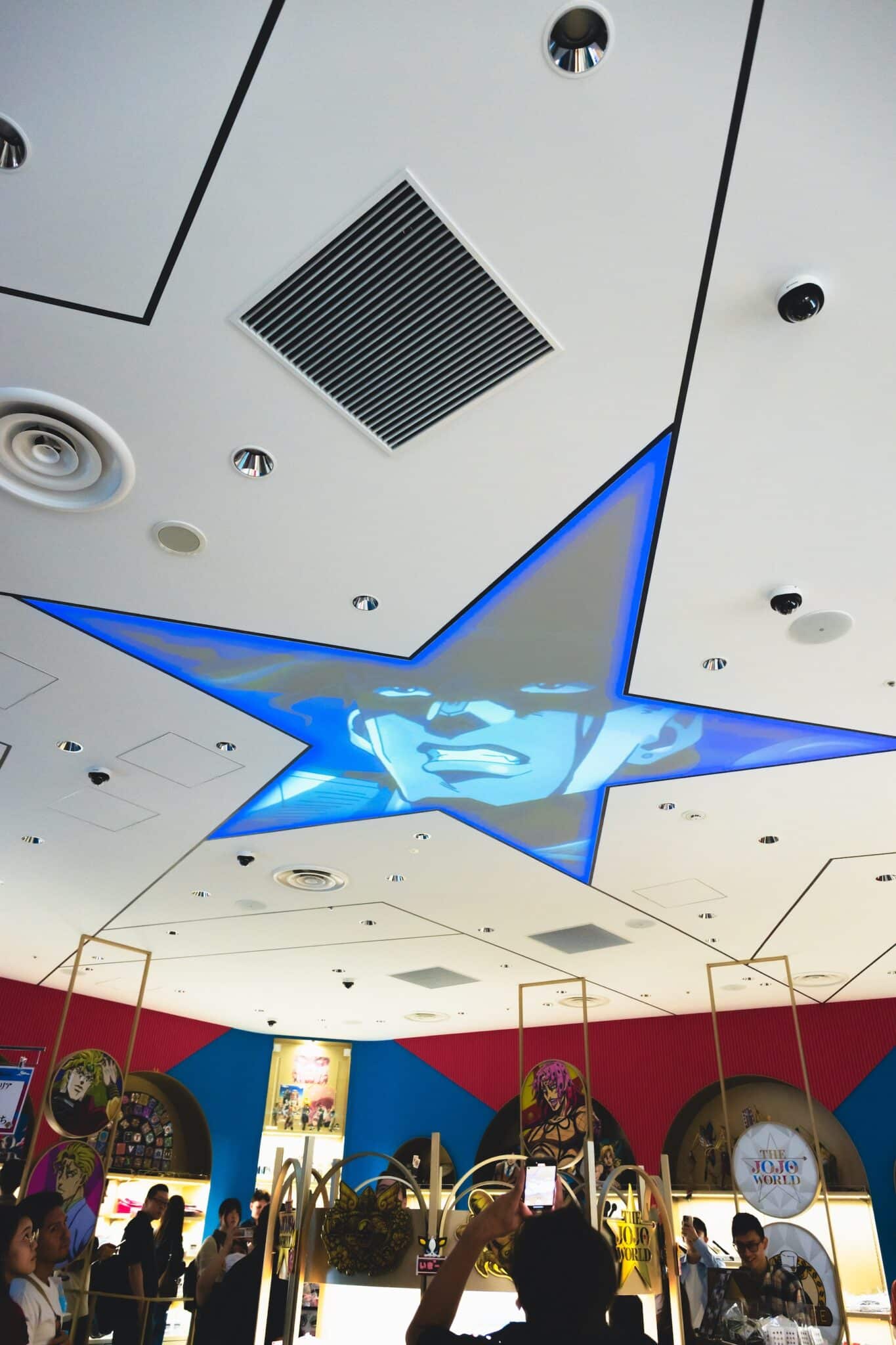 『THE★JOJO WORLD』には、店内の上下左右全方位に “ジョジョ”の世界を体感できる仕掛けが。作品ゆかりのアイテムがレイアウトされていたり、頭上や棚の隅にスタンドが隠れているほか、天井にはちょっとした工夫をすることで実態が見られるフォトスポットがあるなど、一度では網羅できないほどの数があります。さらにタイミングが合えば、天井に流れる映像演出を体験することも。時間はランダムなので、見られた人はラッキーです。