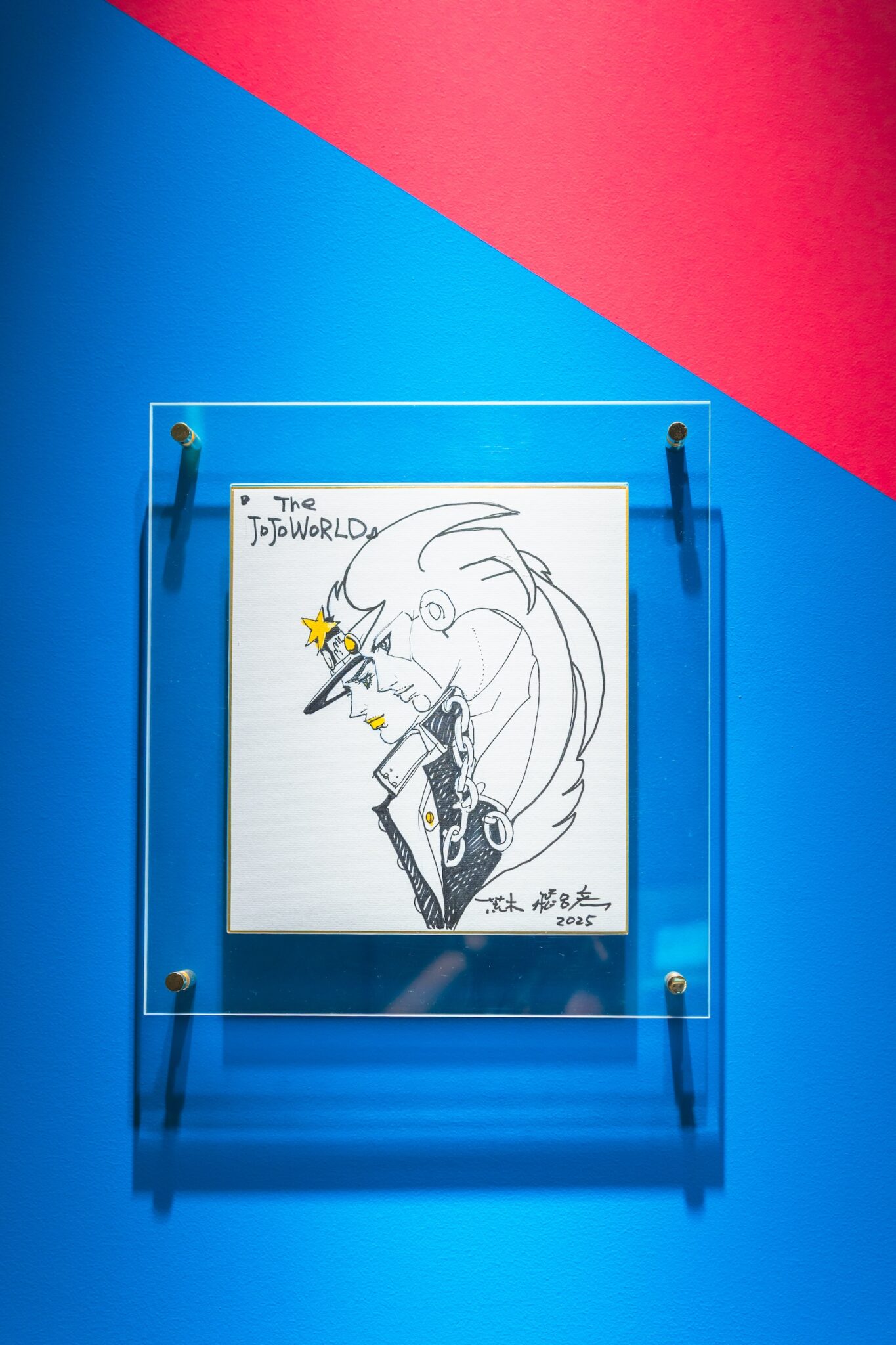 店づくりにあたっては、作者の荒木飛呂彦先生も力が入っていたといいます。歴代主人公が一堂に会したイラストを初めて描き下ろしたほか、店舗のテーマカラーであるピンク×ブルーは、荒木先生が「ここぞという時に使う必殺の色づかい」なのだそう。