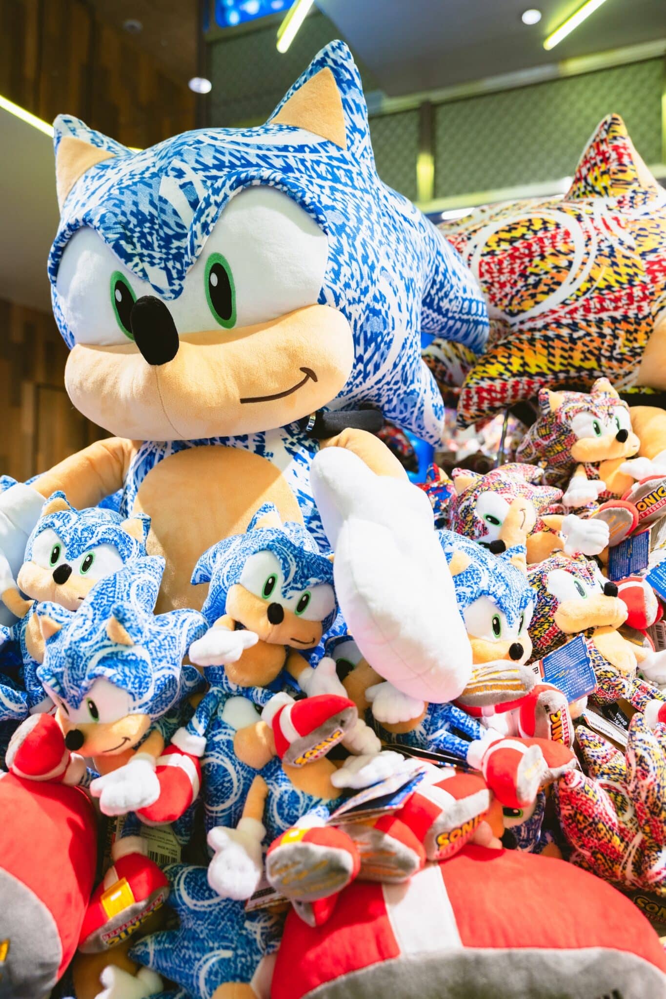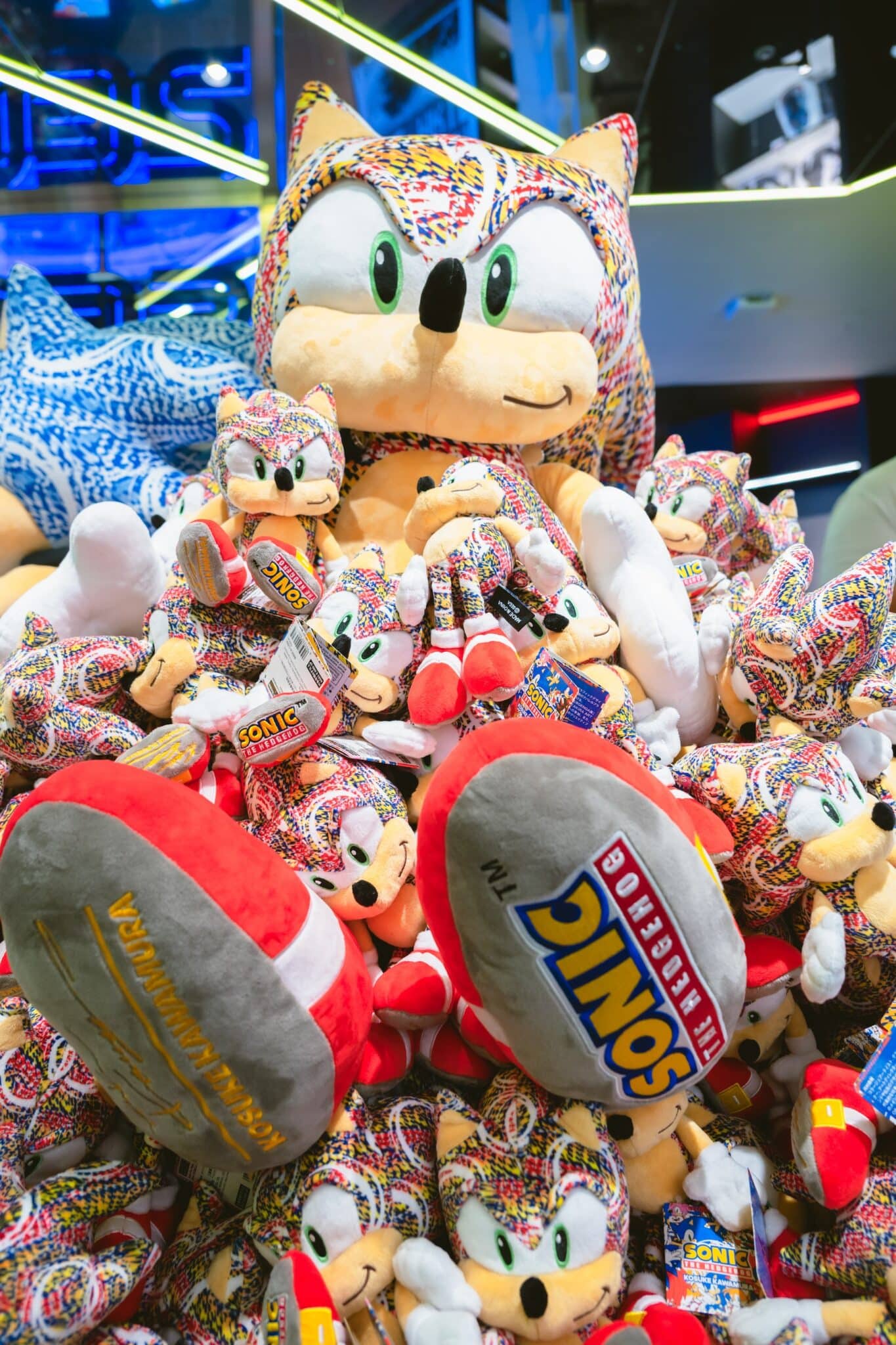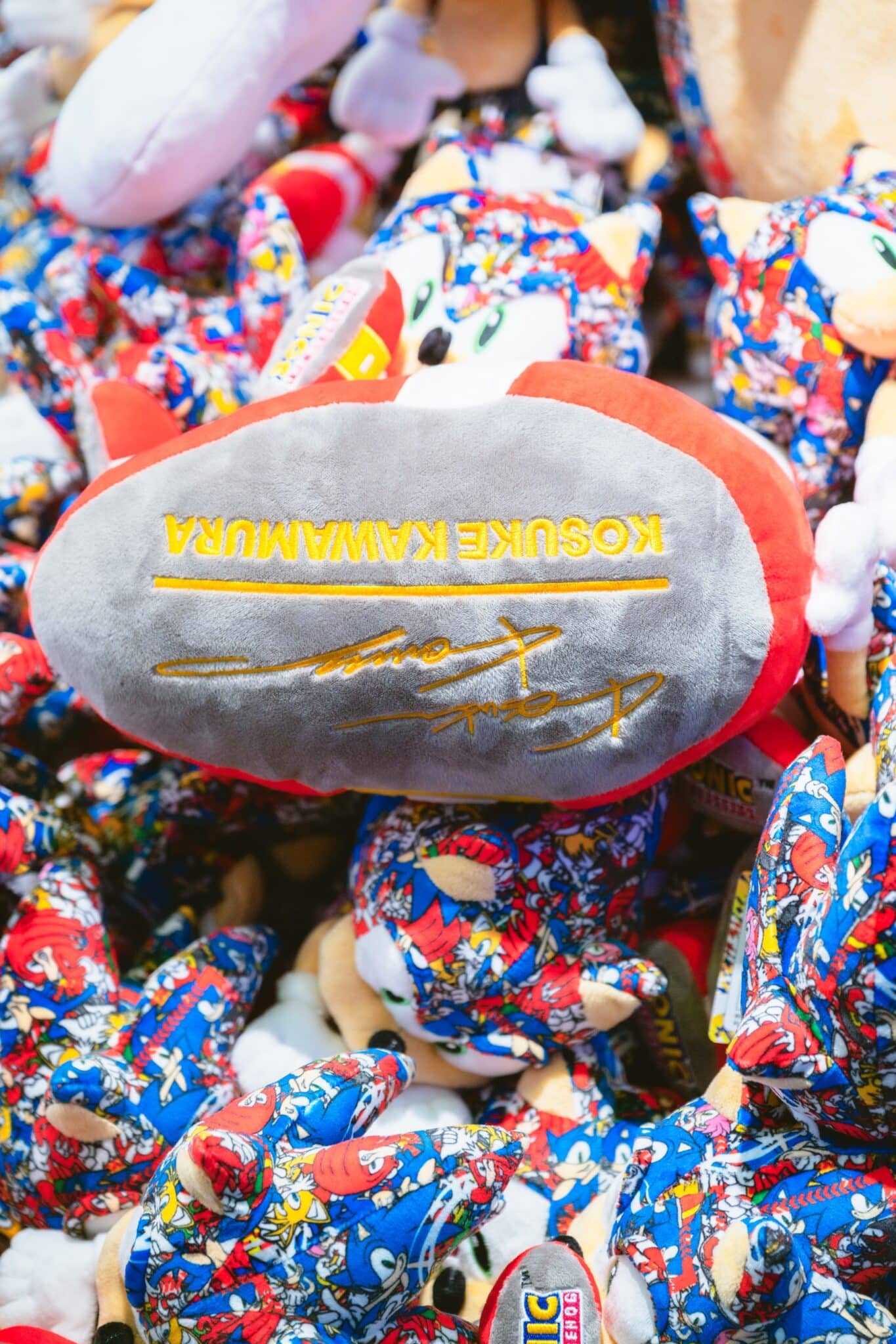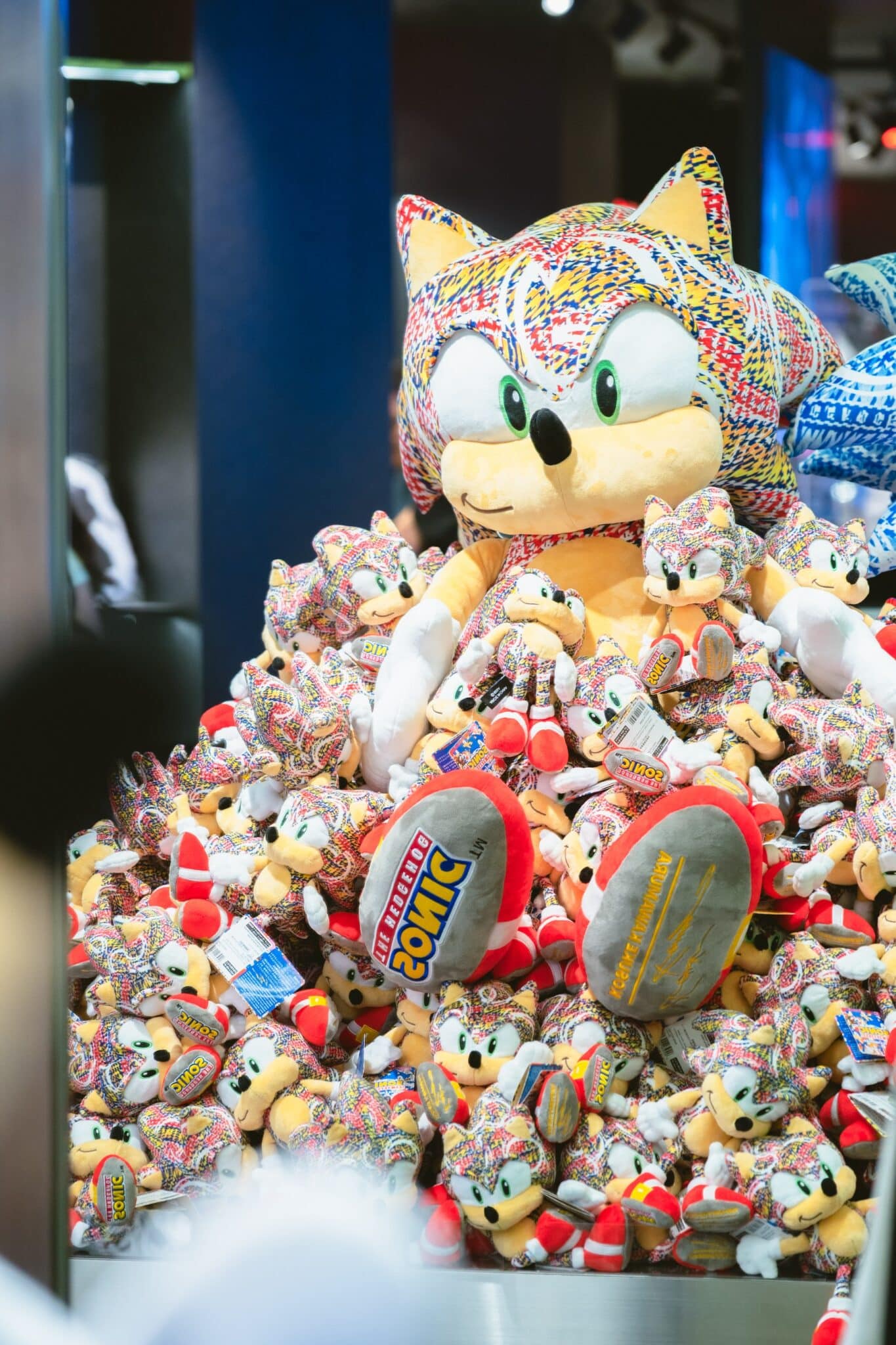 コラージュアーティストの河村康輔氏がデザインした「ソニック・ザ・ヘッジホッグ」のぬいぐるみ。