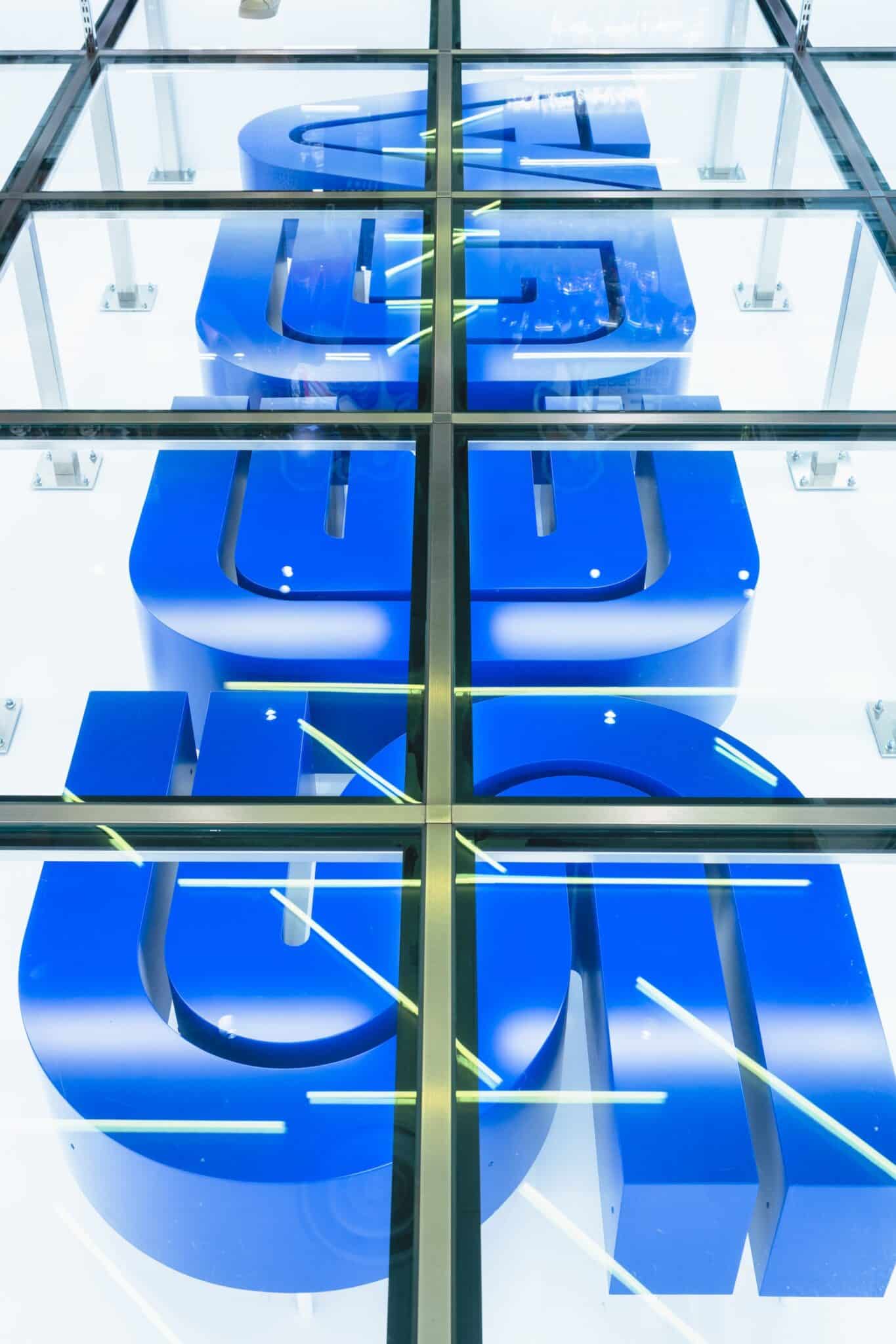 足元を見ると、ガラス張りの床下には巨大なロゴが。こちらもフォトスポットとして親しまれており、取材時も、海外から訪れたお客さまがタイミングを見計らって記念撮影していました。