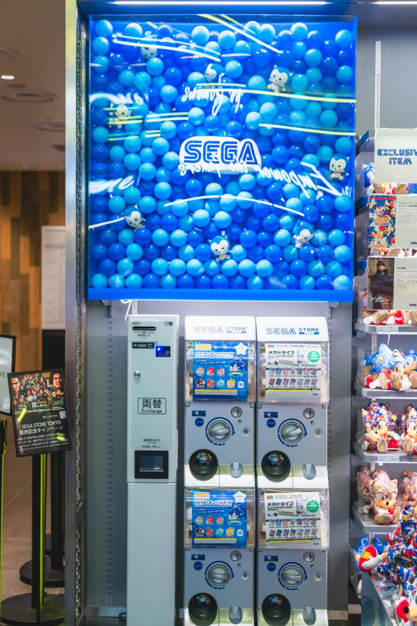 巨大なカプセルトイマシンを想起させる壁面ディスプレイにも注目。よーく見ると、上段にはころんとしたデザインのソニックが。下段には、実際に購入できるカプセルマシンが設置されています。中身は90年代のゲームカセットがデザインされたキーホルダーや主力IPのカプセルトイです。