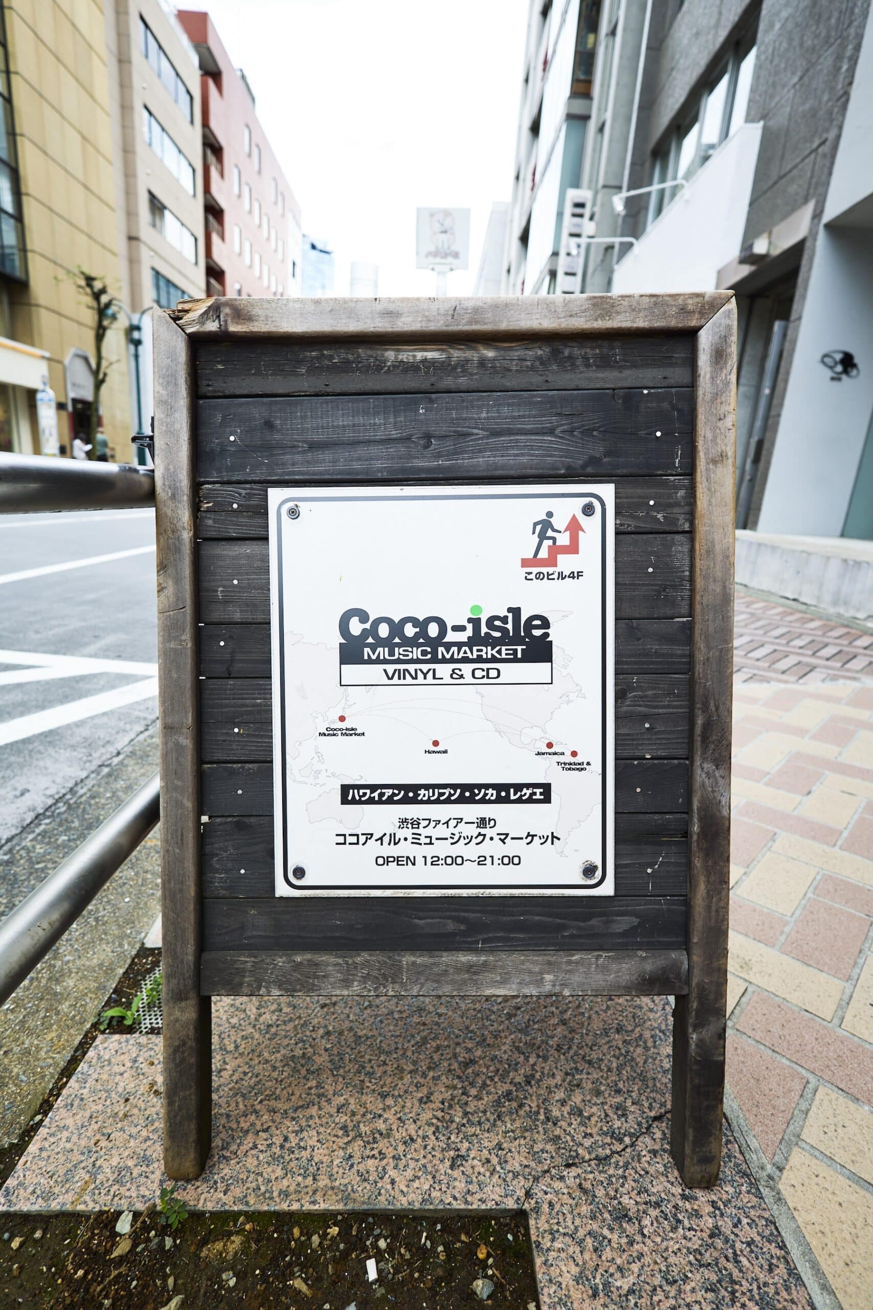 『Coco-isle Music Market』はファイヤー通り沿いのビルにあります。こちらの看板が目印です。