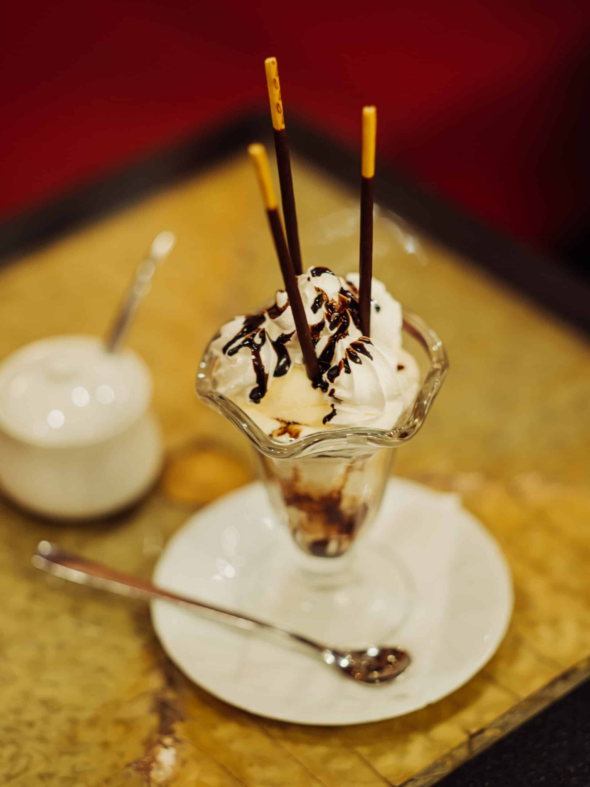バニラアイス、生クリーム、チョコレートソースがたっぷり盛り付けられた、昔から変わらないクラシックな見た目。添えられた「ポッキー」が嬉しい。チョコレートパフェ 1,000円