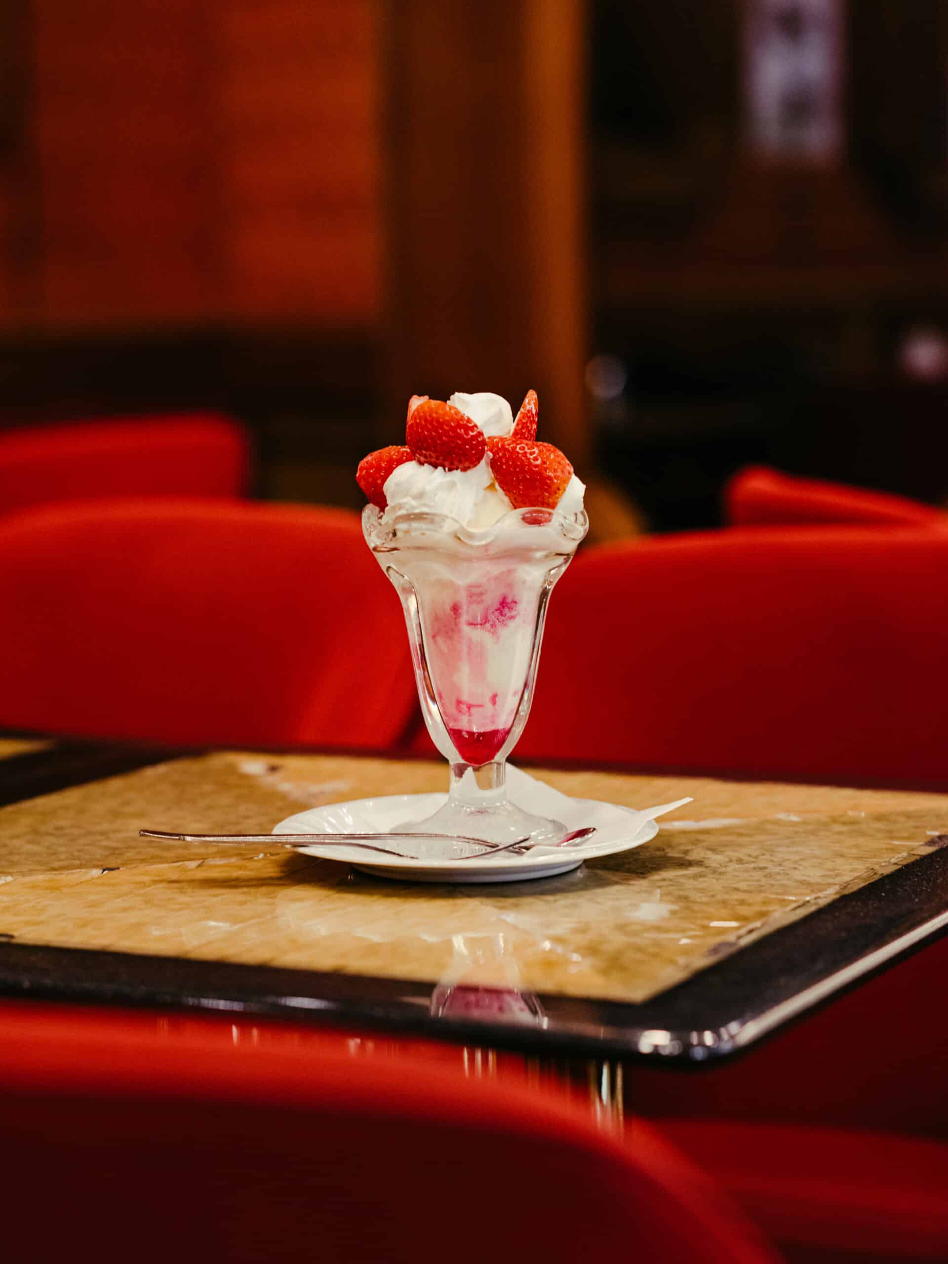 創業61年目を迎える老舗喫茶『ローヤル』は、大理石の床にシャンデリア、ベロア調の赤いソファにステンドグラス……と、重厚で気品あるレトロなインテリアが魅力。人気メニューは創業当時からずっと愛され続ける、クラシックな佇まいのパフェ。