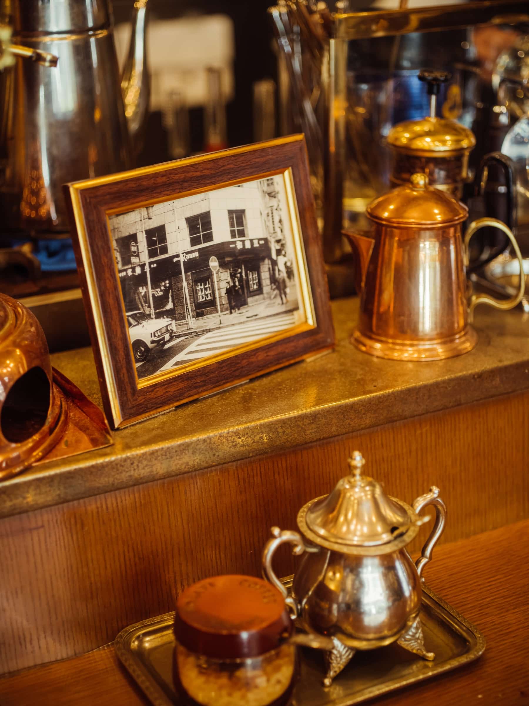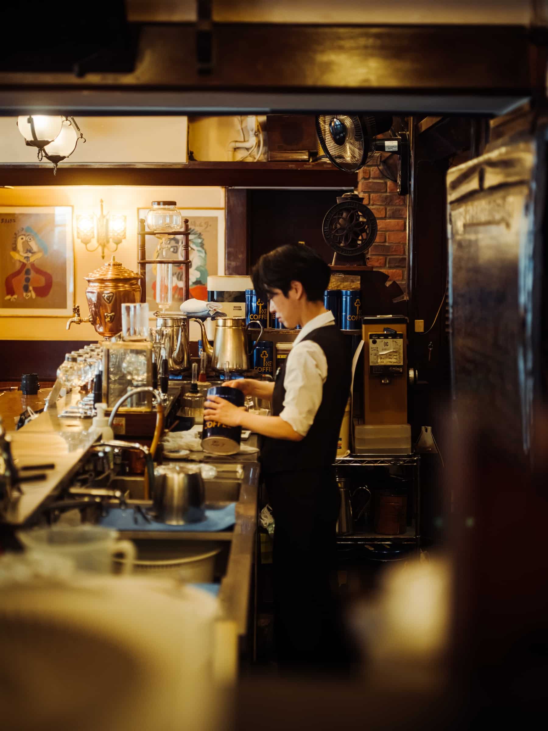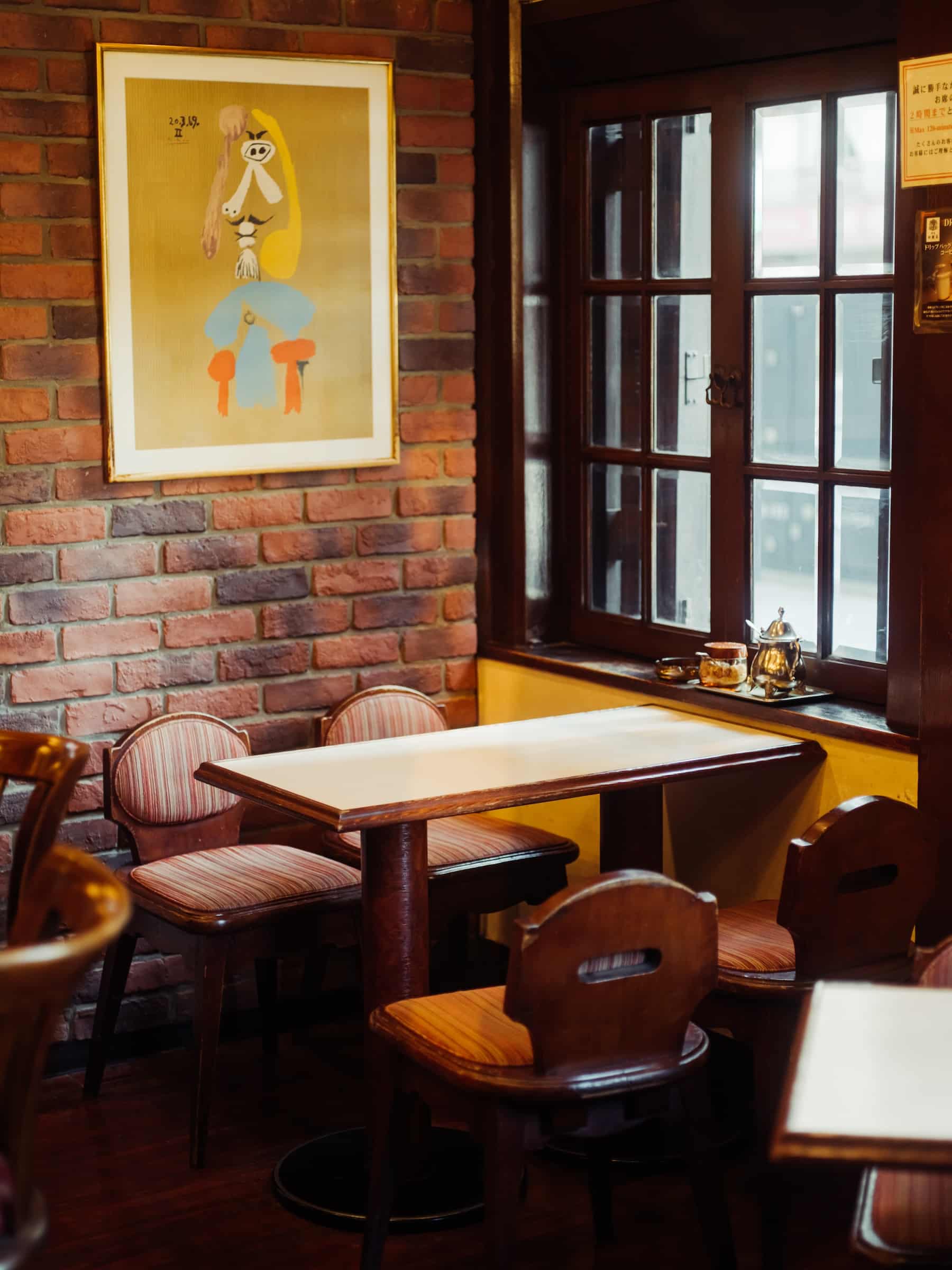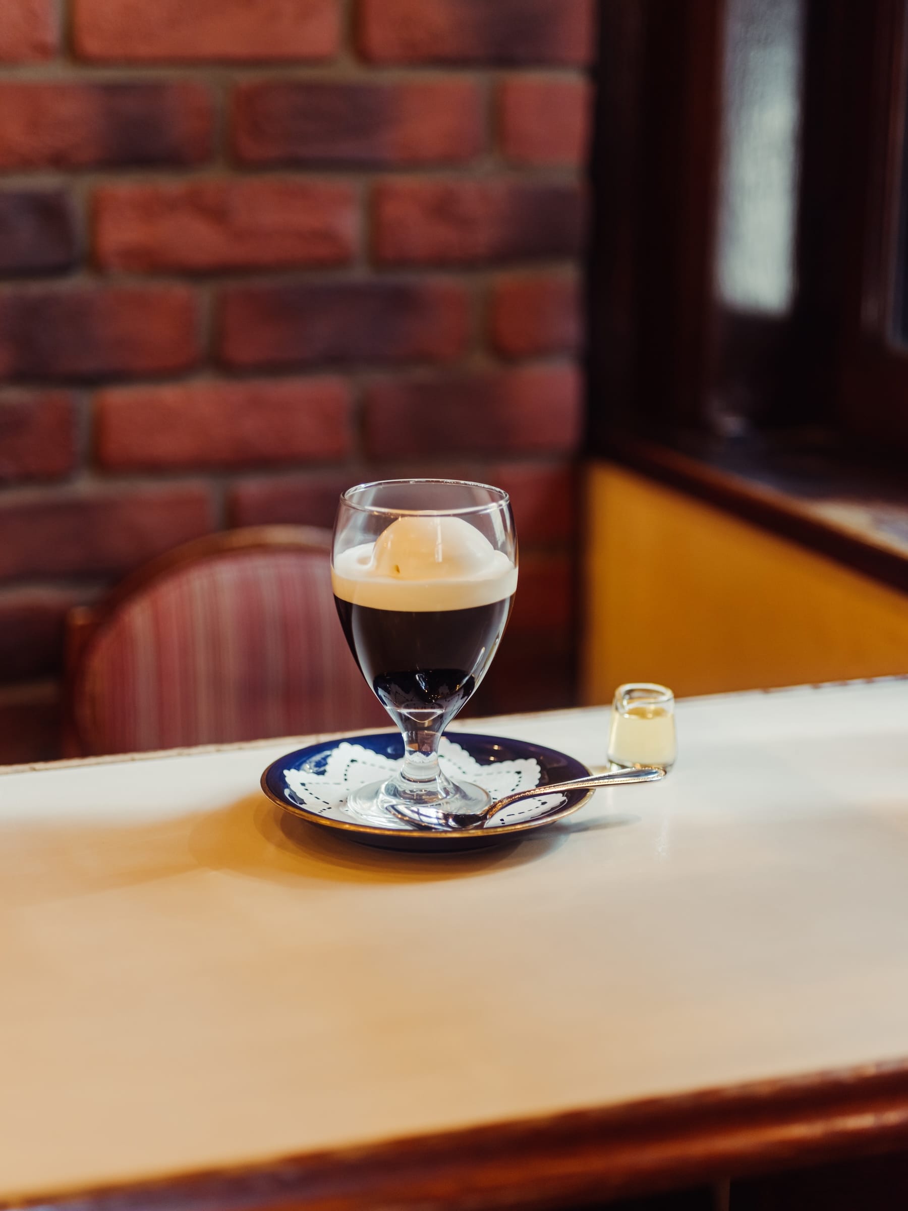 重厚な木製のカウンター、あえて梁を見せた天井、温かみのある照明、壁に飾られたピカソの絵──と、クラシカルな内装はほぼ昭和47年当時のまま。創業者の美的センスが息づいています。特徴的なのが、通りに面した大きな窓。低めの椅子に腰かければ、目の前に銀座の街角が広がり、昼と夜で変化する表情を楽しめます。全席喫煙で、今もなお紙のコーヒーチケットが現役。常連がふらりと訪れ一杯を楽しんでいく──そんな昔ながらの「銀座の風景」がここにはあります。