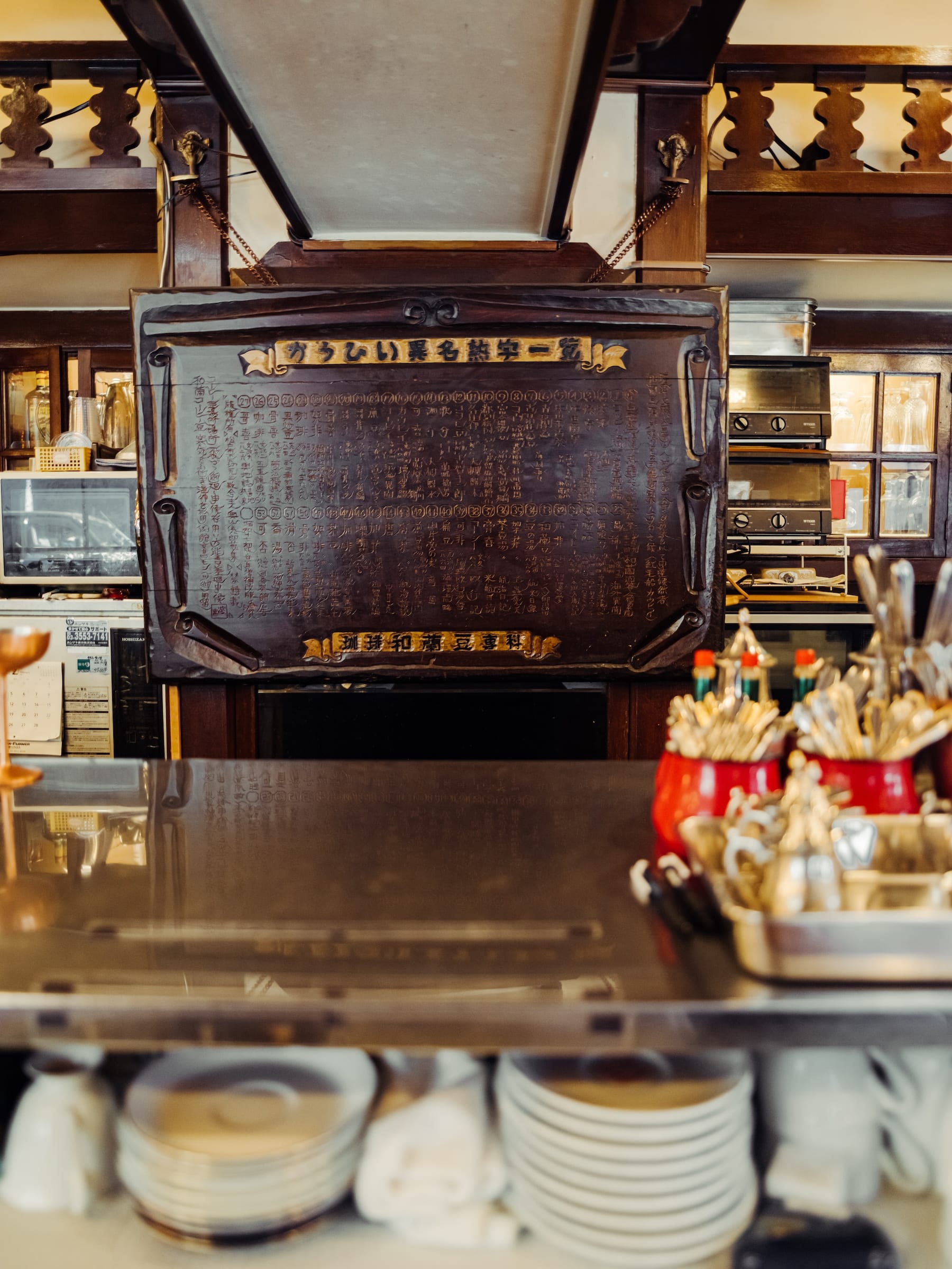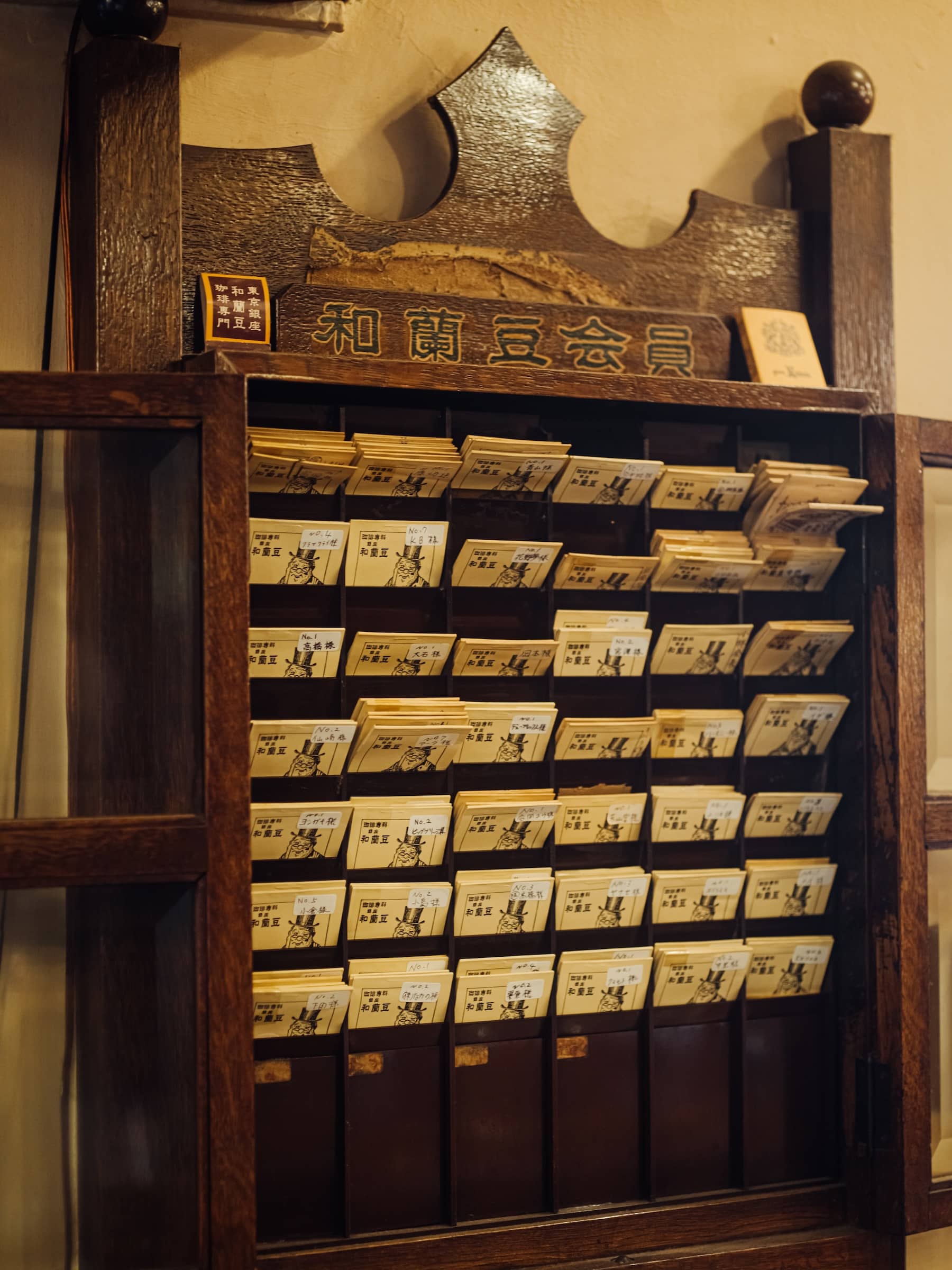 カウンターの奥には、木に彫られた「コーヒー異名熟字一覧」が。33番目に店名の「和蘭豆」があります。江戸時代にオランダから日本に伝わったコーヒー豆が「和蘭豆(オランダ豆)」と呼ばれていたことに由来するのだとか。