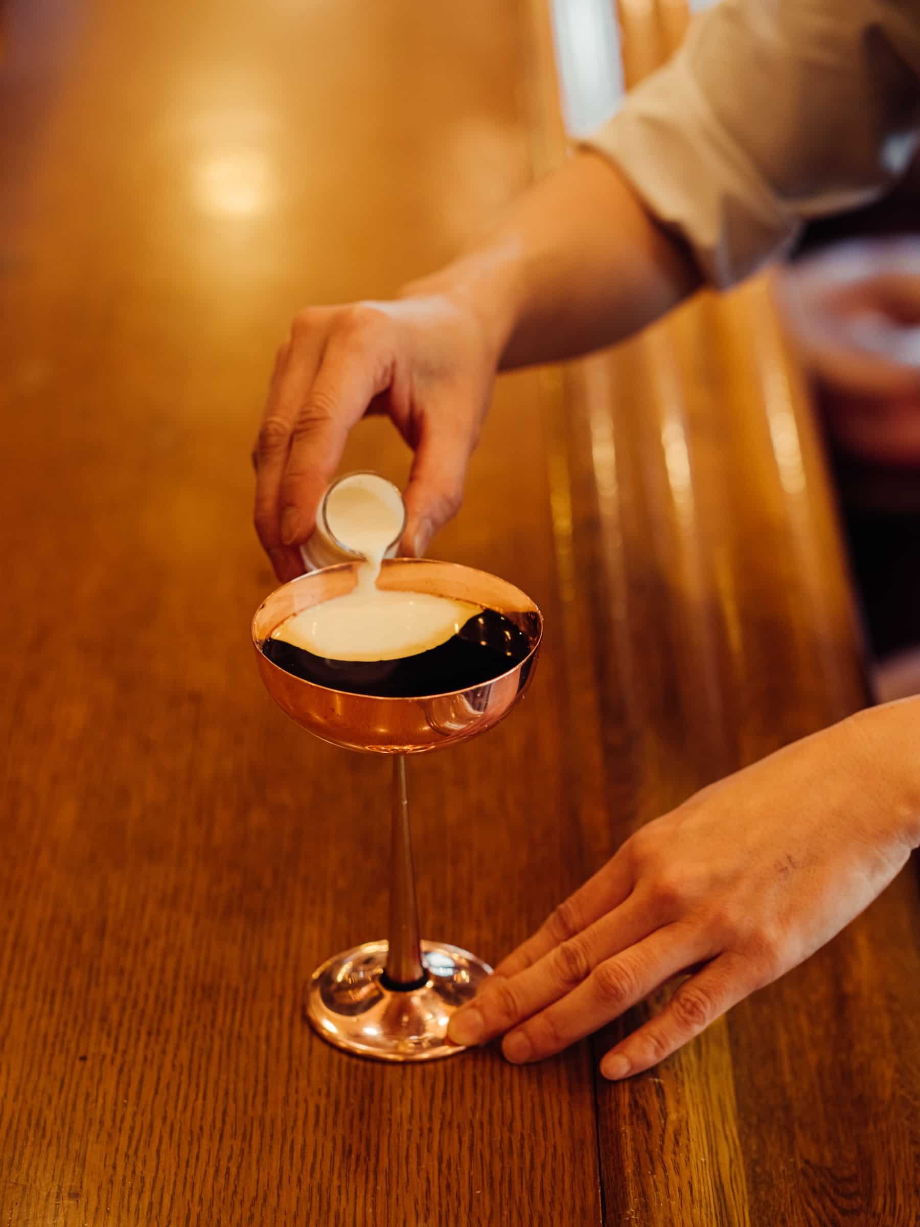 脚の長い銅シャンパンに入ったおしゃれな『アイスウインナー』。目の前でスタッフがミルクを注ぎ入れてくれるパフォーマンスも付加価値。950円