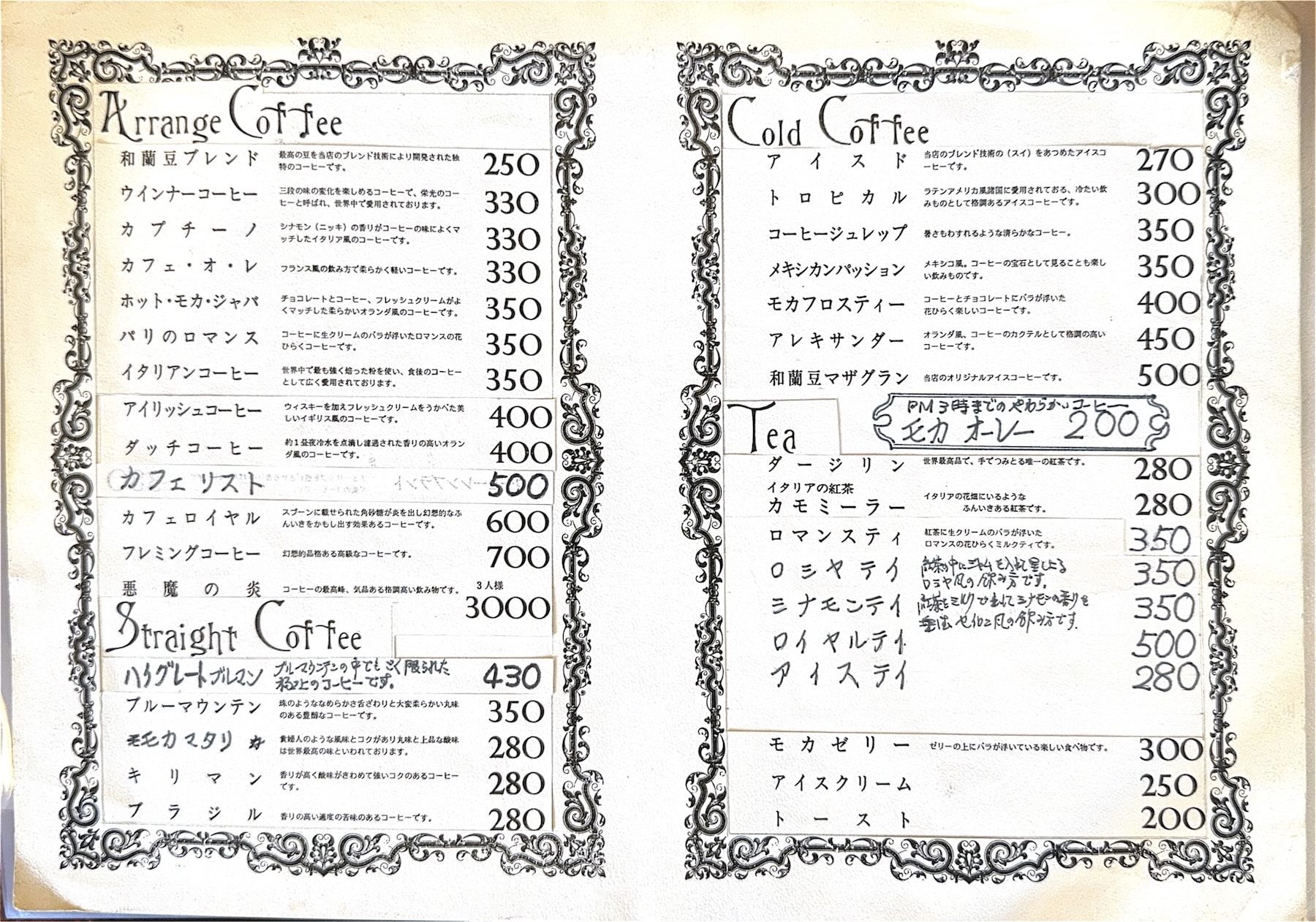 創業当時のメニュー表。「和蘭豆ブレンド」は、今も変わらぬ味。