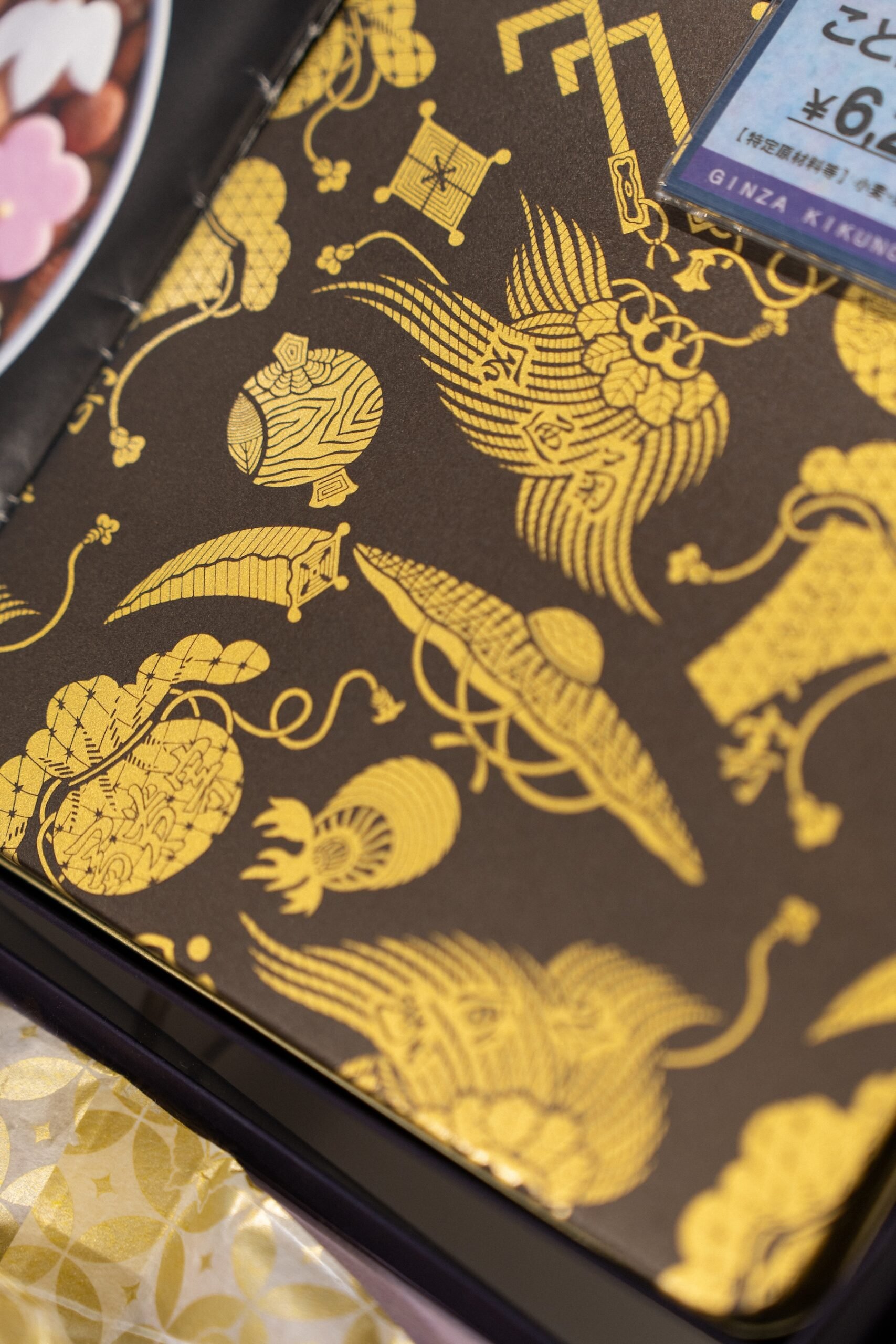 3代目から定着した冨貴寄の缶のデザインは、縁起の良い宝物を集めた吉祥文様「宝づくし」のデザイン。現在も柄は変わらず、色あいだけが季節ごとに変化します。