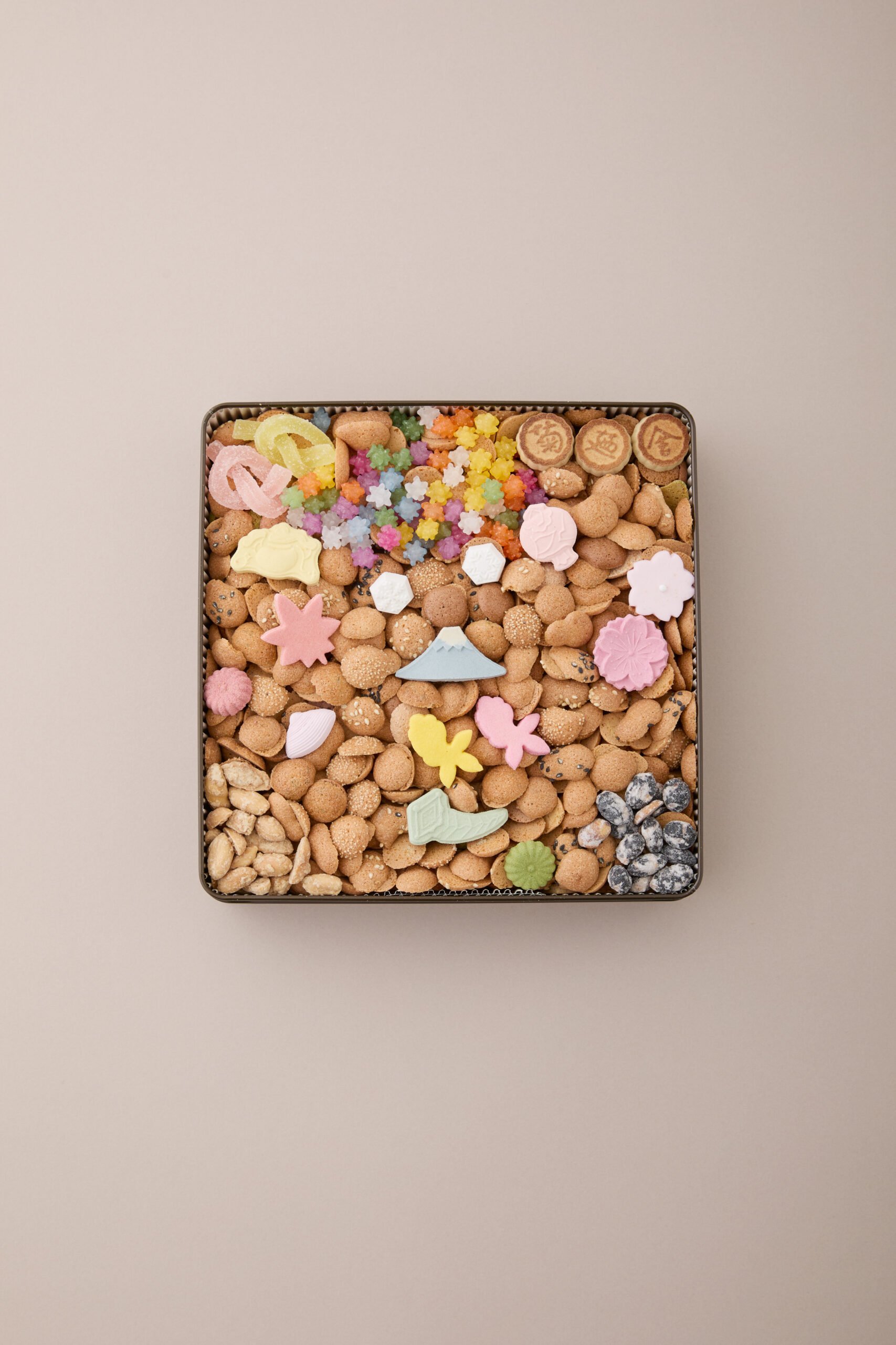 缶の底には、バターを使用せず小麦粉と砂糖と卵のみで作られた和風クッキーが敷き詰められており、その上に金平糖や和三盆、落雁、打ち物などの干菓子が20数種類以上詰まっています。富士山や四季を表現した日本らしいデザインのため、海外の友人への手土産にも人気なのだとか。店の創業135周年記念では、現代風にデザインした限定缶を販売するなど、時代に合わせた変化も取り入れています。
