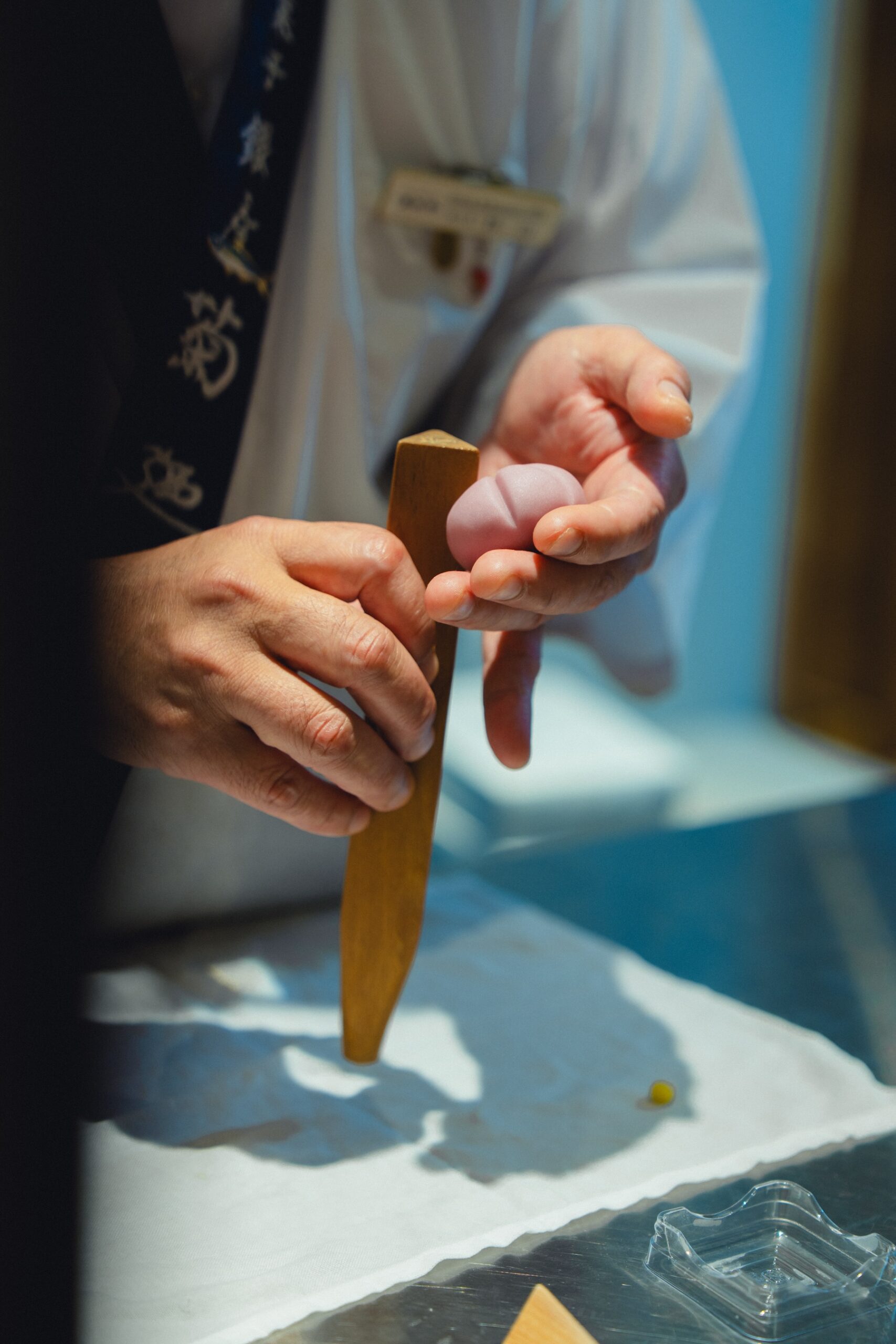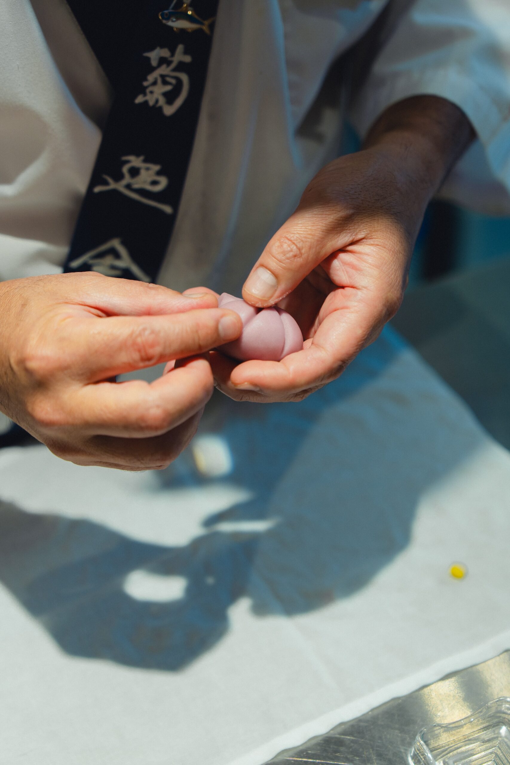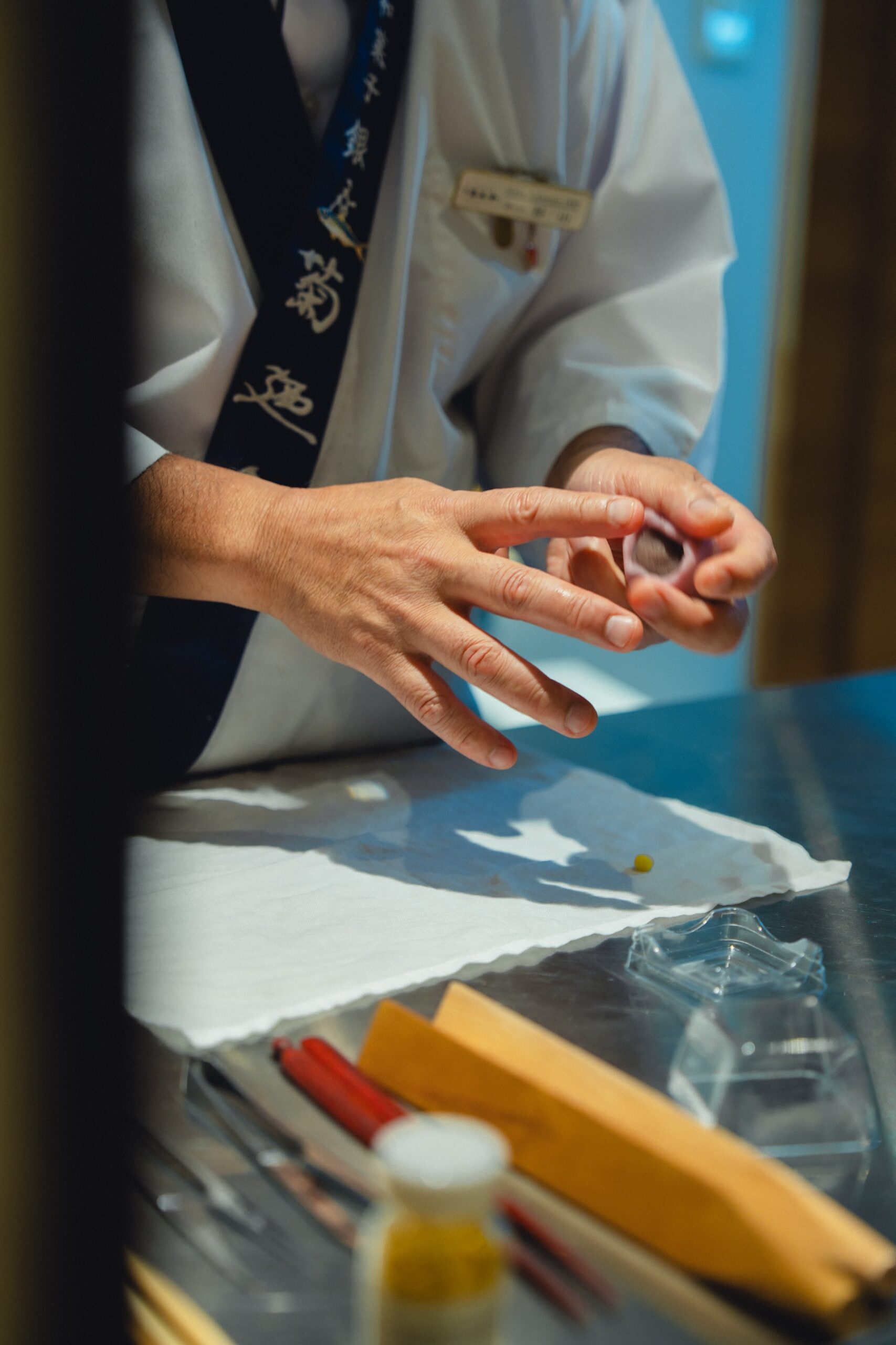 『銀座 菊廼舎 銀座本店』の店舗で販売する和菓子は、全て店内で手作りされています。職人は、この道40年の大ベテラン。今では数少ない、生粋の和菓子職人です。店内では、普段はなかなか見ることができない、職人による貴重な和菓子作りの様子を見ることができます。とりわけ職人技を感じられる練り切りは、季節によってモチーフが変わるため、何度見ても飽きがきません。秋にはハロウィンのお化け、クリスマスシーズンにはサンタクロースなど、和菓子の枠を超えた多彩なモチーフも登場し、職人の遊び心が伝わってきます。