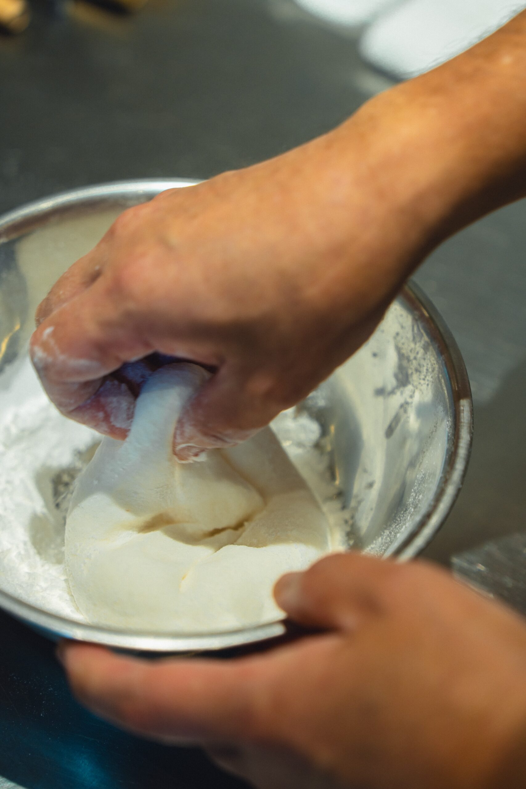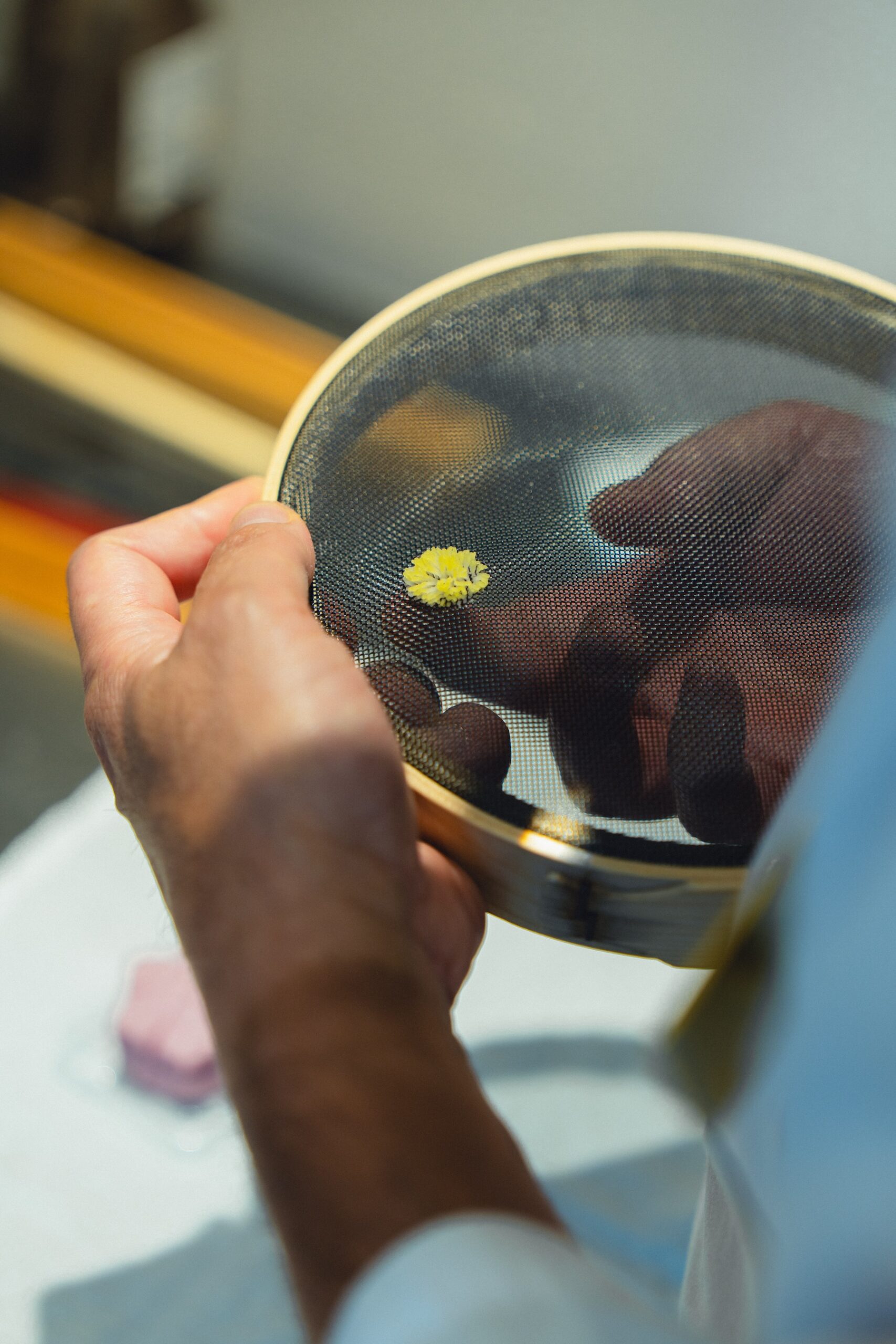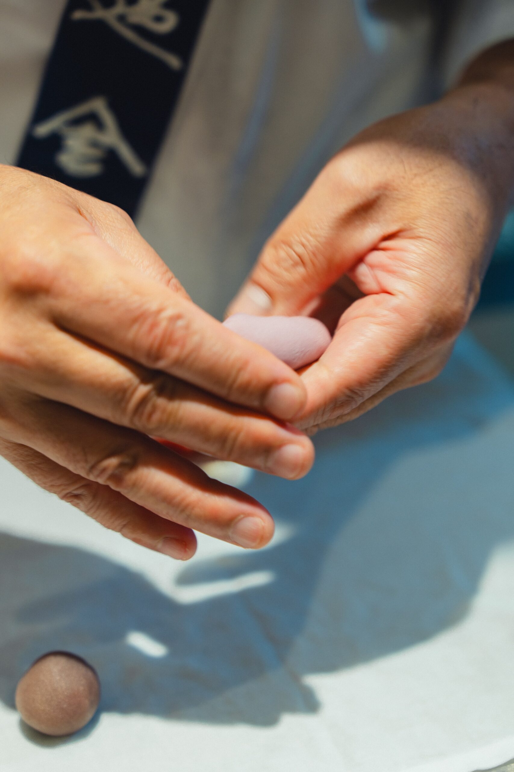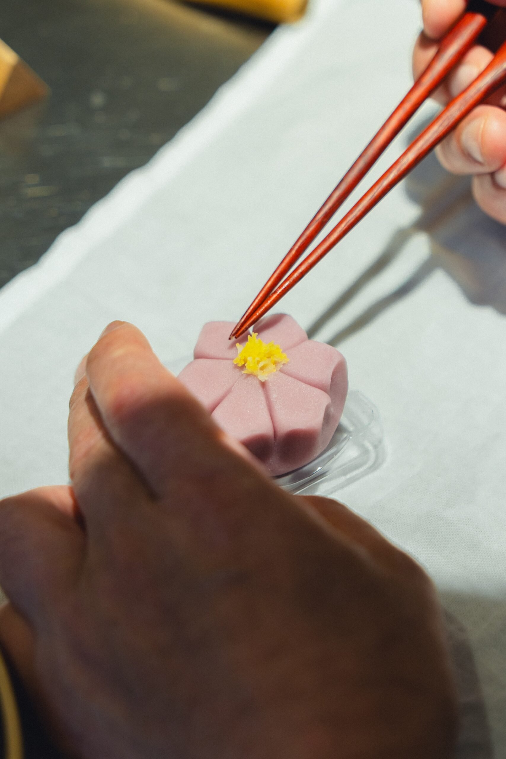 『銀座 菊廼舎 銀座本店』の店舗で販売する和菓子は、全て店内で手作りされています。職人は、この道40年の大ベテラン。今では数少ない、生粋の和菓子職人です。店内では、普段はなかなか見ることができない、職人による貴重な和菓子作りの様子を見ることができます。とりわけ職人技を感じられる練り切りは、季節によってモチーフが変わるため、何度見ても飽きがきません。秋にはハロウィンのお化け、クリスマスシーズンにはサンタクロースなど、和菓子の枠を超えた多彩なモチーフも登場し、職人の遊び心が伝わってきます。