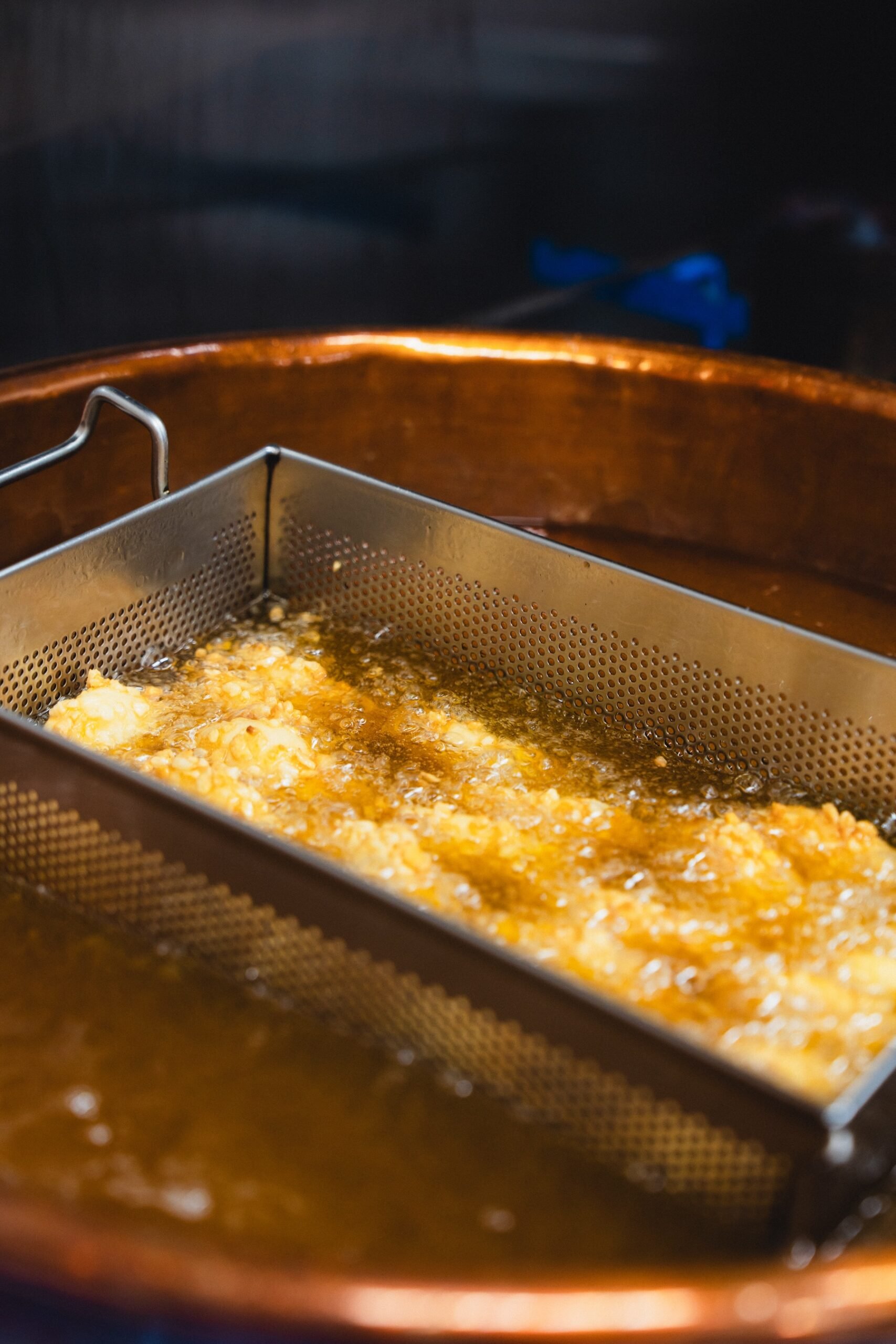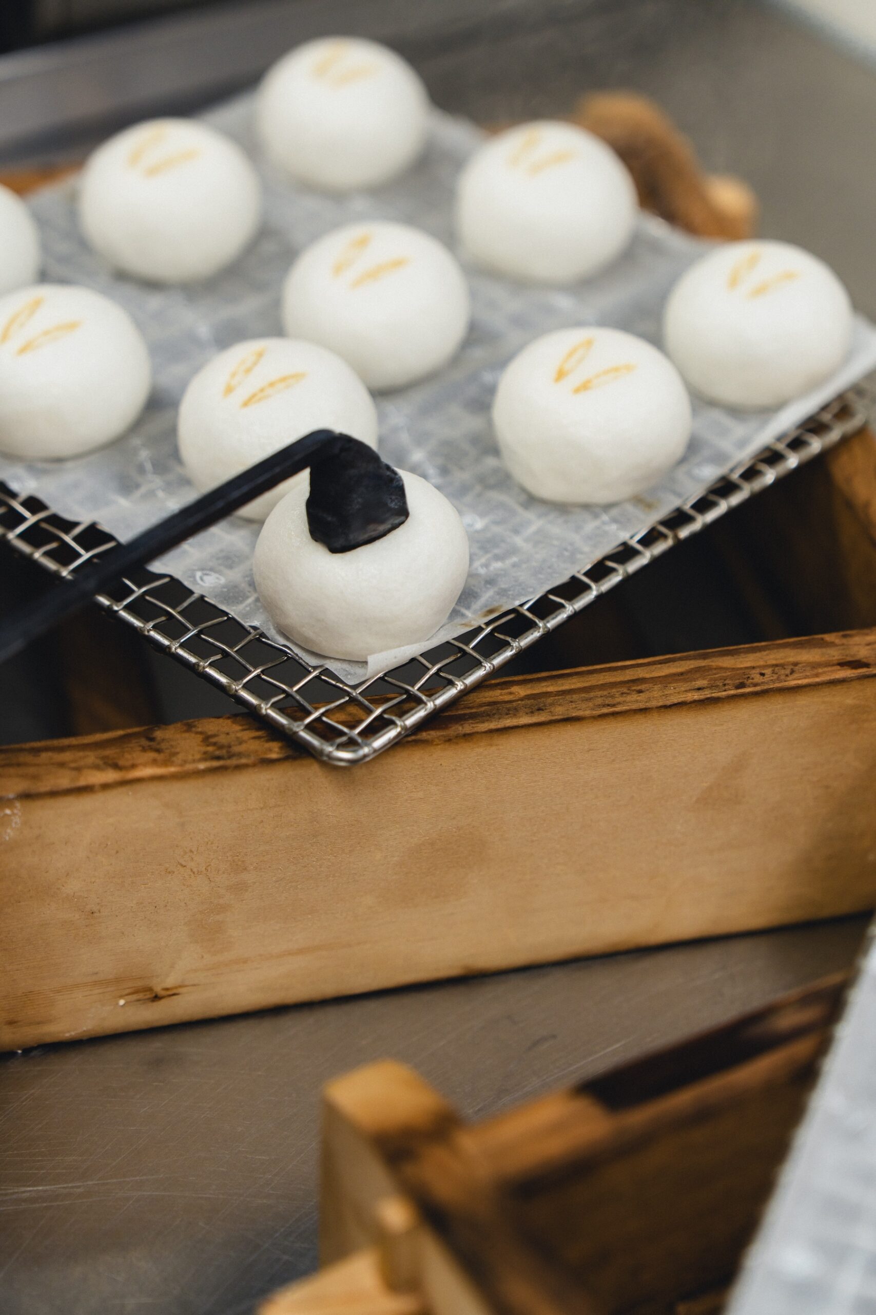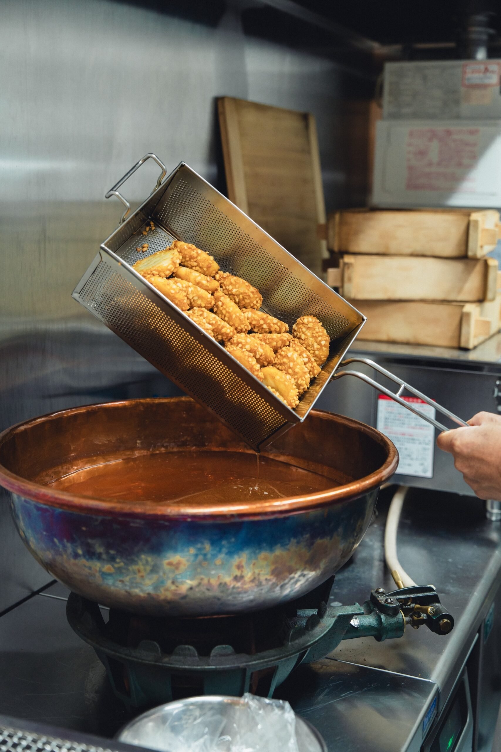 『銀座 菊廼舎 銀座本店』には冨貴寄のほかにも、店頭でのみ販売される限定和菓子がいくつもあります。売り切れた分はその都度店内で作られるため、できたてのおいしさを楽しめるのが魅力です。中でも、店内でカラッと揚げる「揚げまんじゅう」は、1日最大300個も売れる人気商品。甘い小豆を食べる文化のない海外の方にも、あんこのおいしさを知ってもらおうと4代目が開発した新感覚の和菓子です。ほかにも、生地に大和芋を練り込んだ薯蕷(じょうよ)饅頭など、伝統を重んじた和菓子が揃っています。