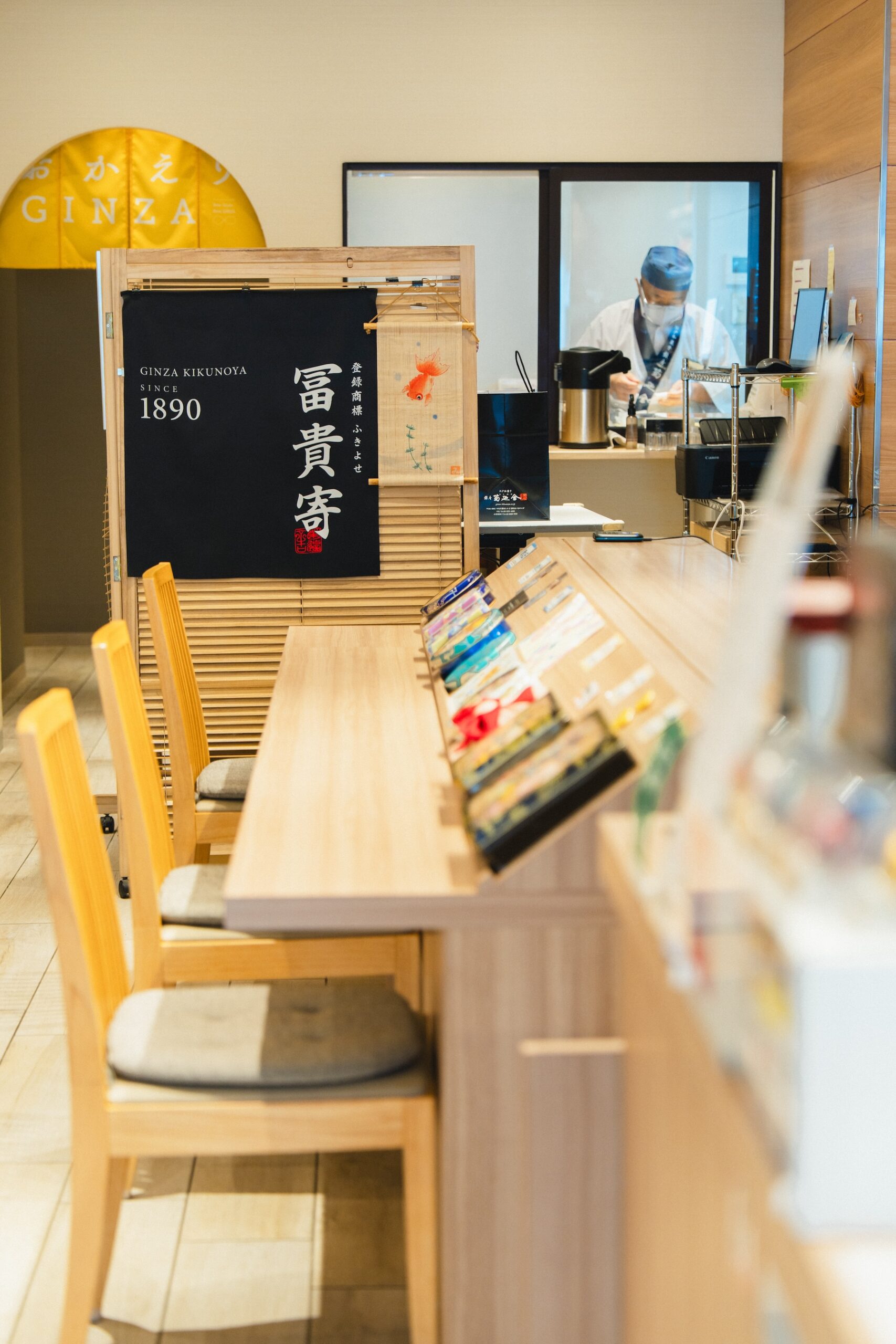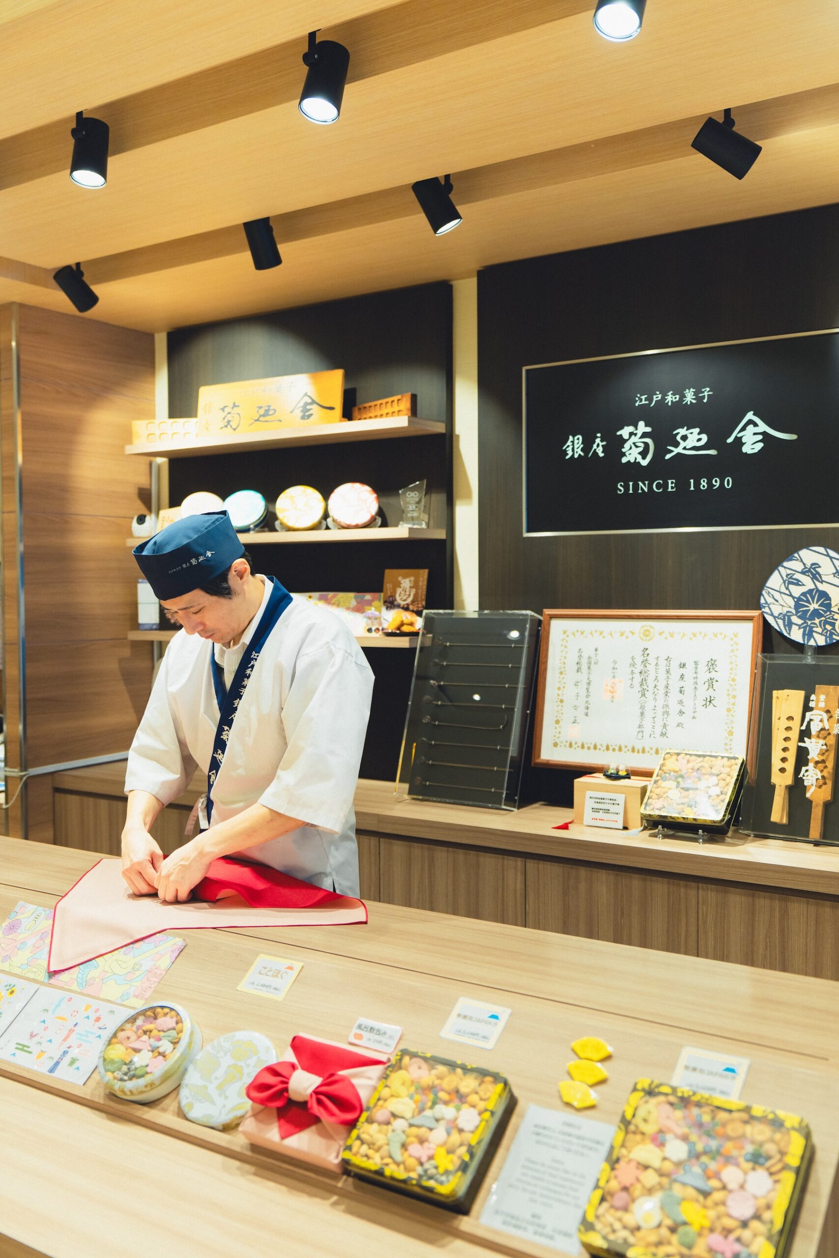 『銀座 菊廼舎 銀座本店』の歴史は、1890年(明治23年)、歌舞伎座のそばで歌舞伎煎餅を売り始めたことから幕を開けます。以来、幾度となく訪れる時代の困難を乗り越えながら、伝統を守り続けてきました。そして2021年、創業の地であるあづま通りに本店を移転し、現在は5代目。格式が高いと思われがちな銀座のイメージを変えるべく、人情味あふれる温かい接客を心がけています。また、次世代の子どもたちに和菓子職人の魅力を伝えたいという想いで、昨年から和菓子教室も始めました。伝統を大切にしながら、時代とともに愛されるお店づくりを続けています。