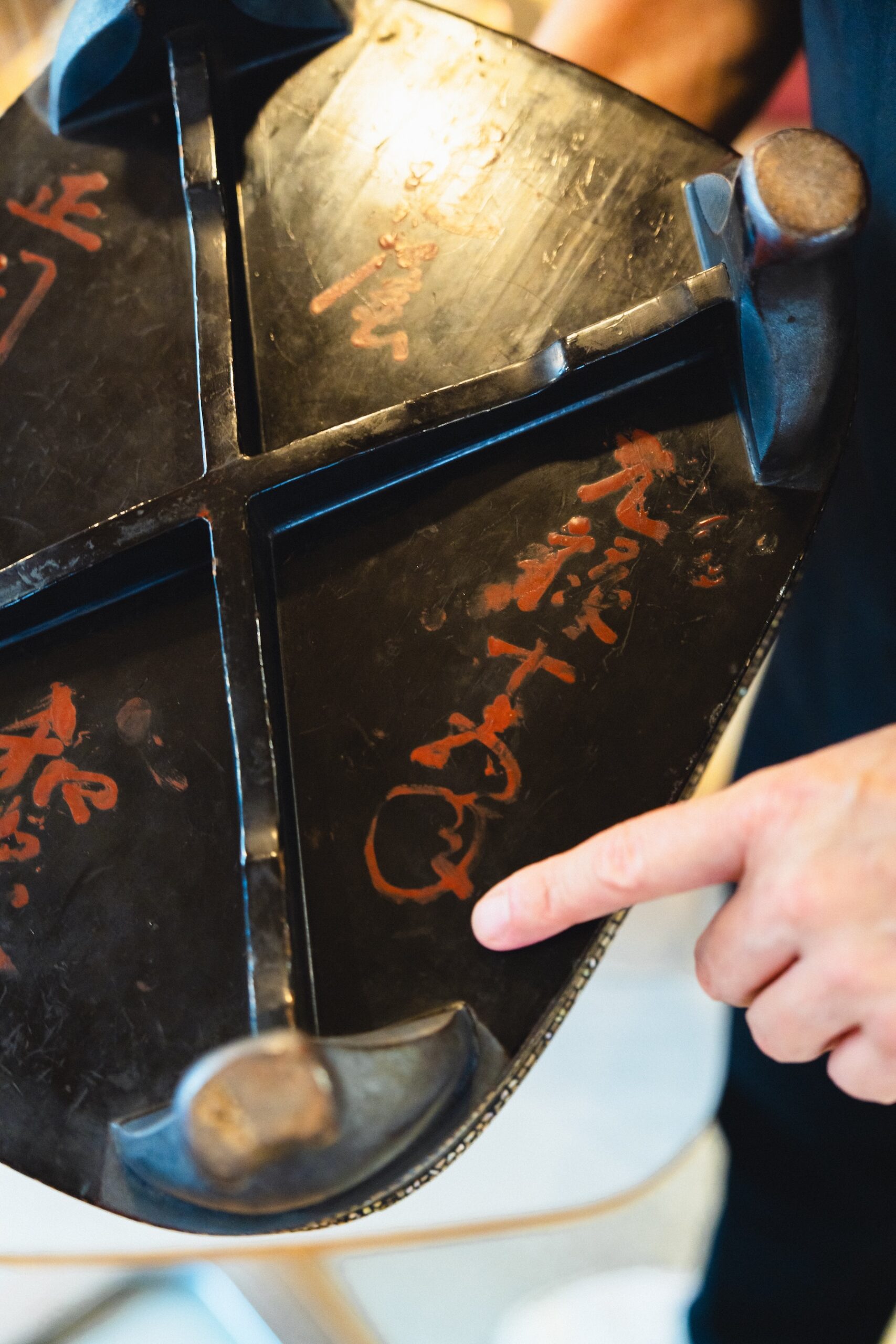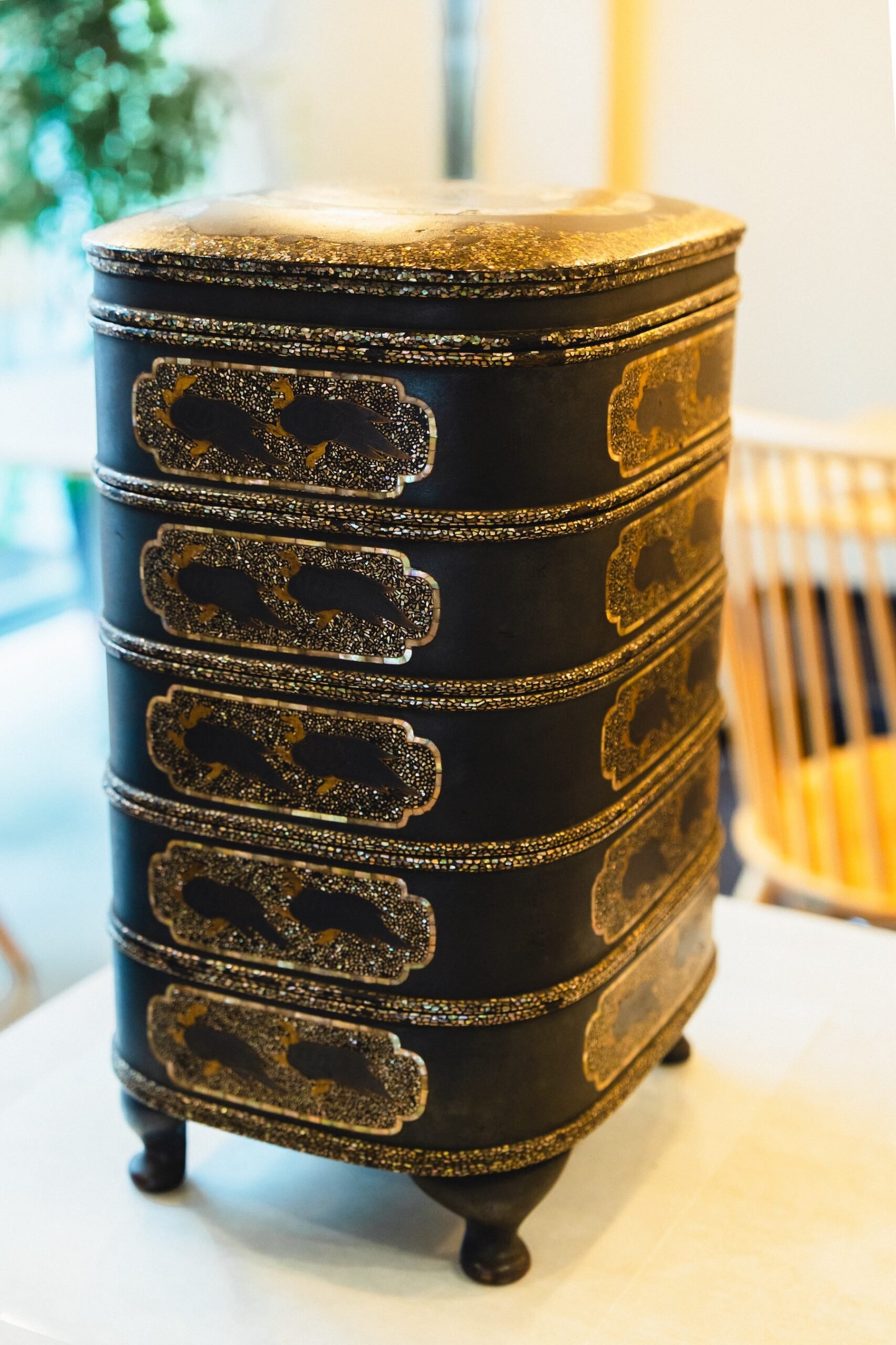 店の倉庫には、『亀屋和泉』時代に和菓子の配達に使っていた木製の容器・外居(ほかい)が大切に保管されています。繊細な装飾が施された豪華な造りです。
