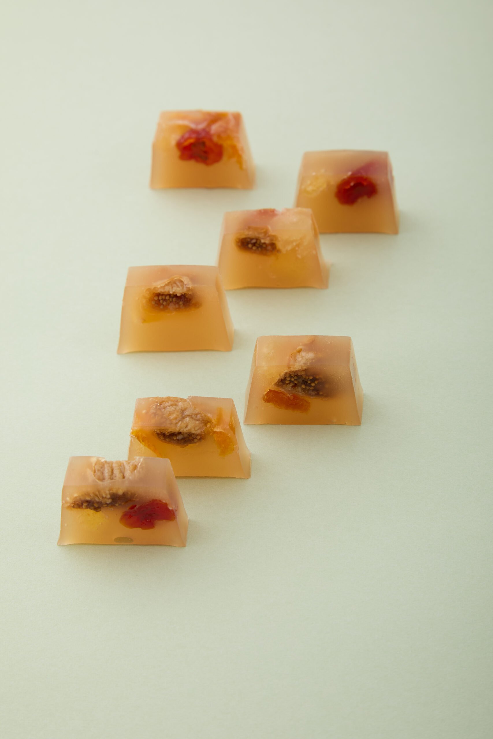 羊羹を現代風にアレンジした「百果」も人気菓子のひとつ。ドライフルーツ羊羹は、爽やかなレモン羊羹にイチジク、パイン、みかん、トマト、生姜のドライフルーツを流し入れた新感覚の一品。1本1,296円。