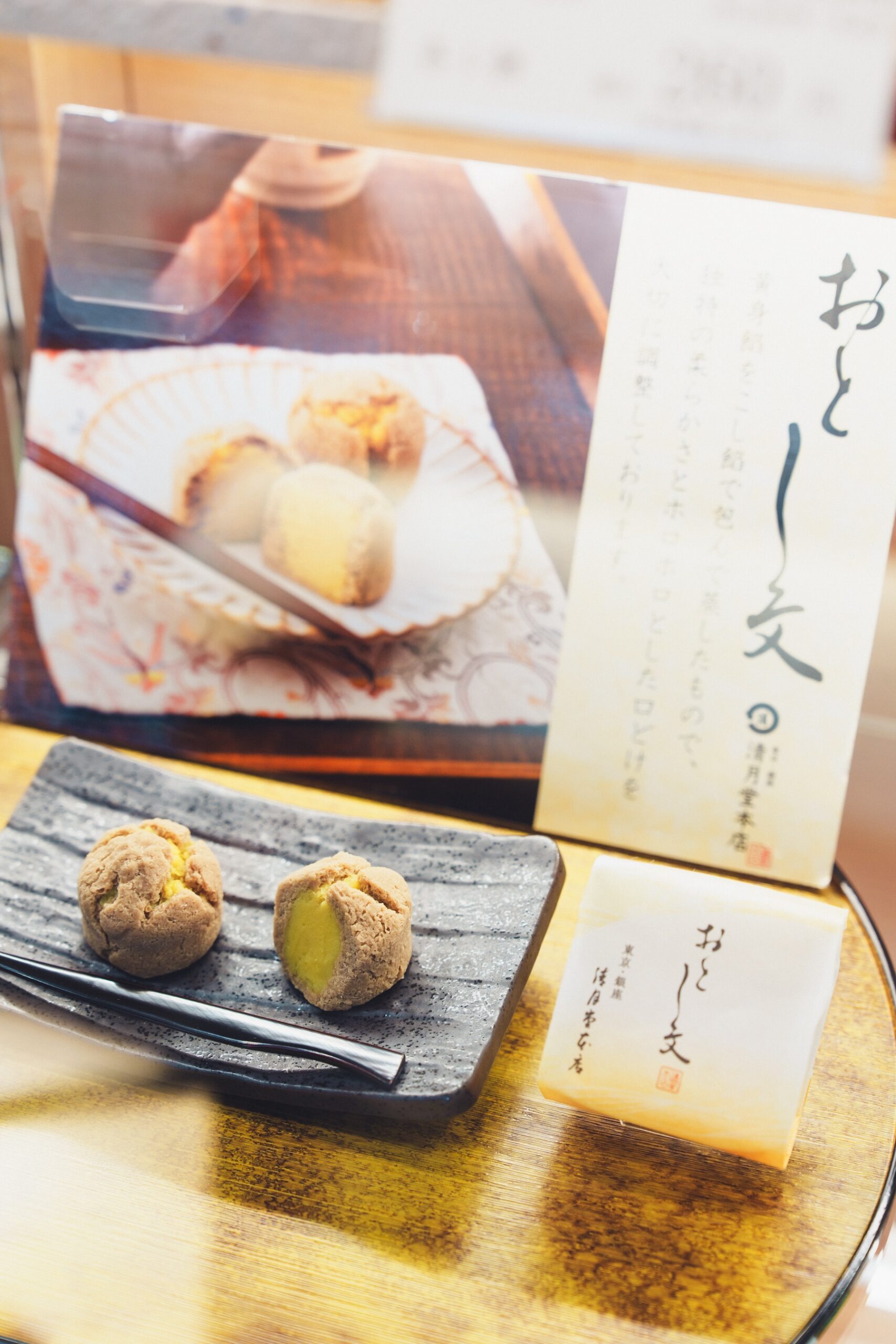 『清月堂本店』で長年愛されている銘菓が、コロンとしたフォルムがかわいらしい「おとし文」です。一代一菓の心得のもと、3代目が昭和50年代に考案しました。一般的な黄身しぐれ菓子は黄身餡でこし餡を包むところ、「おとし文」はこし餡で黄身餡を包むことにより、黄身餡を主役にしています。