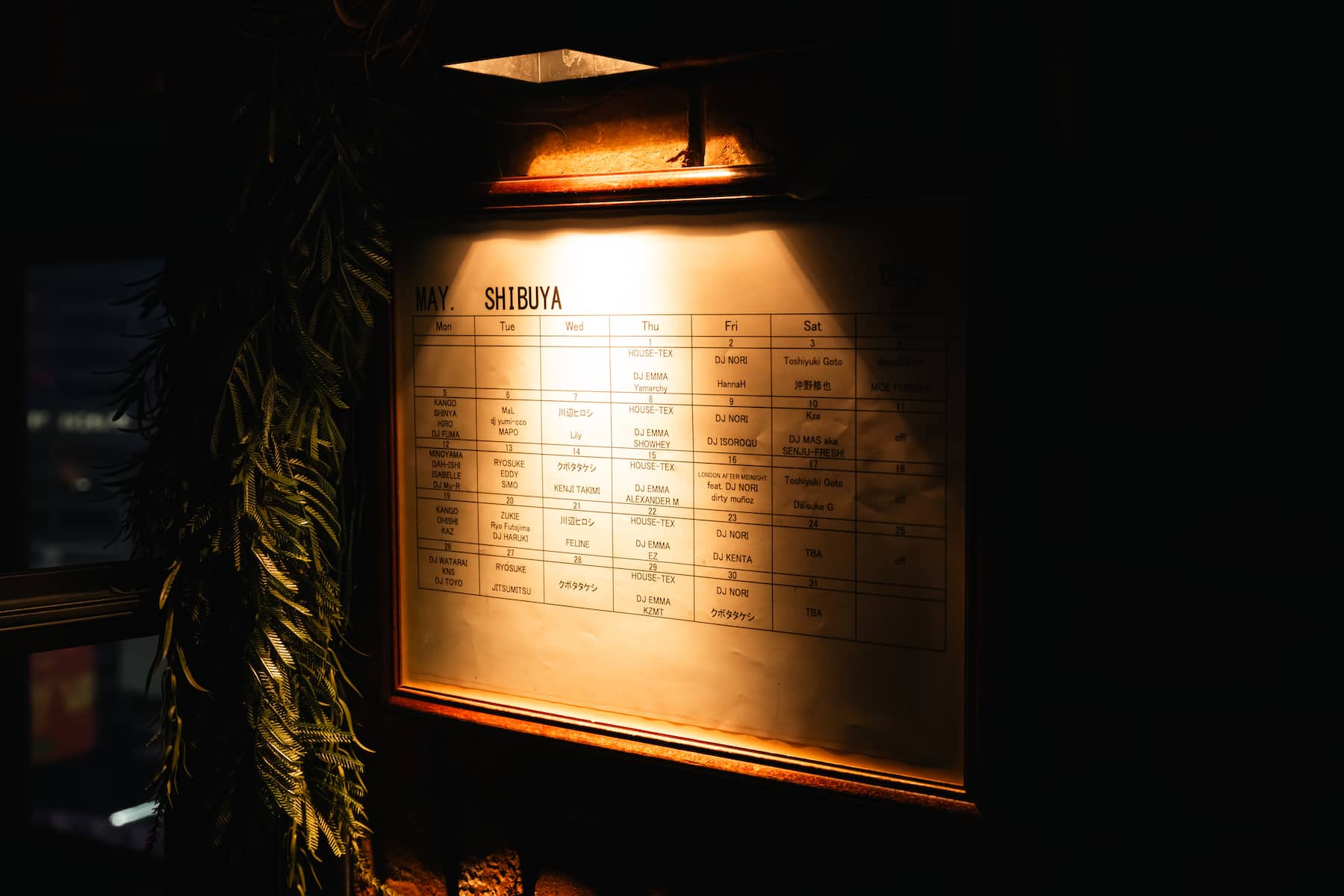 店内には、日毎にDJ名が記載されたスケジュール表が貼られている。