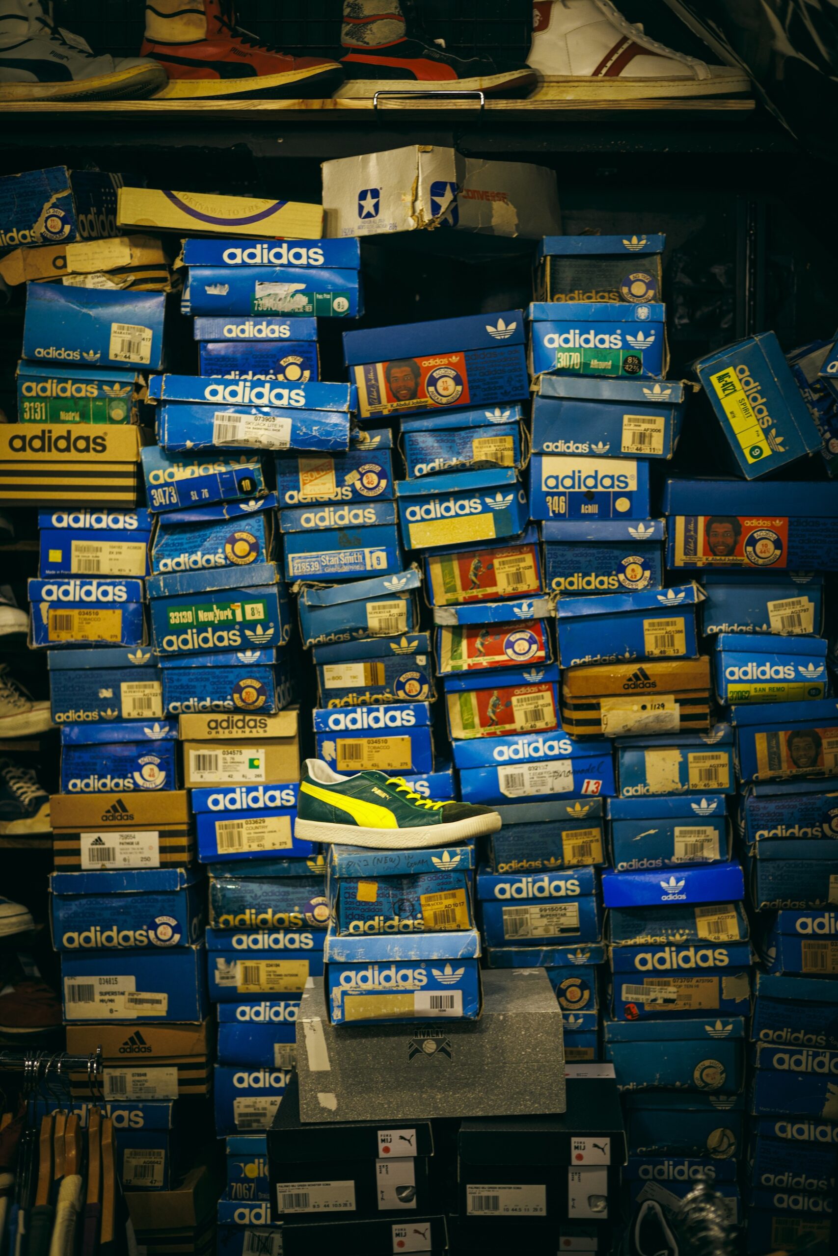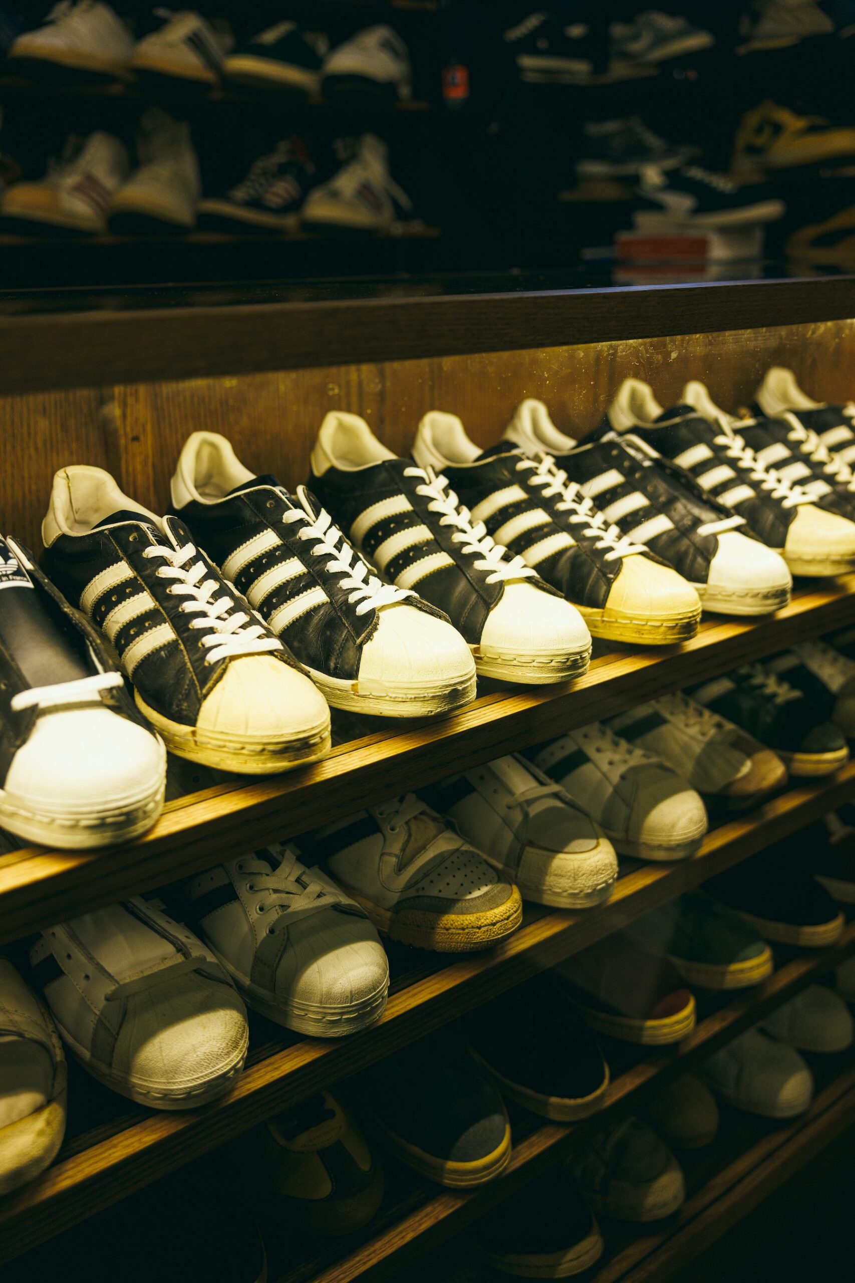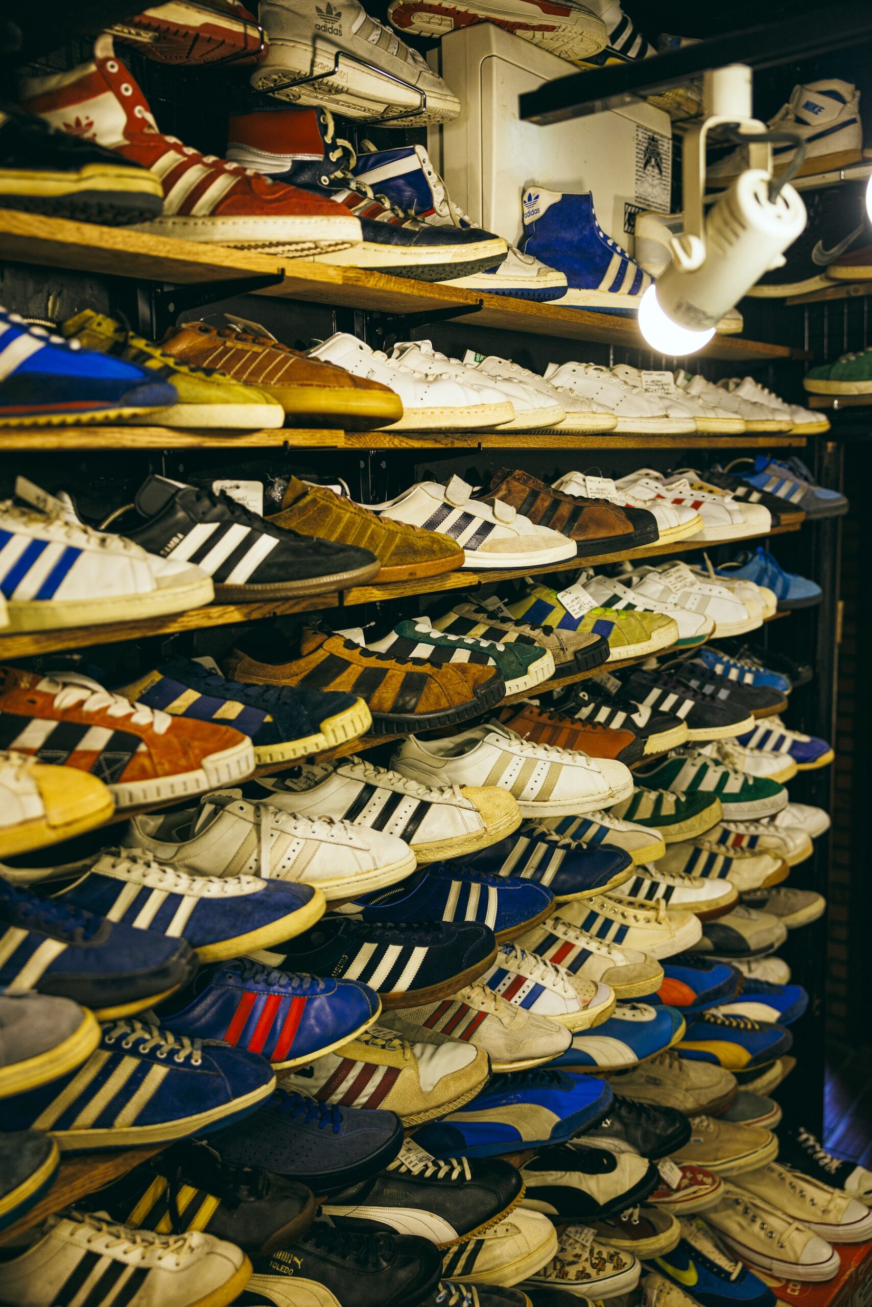 大半が『アディダス』製。中でも『スーパースター』や『スタンスミス』の品揃えが豊富です。