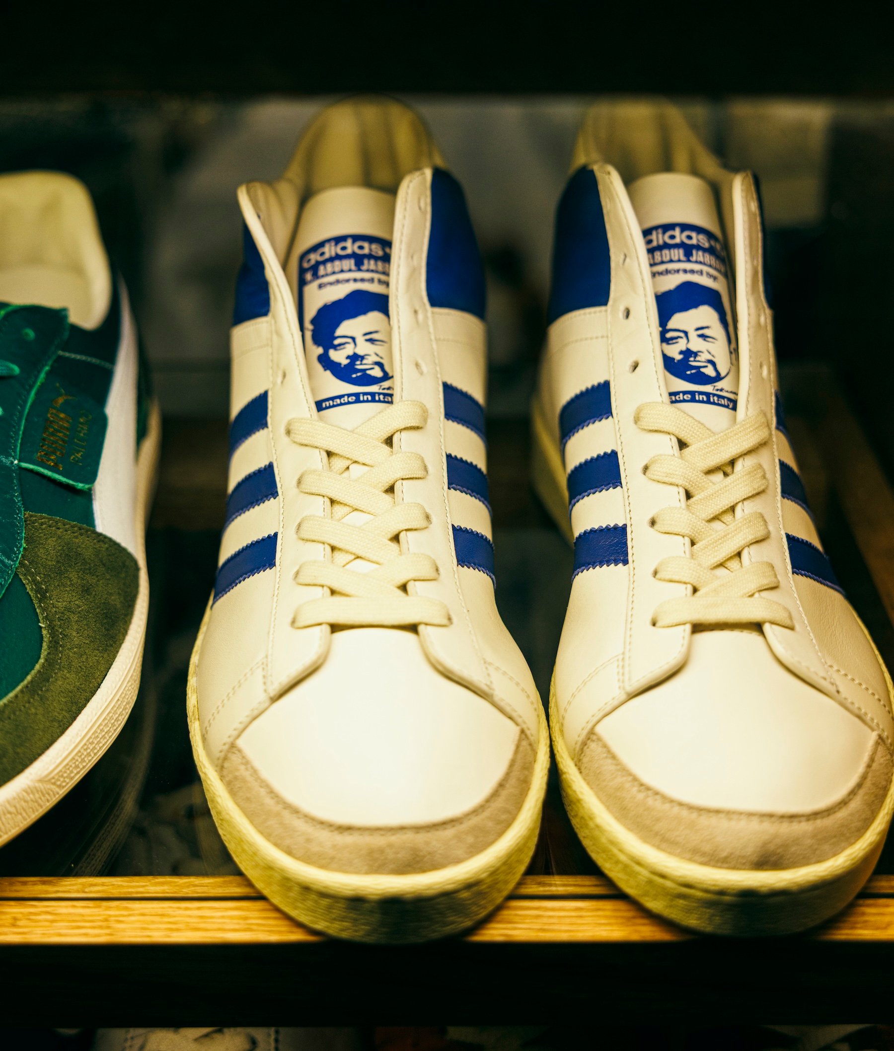 オリジナルに忠実に復刻した『アディダス ジャバー』は、徳永さんの似顔絵の刻印つき。徳永さん監修のもと、プロモーション用に製造された非売品のため、世界中探してもここでしか見られない。