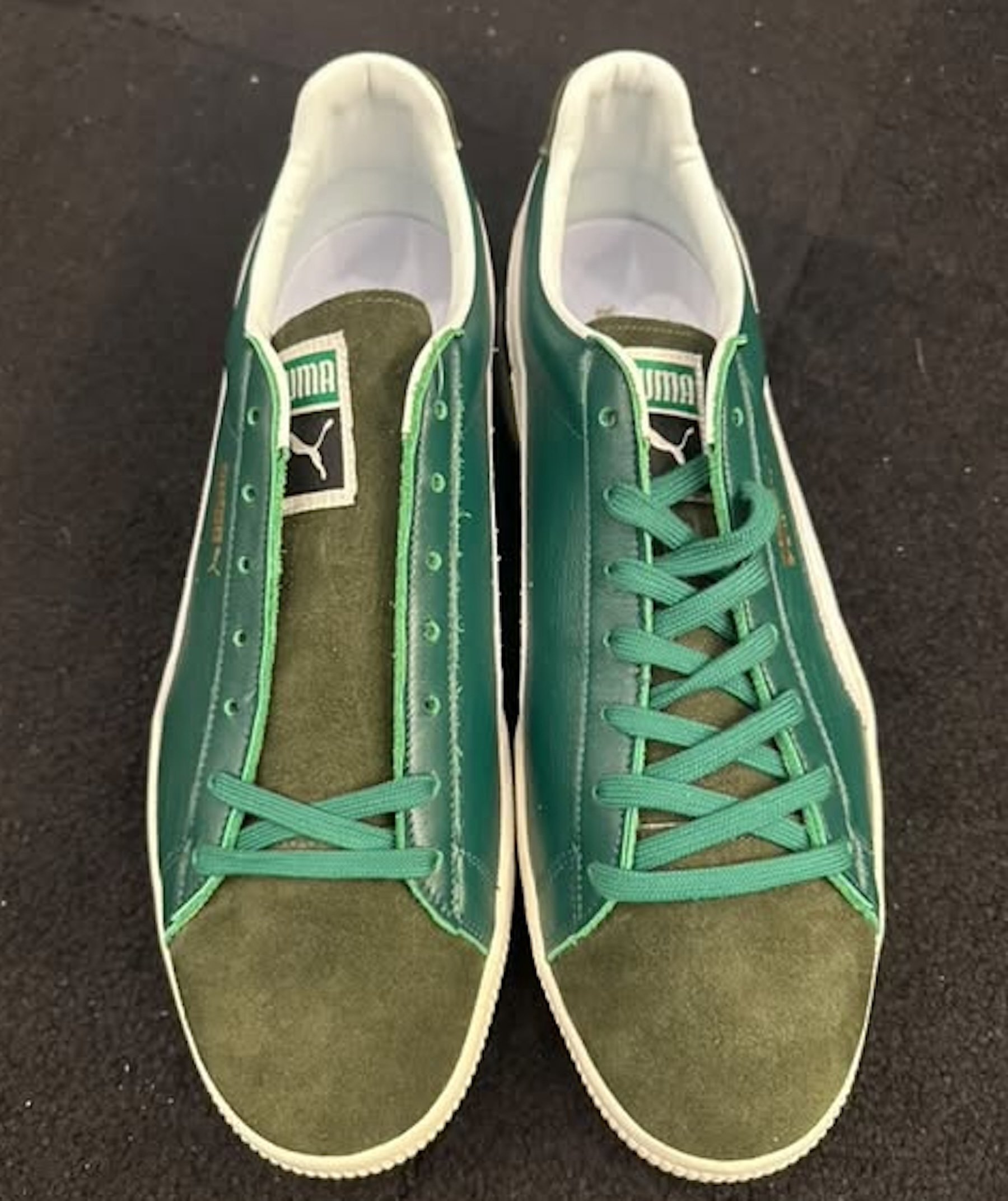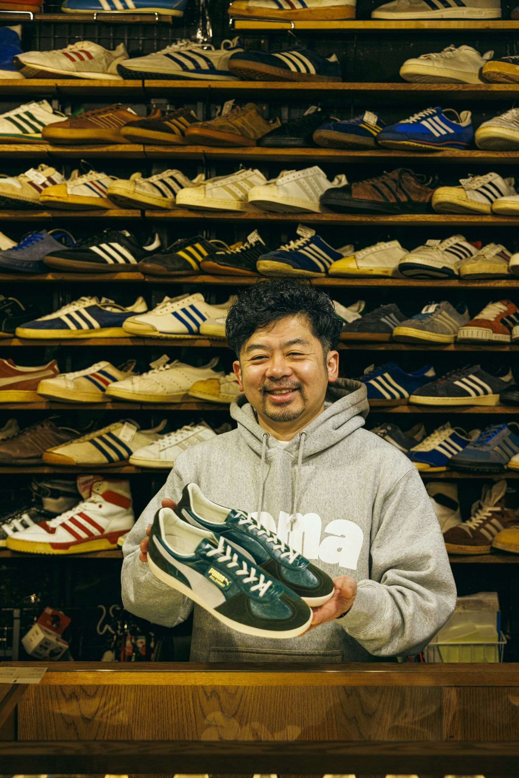 店主が好きなNBA『ボストンセルスティックス』のチームカラーを落とし込んだグリーンのスニーカーは、70年代のオリジナルモデルを参考に、本革を使用して細部までこだわったそう。 2022年代製の『プーマ スウェード MIJ ソーマ×アトモス』 18,500円 ※完売