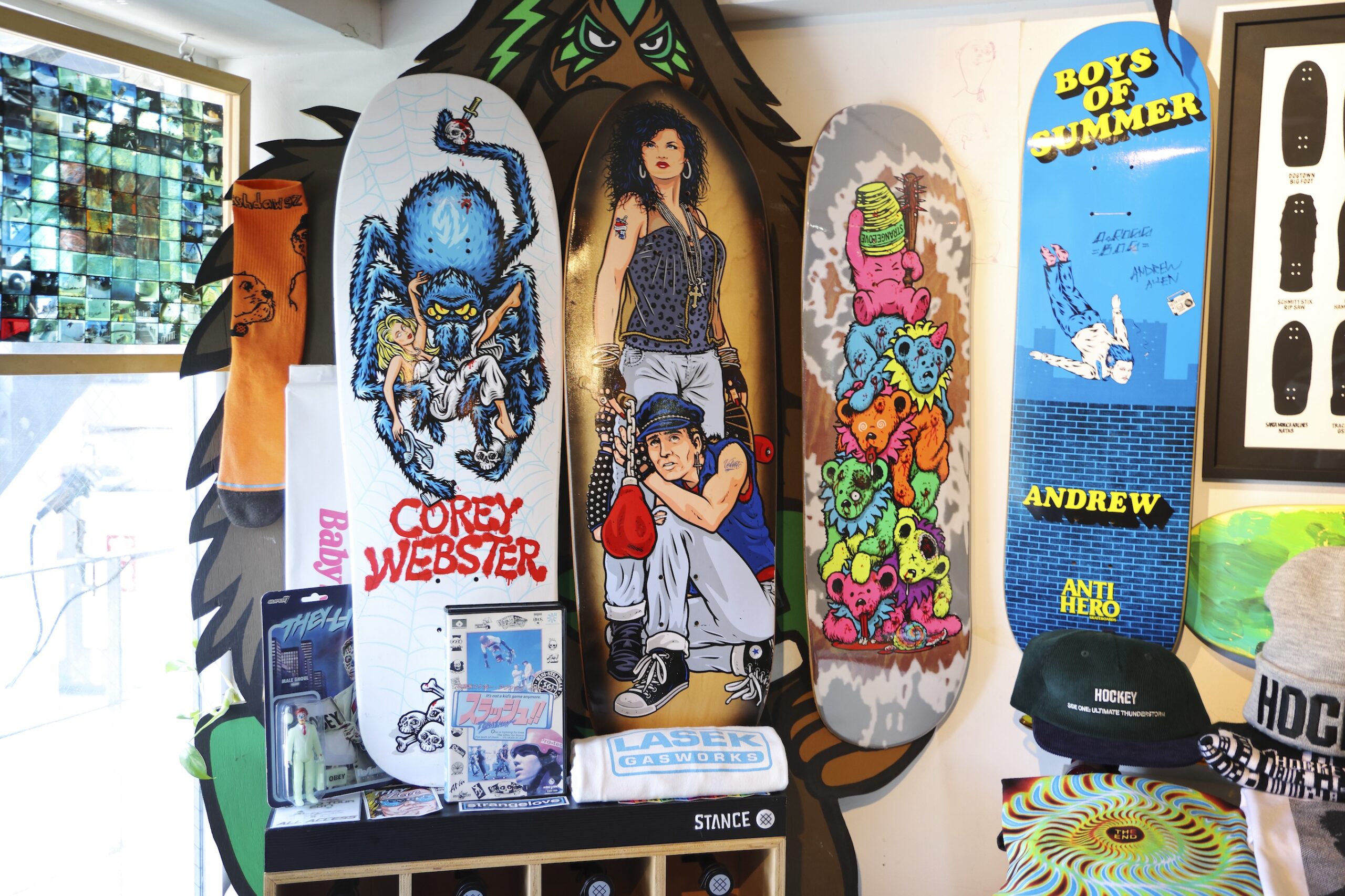 ショップにはスケートデッキはもちろんのこと、スケートボードにまつわるファッションやギア、アートグッズなど、さまざまなアイテムが並んでいます。