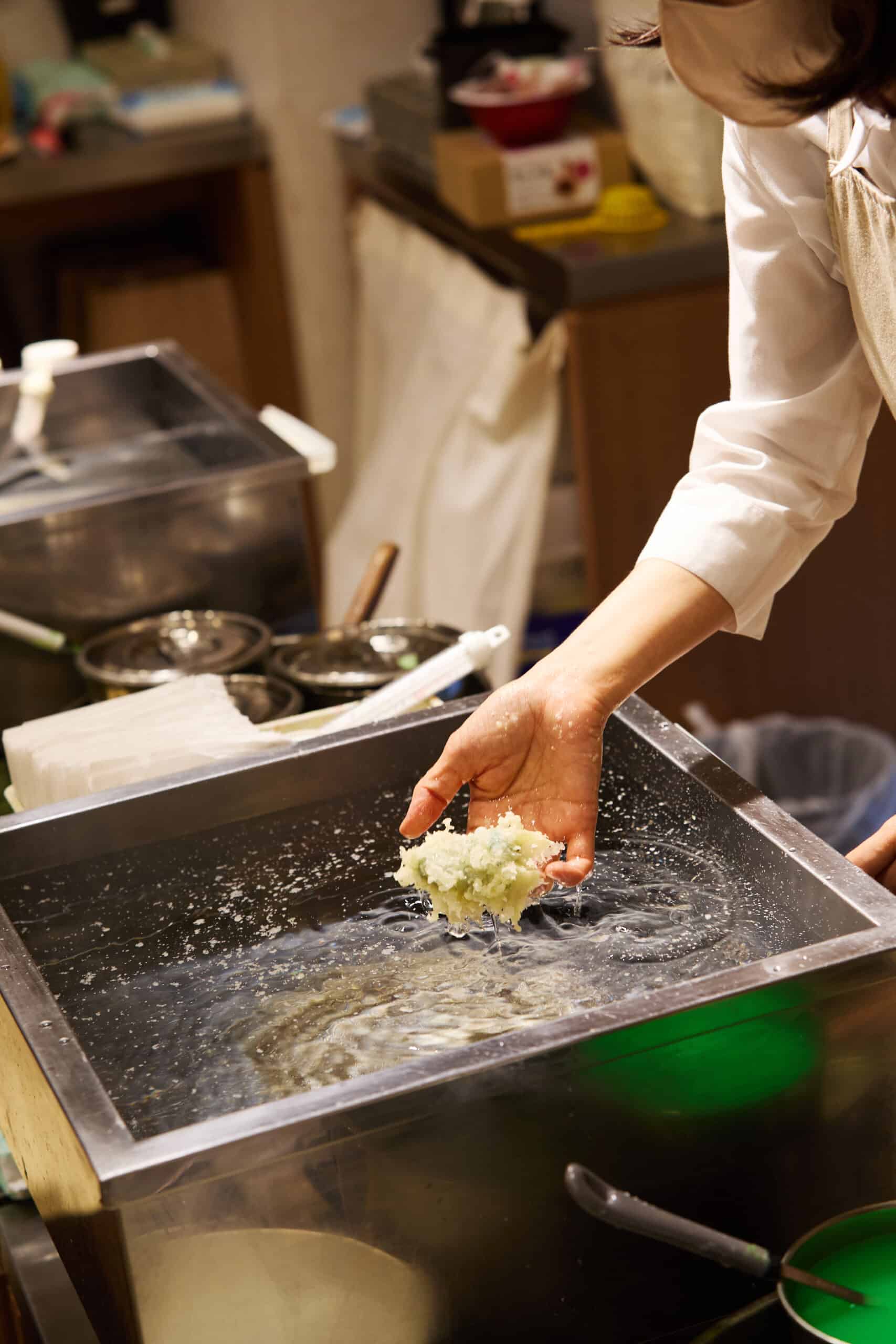 高い位置からおとしたロウが泡立って……天ぷらの衣に早変わり!