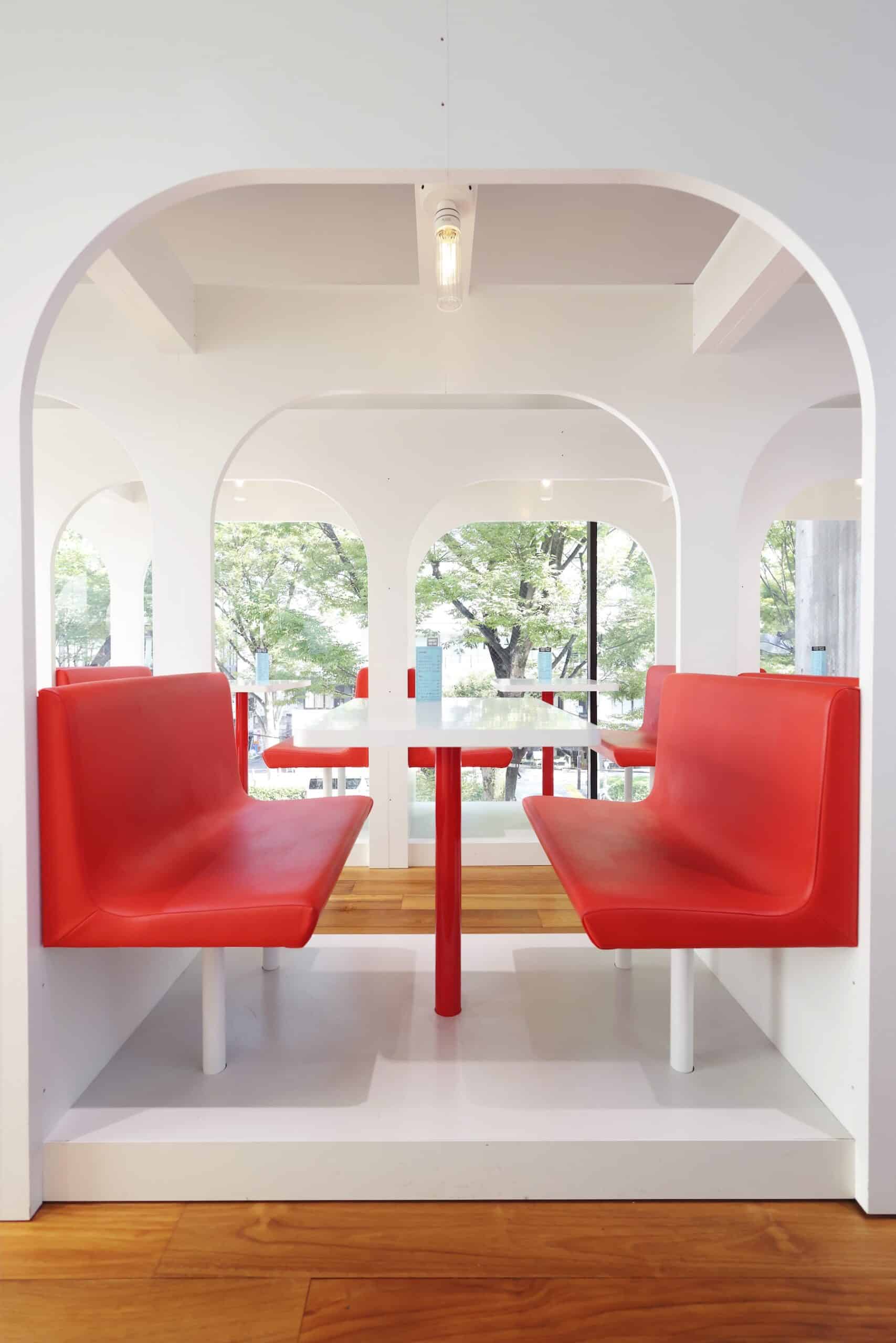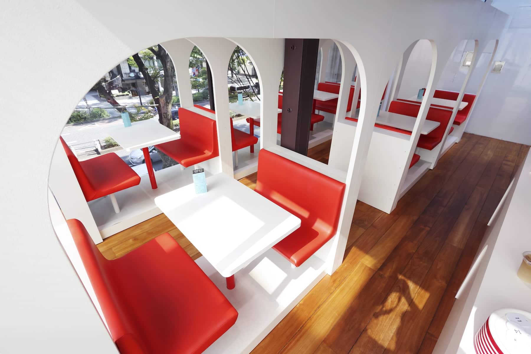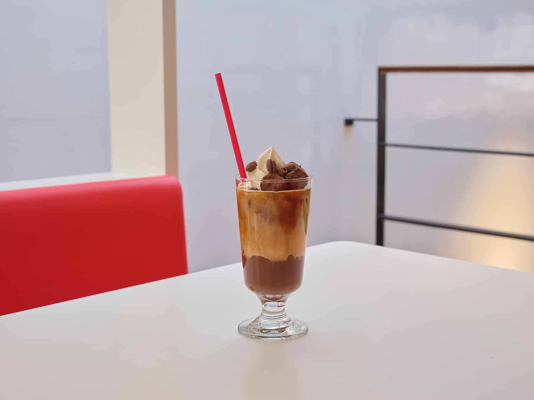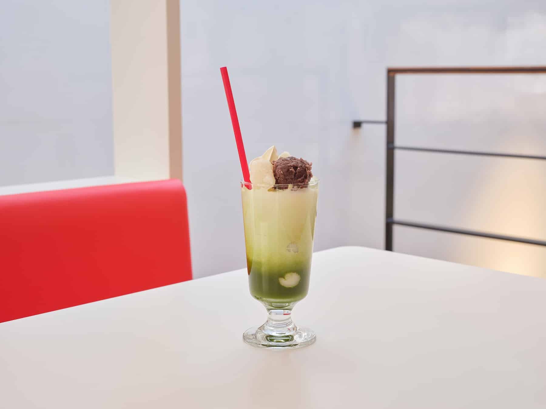 『montoak』の面影も残るカフェスペースは、2024年に閉店した神田の純喫茶『エース』から譲り受けたというインテリアが使われており、赤と白のコントラストが特徴です。提供されるドリンクは白玉とあんこがミックスされた“あんこ抹茶ラッテ”や見た目も美しい“カフェパリス”といったオリジナルドリンクが目を引きます。窓際の席からは表参道の街路樹を見下ろせて、ドリンクを楽しみながら表参道の景色を楽しむといった贅沢な時間を過ごすことができるのでおすすめです。