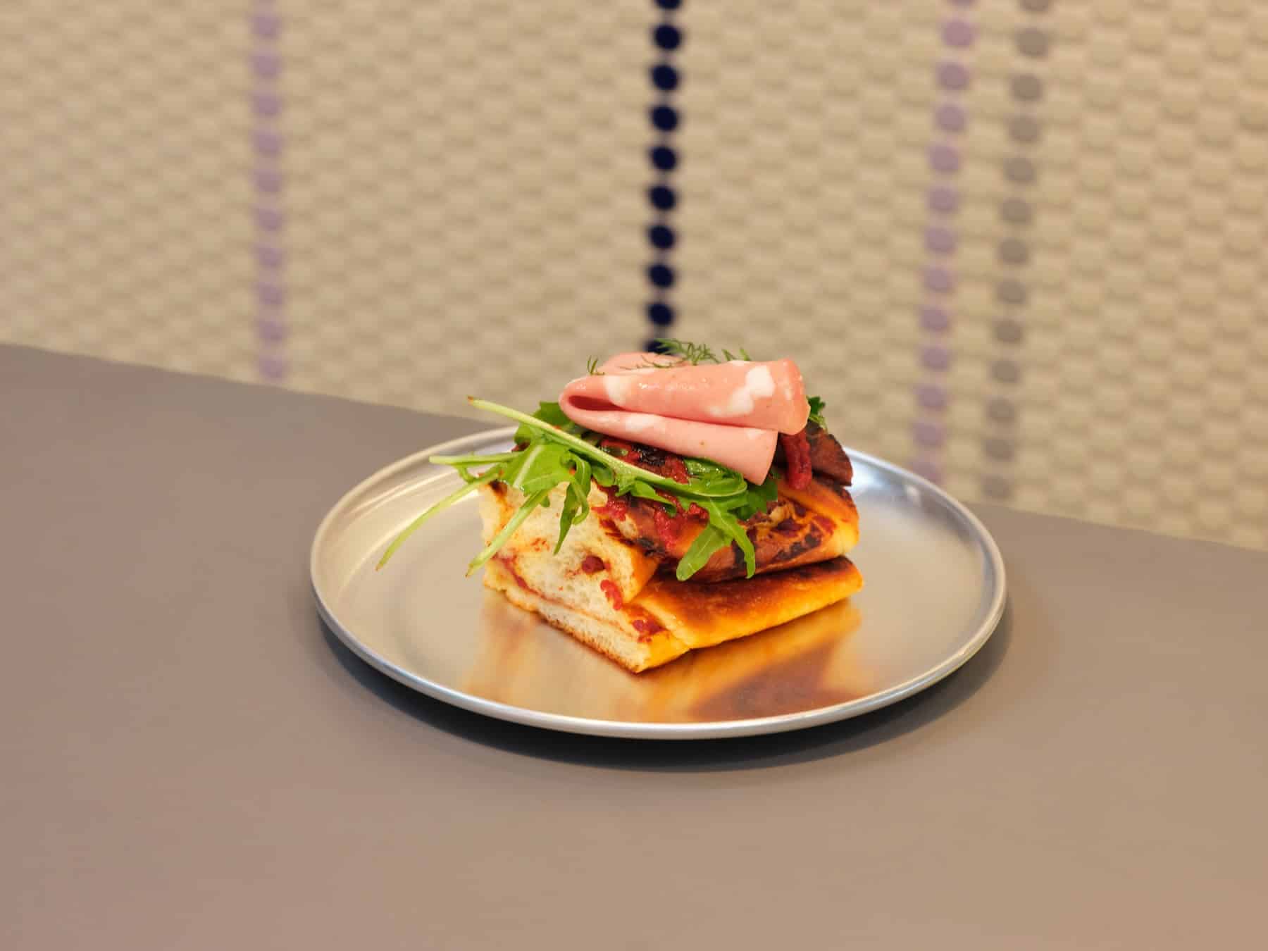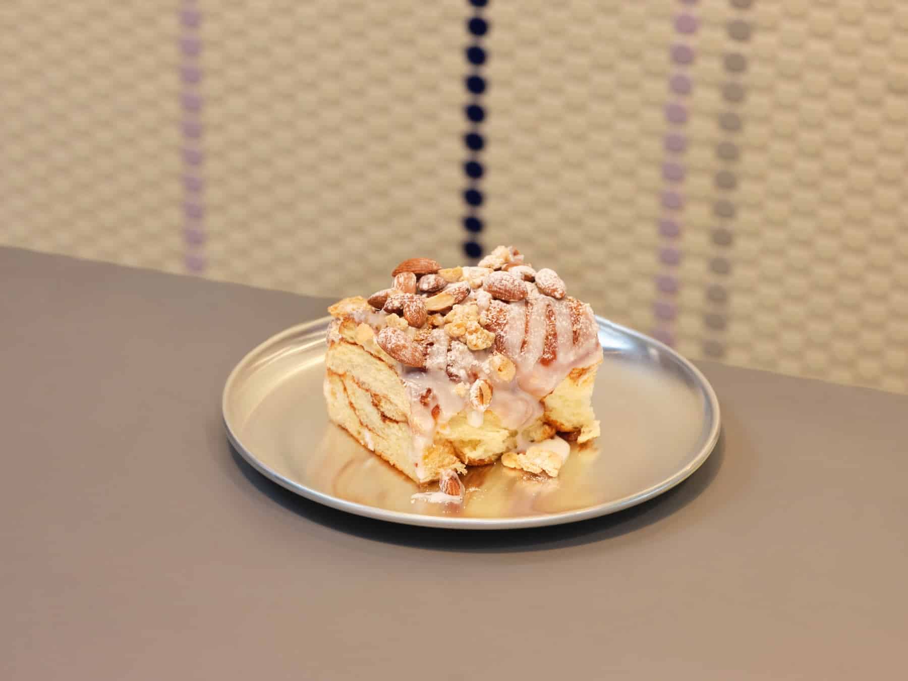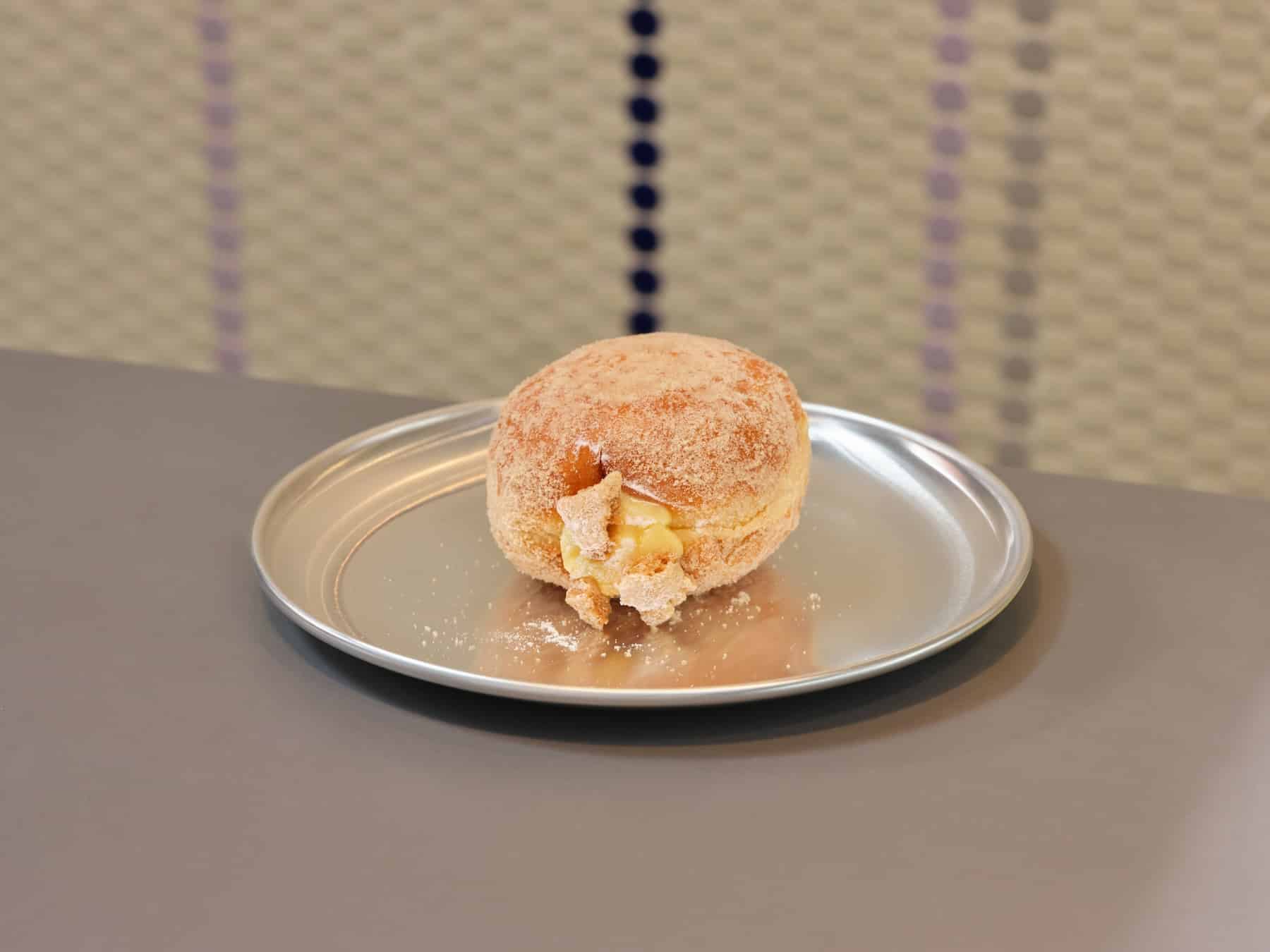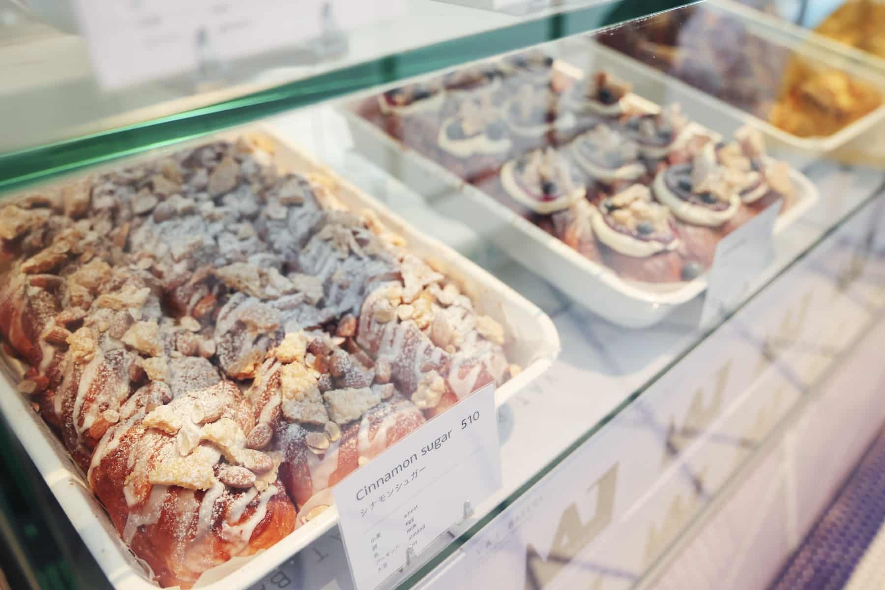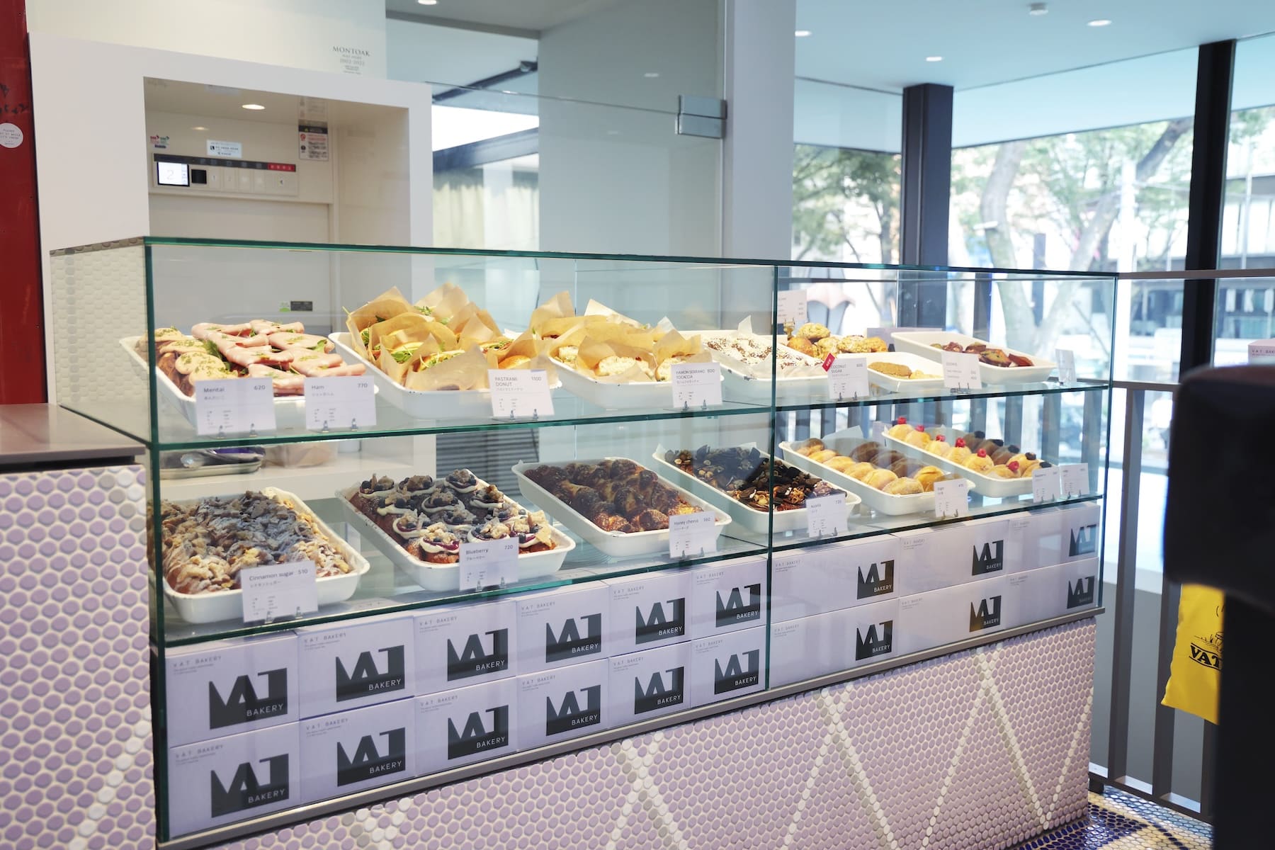 パンを生地に乗せるバットごと焼き上げることから『VAT BAKERY』と名付けられたベーカリーは、店内で焼き上げているのが特徴です。ショーケースには人気のシナモンシュガーをはじめ、カスタードクリームやラズベリーが入ったドーナツといったスイーツ系から、明太子ソースやリオナソーセージが載った惣菜パンなど、バリエーションも豊富。焼きたてをテイクアウトすることはもちろん、カフェスペースですぐに食べることもできます。