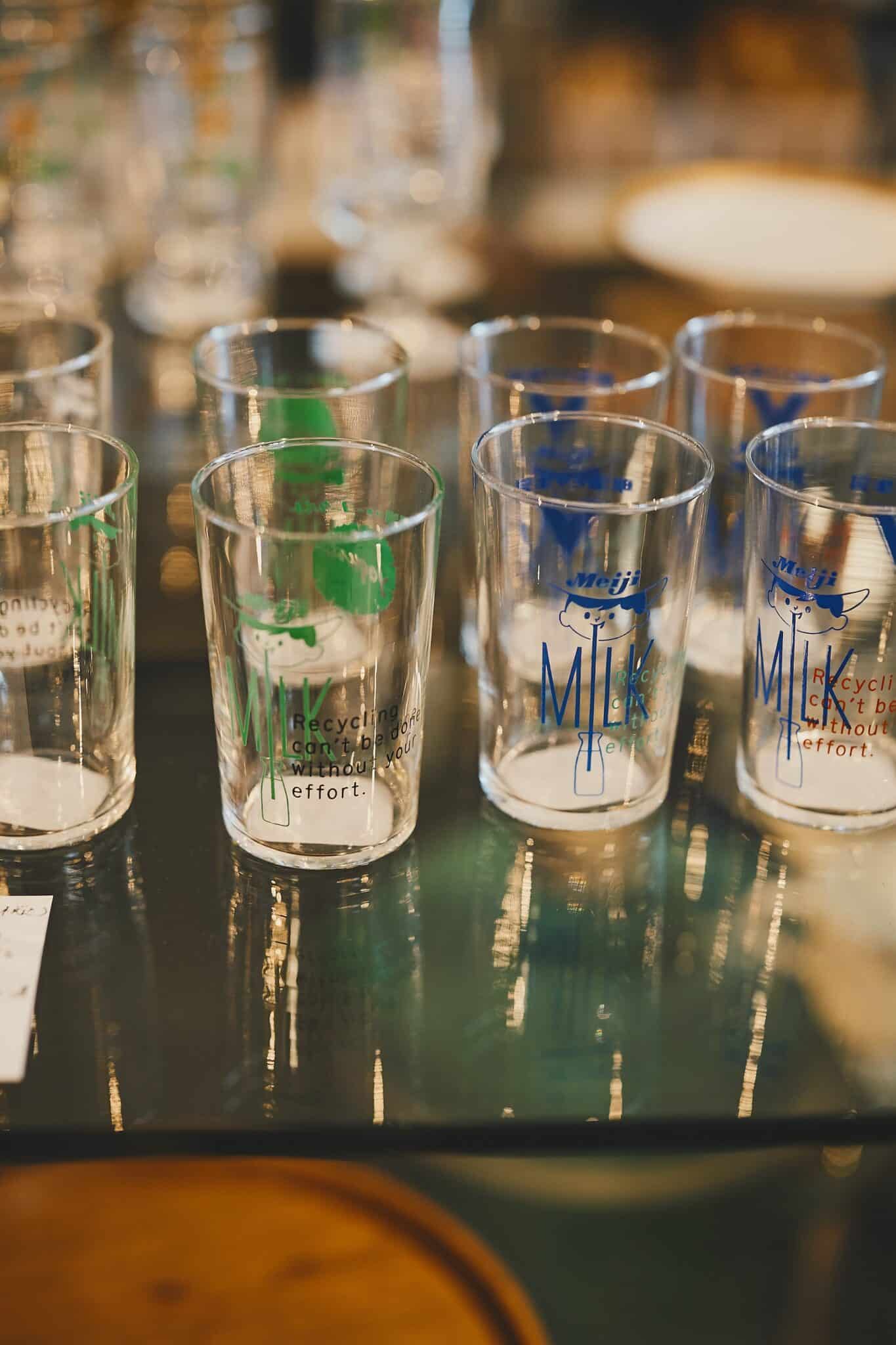 ユーズド品は、リペアして販売することも。こちらはリサイクルショップで発掘した飲料品のノベルティグラスに「Recycling can't be done without your effort.(あなたの努力なしではリサイクルできません)」というメッセージを添えてリペアしたもの。