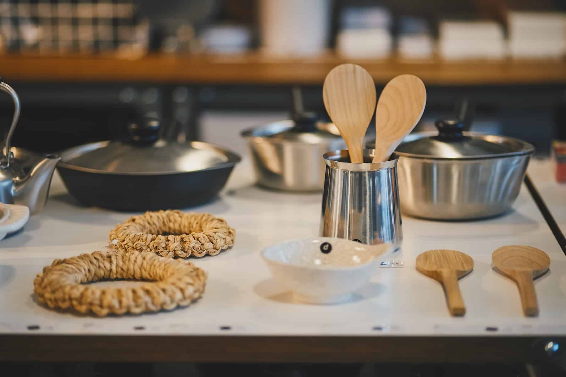 キッチン雑貨や食料品は、国内メイドのものが中心。広島県・宮島の名産であるしゃもじや、富山市で循環型農業を実践する「土遊野(どゆうの)」と開発したオリジナルレシピのスコーンミックスなど、全国から選りすぐったアイテムも多数。