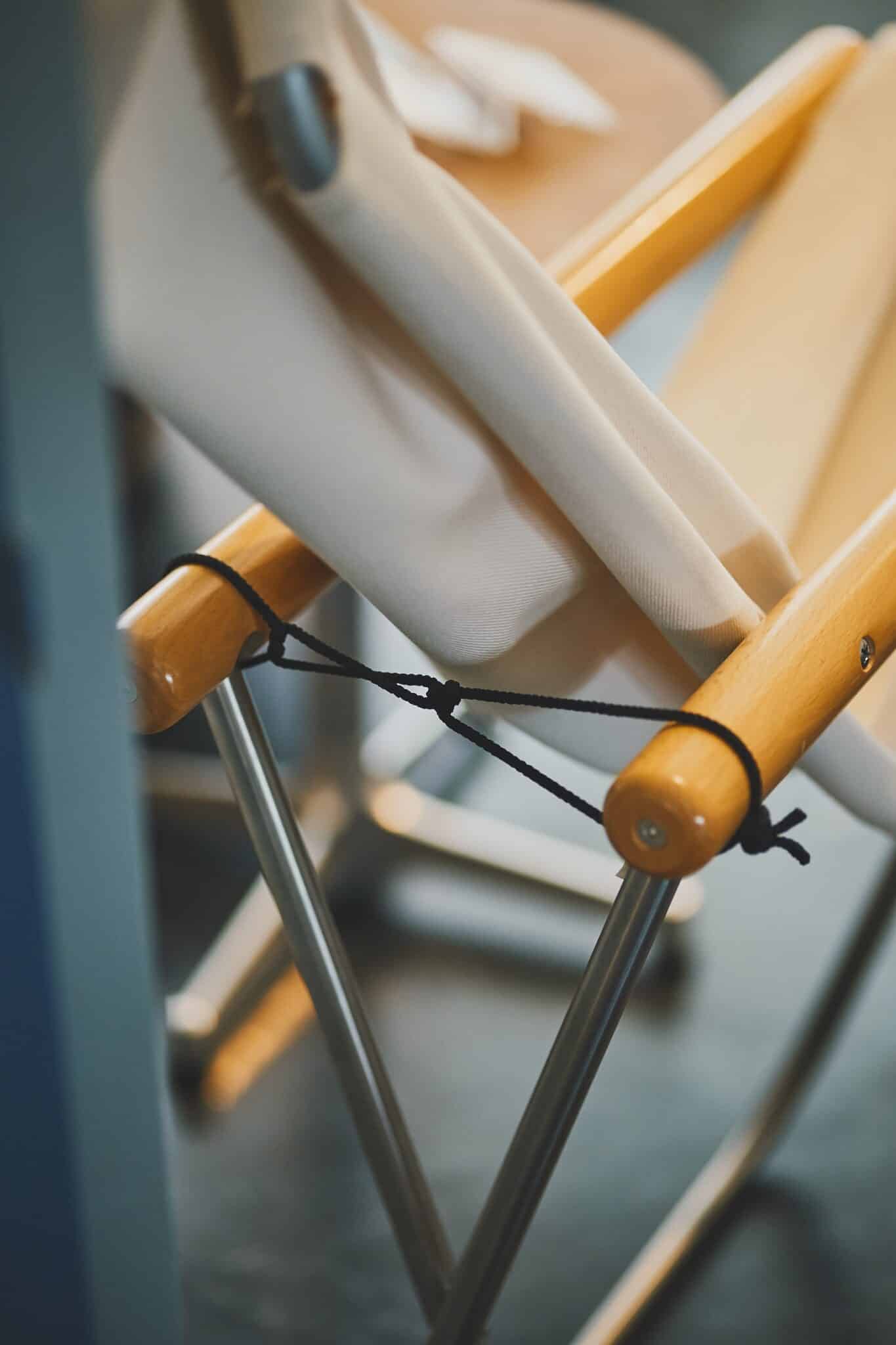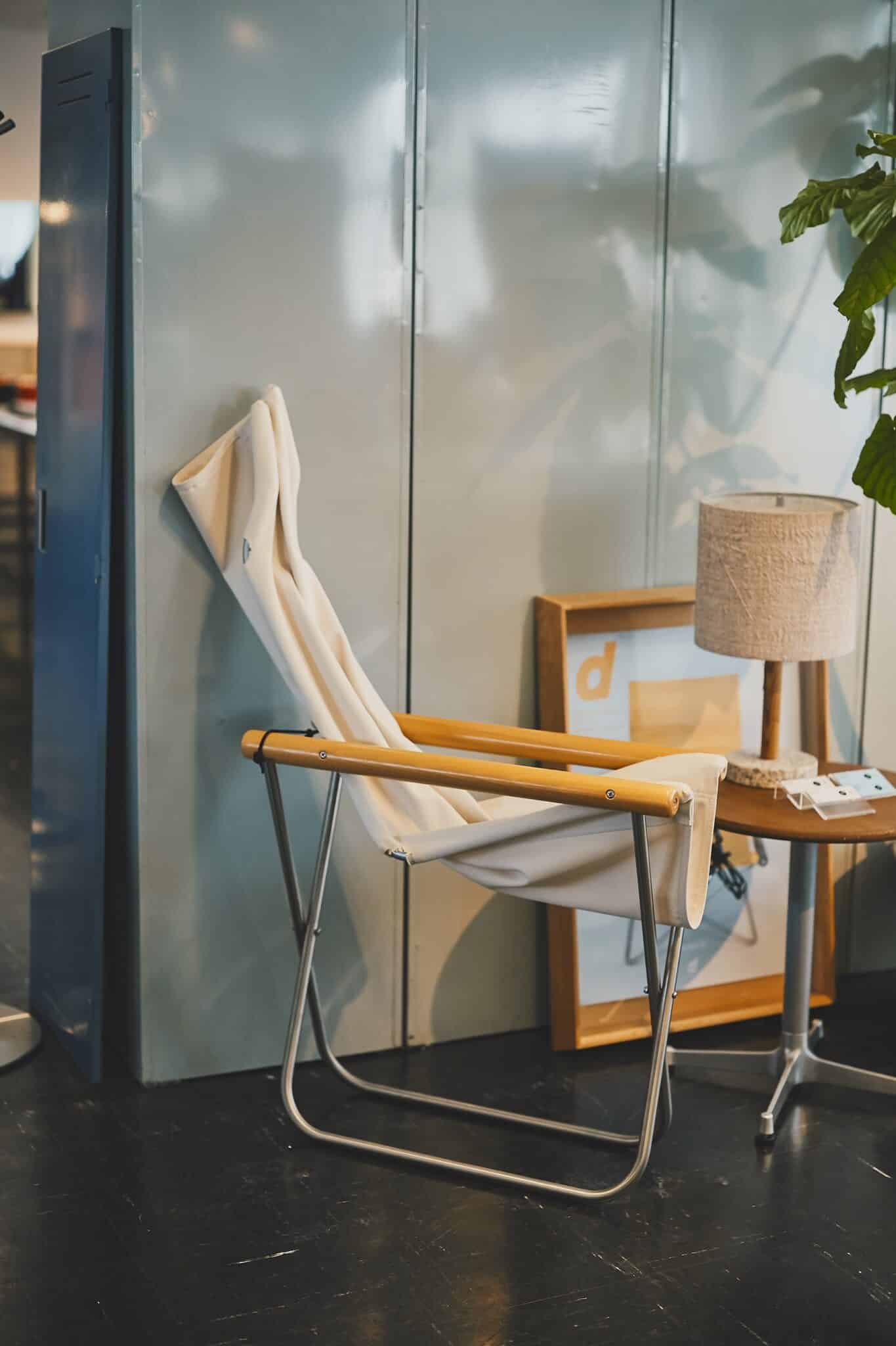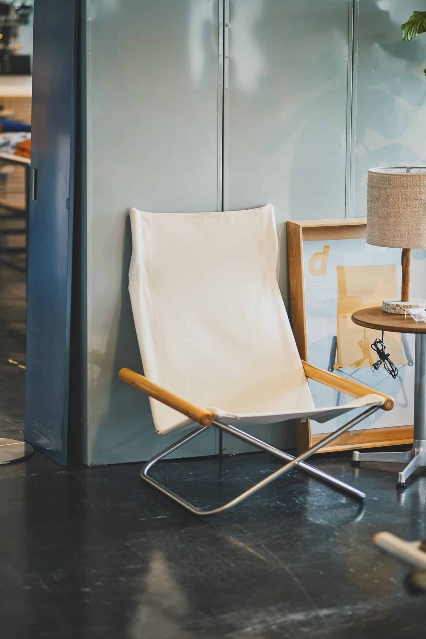 座り心地と手軽さを追求し、1970年に完成したニーチェアエックス。デザインした新居 猛(にいたけし)氏は、もともと剣道具の製造を手がけていましたが、GHQによる製造中止命令から家具の世界へ。そんな同氏が、剣道具製造で培ったノウハウが詰まった折りたたみチェアです。体がすっぽり収まるハンモックのような座り心地で、生地を交換しながらずっと使いつづけられるのが魅力。現在は株式会社 『藤栄』によって生産販売が行われています。