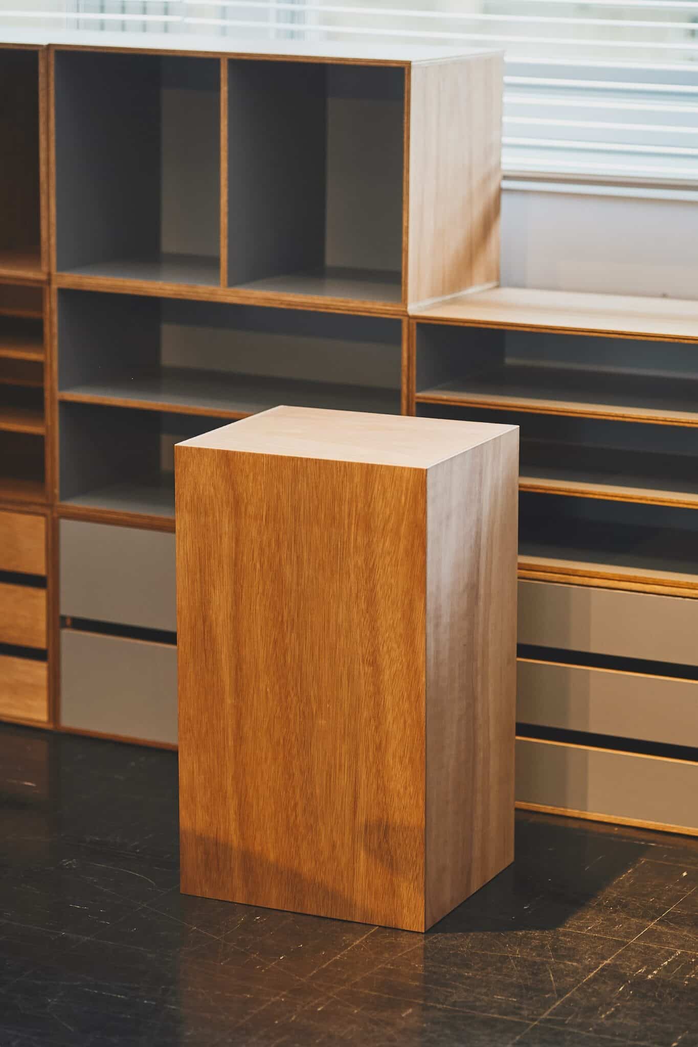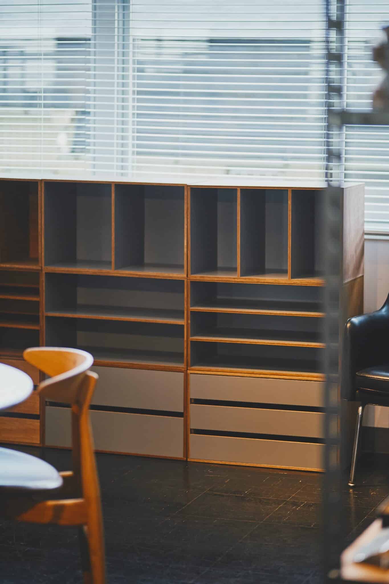 デザイン事務所『LUFT』が手がけた箱型収納。もとは『LUFT』の事務所の備品として使われていたもので、ナガオカ氏の目にとまりオリジナル化。使用されているラワン材は、色合いや木目などの個体差があるため、大手の家具メーカーでは使われることがほとんどありません。D&Dではそんな素材の個性も楽しみとして捉えました。留め具が外側からは見えないようにつくられているので、好きに組み合わせて棚としても、部屋の間仕切りにも。