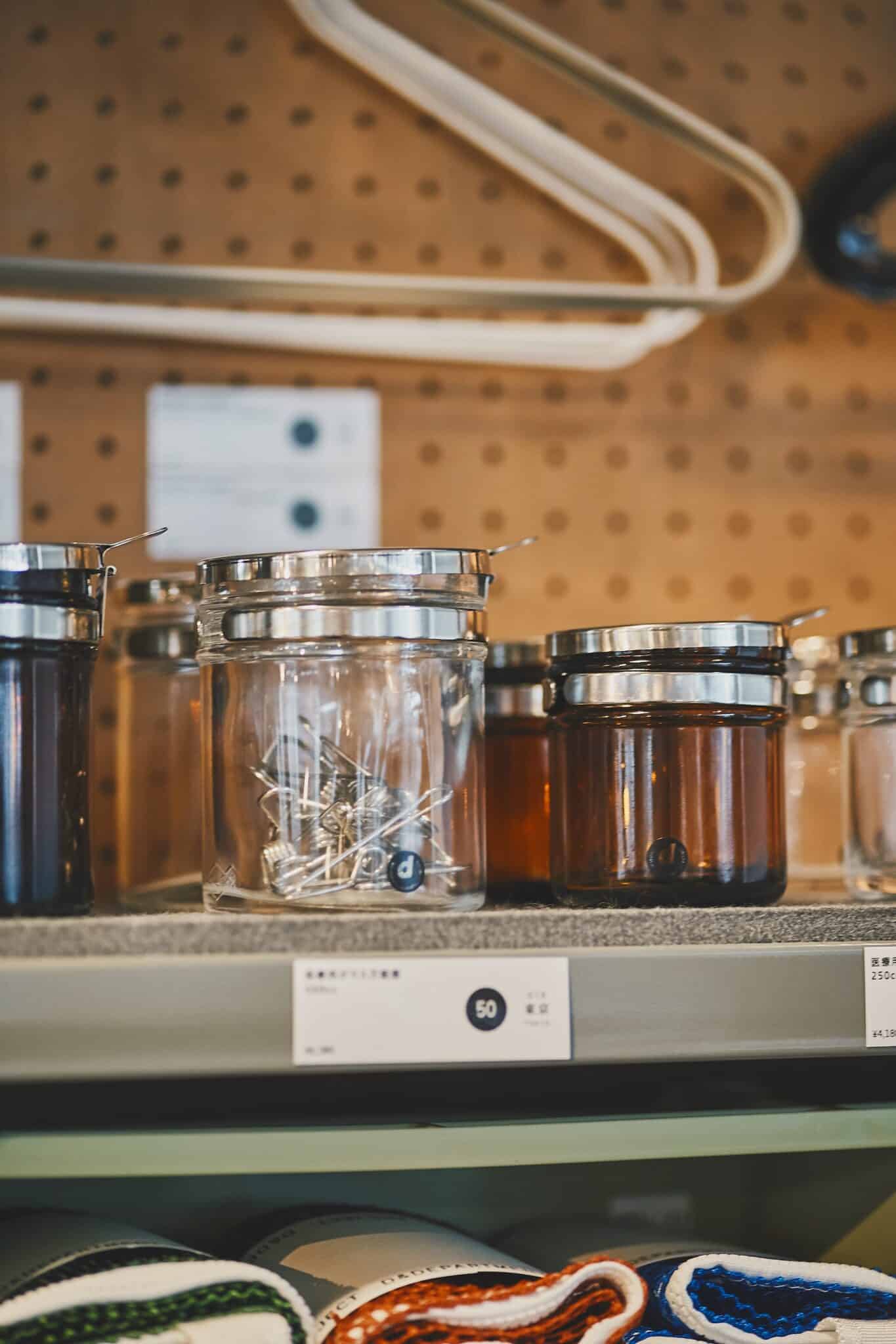 医療用のジャーを小物入れとしてレイアウトするなど、使いかたも提案しながら販売しています。
