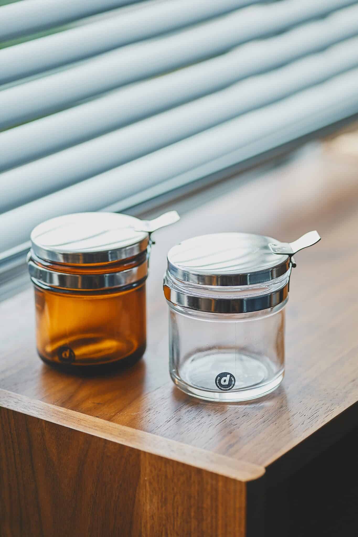 生活のさまざまなシーンに馴染んでくれる、シンプルな医療用ガラス万能壺。カラーはクリア(右)とアンバー(左)の2種で、写真の250ccは綿棒がぴったり収まる高さ。このほか500ccサイズも展開しています。/250cc・4,180円、500cc・6,380円。