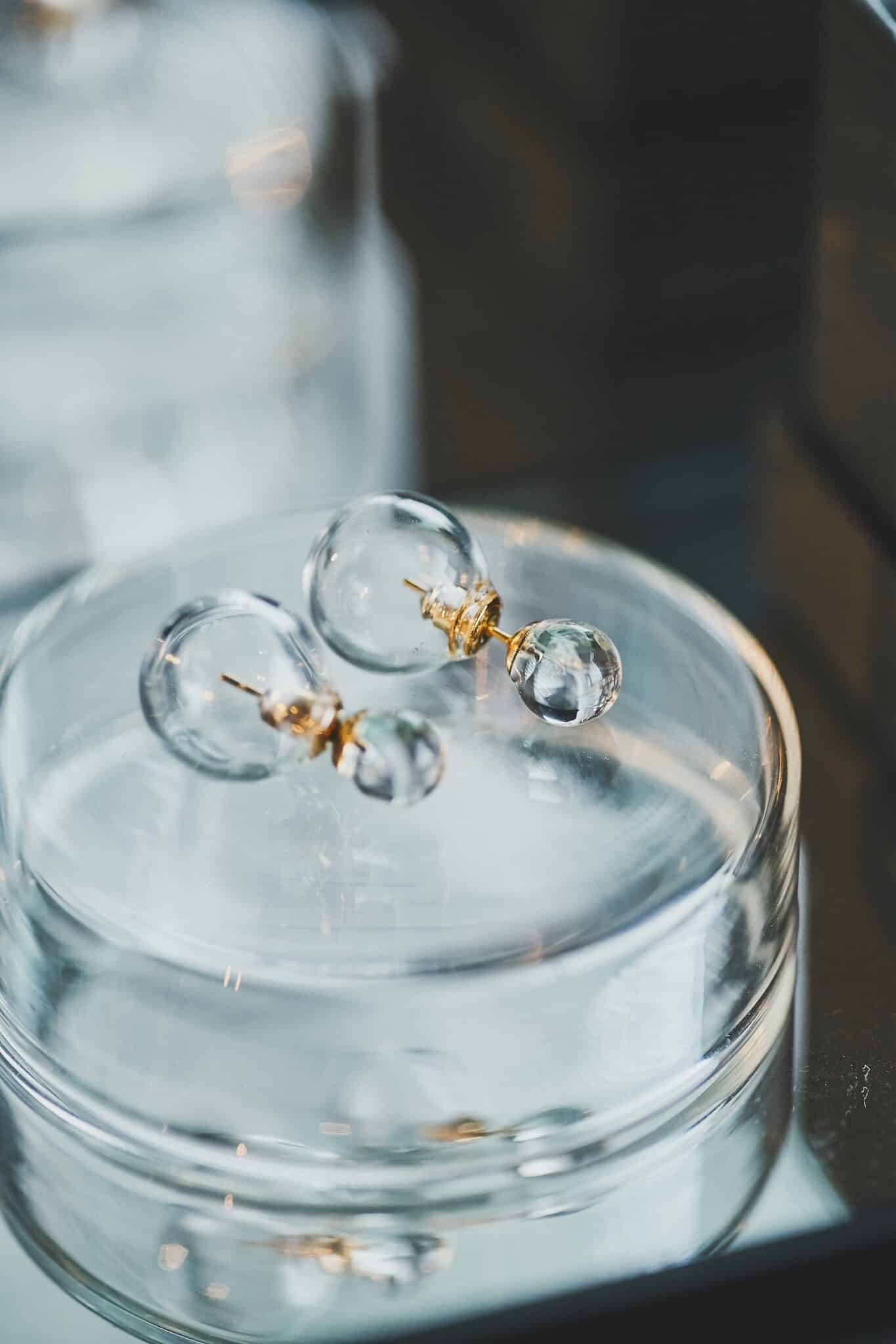 1921年に東京・神田で創業した老舗のガラス器具メーカー・HARIOによるHARIO Lampwork Factoryのアクセサリーも。こちらは年々少なくなってきたガラス職人の技術を継承するべく、2015年に設立されたブランド。D&DEPATMENTのために製作されたピアスは、本来ザラメのような質感のフロストガラスでつくられている定番モデルをクリアガラスで仕立てたオリジナルです。