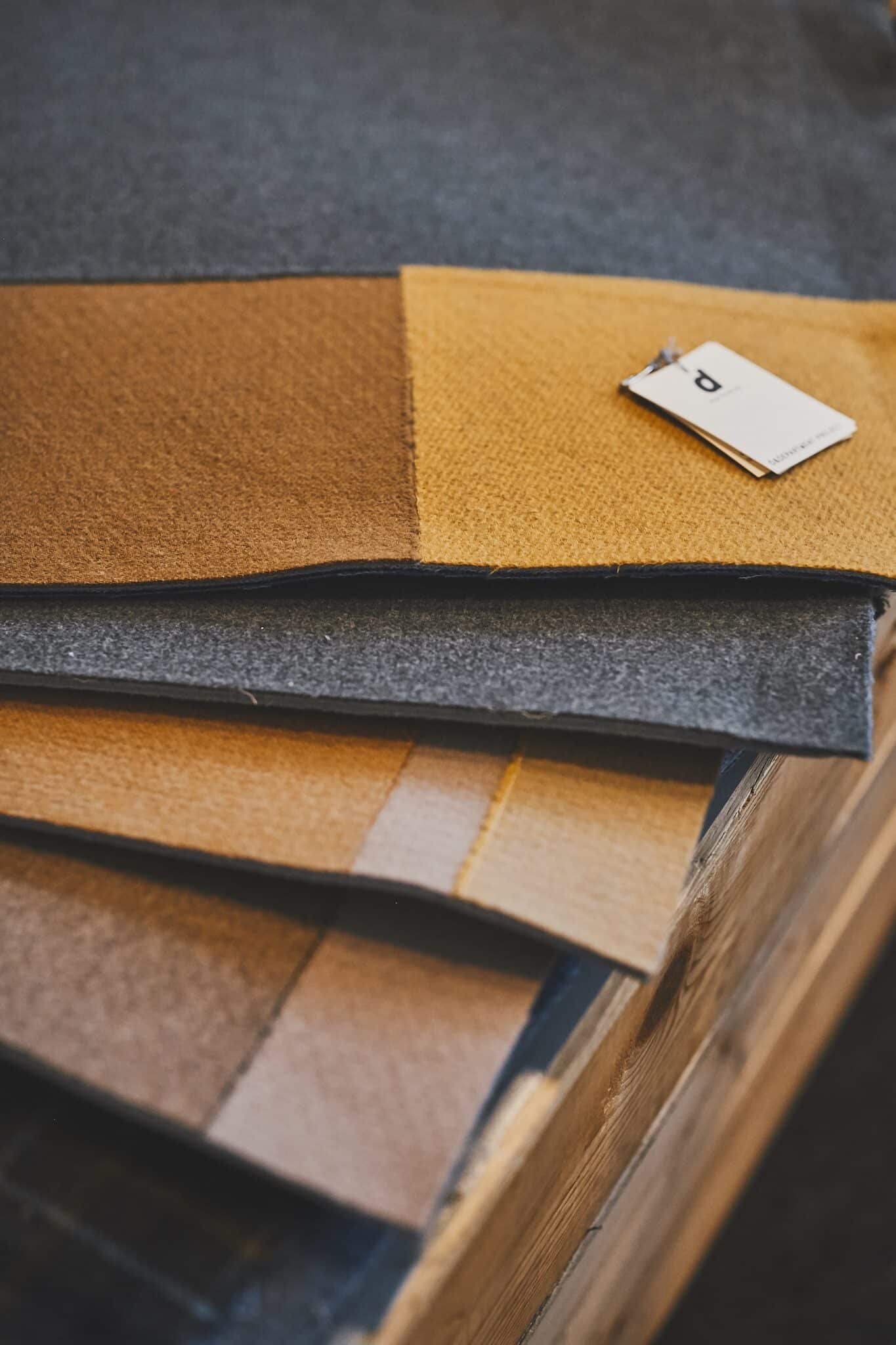 上質なウール生地を使用したラグマットは、テキスタイルメーカーなどで保管されているデッドストックを掘り出し、“生きた在庫”として再利用する「LIFESTOCK」プロジェクトによってつくられました。愛知県と岐阜県に広がる毛織物の名産地、尾州産地にあるメーカーの倉庫で眠っていた生地見本を再利用したオリジナルです。