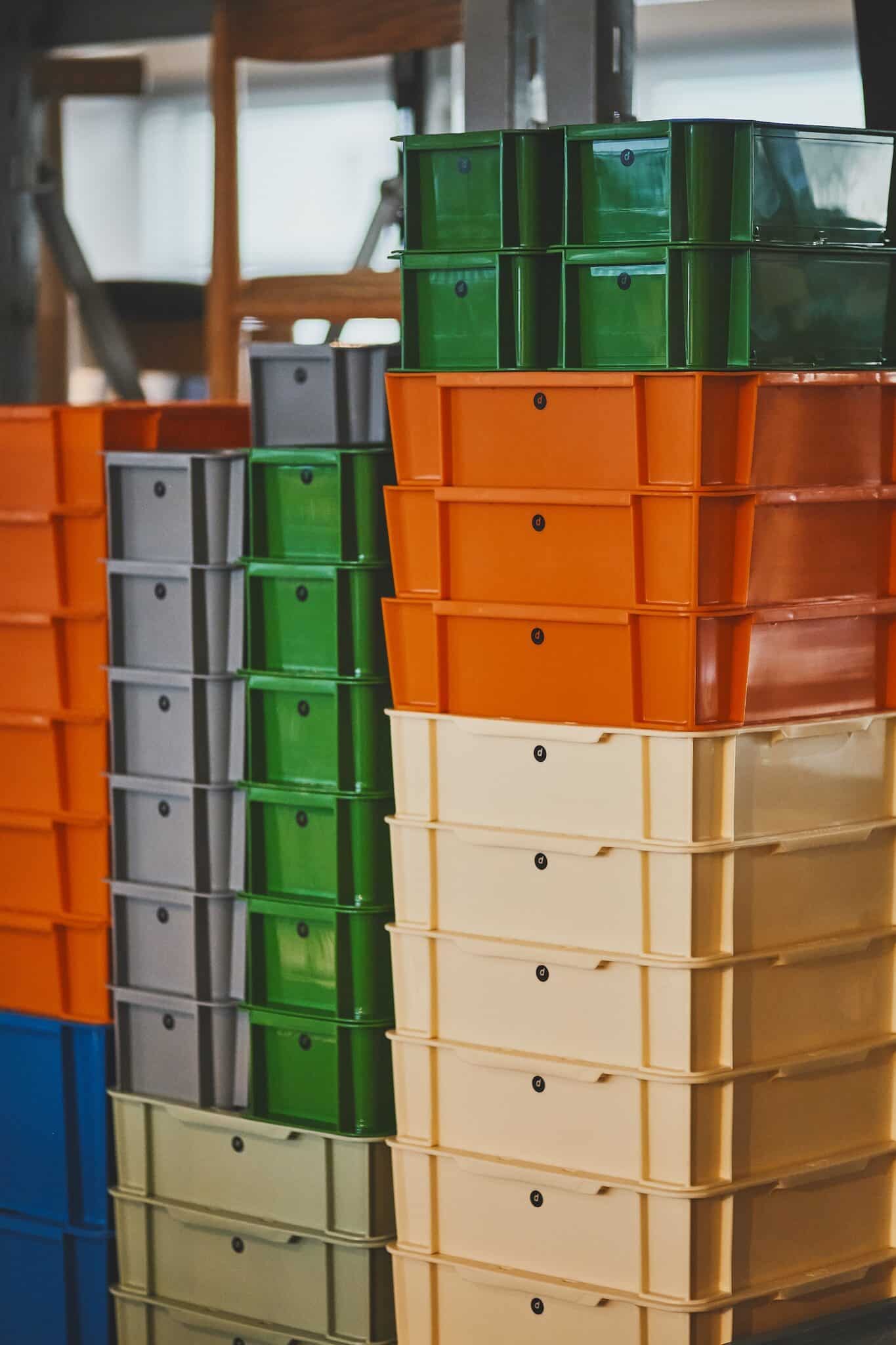 スタッキングできるプラスチック製のサンボックスは、軽くて丈夫。サイズはW340を基本とし、半分のW170ハーフ、1/4サイズのW170ミニが。/ W170ミニ1,100円〜。