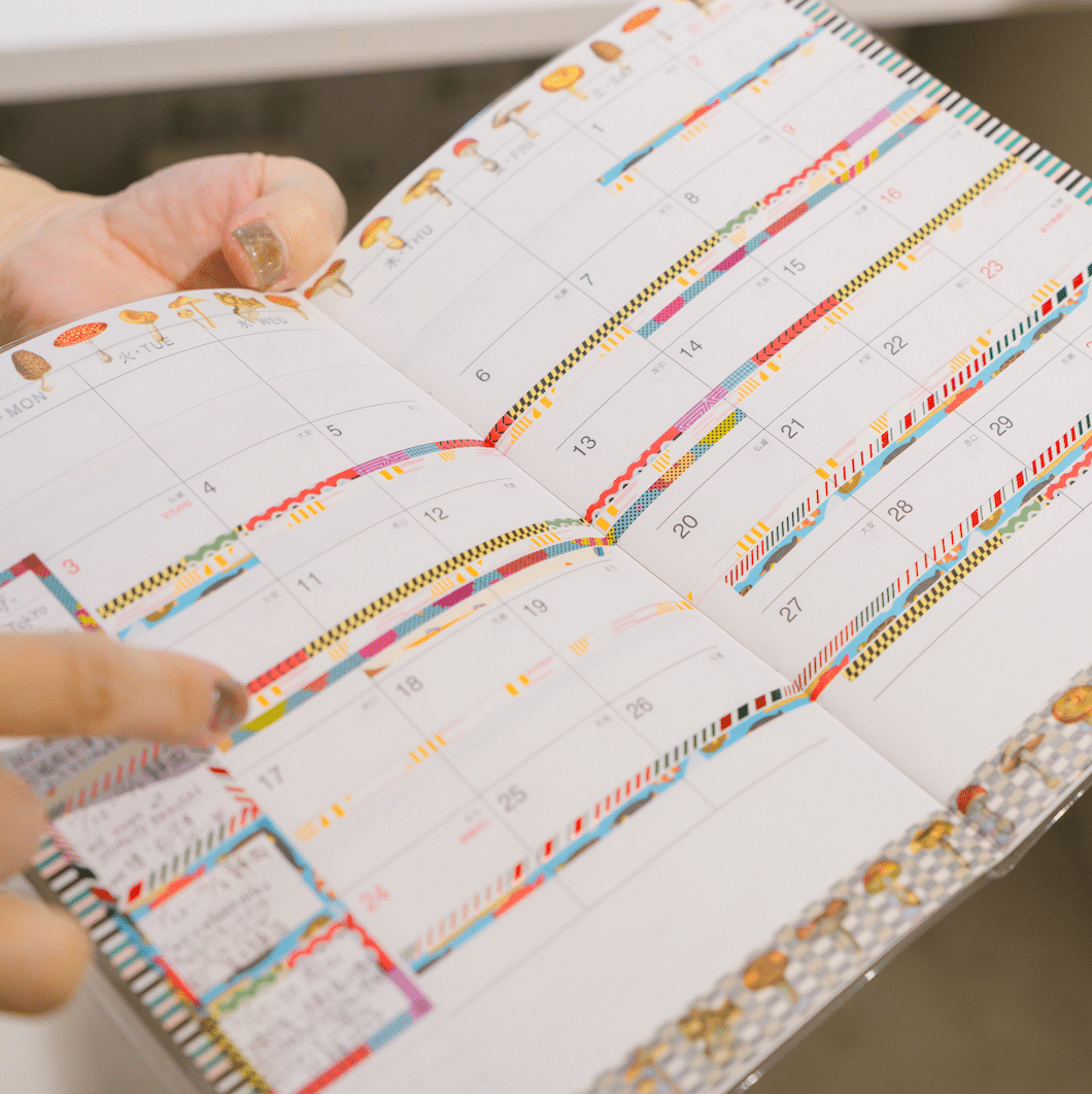 マスキングテープの使い方の参考として展示してあった手帳は、スタッフの手作り。