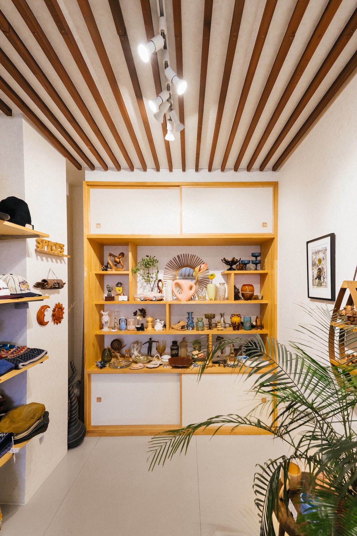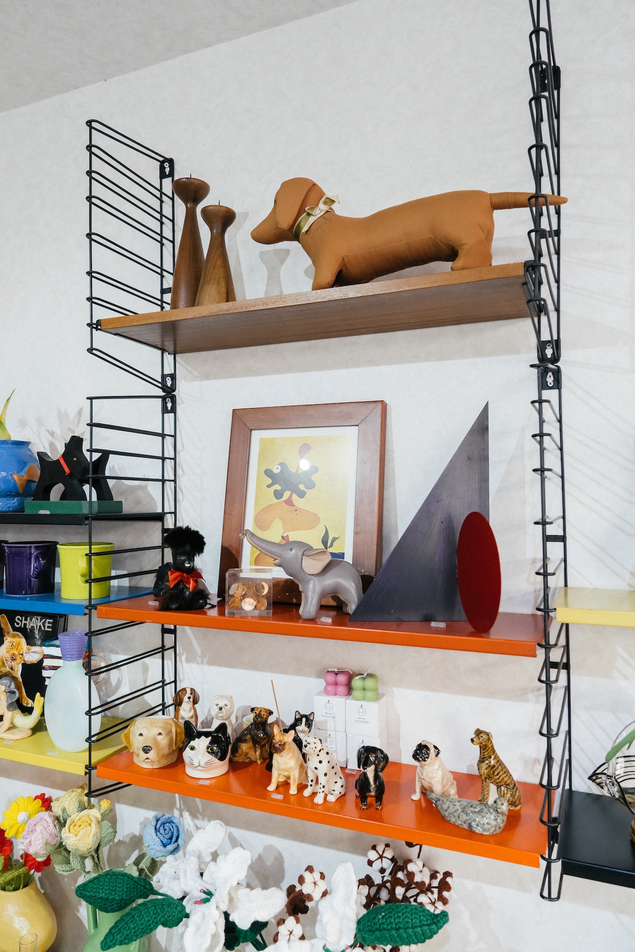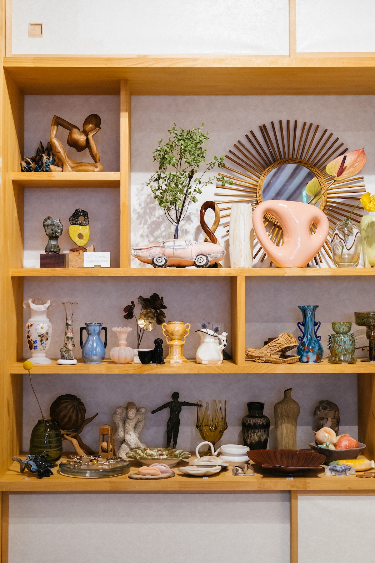 さらに奥に進むと、和の雰囲気が漂う空間が広がります。存在感のある襖の棚はオーナーふたりがデザインしたもの。「和の空間をつくることで、商品の見せ方の幅が広がる」と、あえて和洋折衷にした店内には、ヴィンテージの帽子や花瓶、木調のオブジェがよく馴染んでいます。
