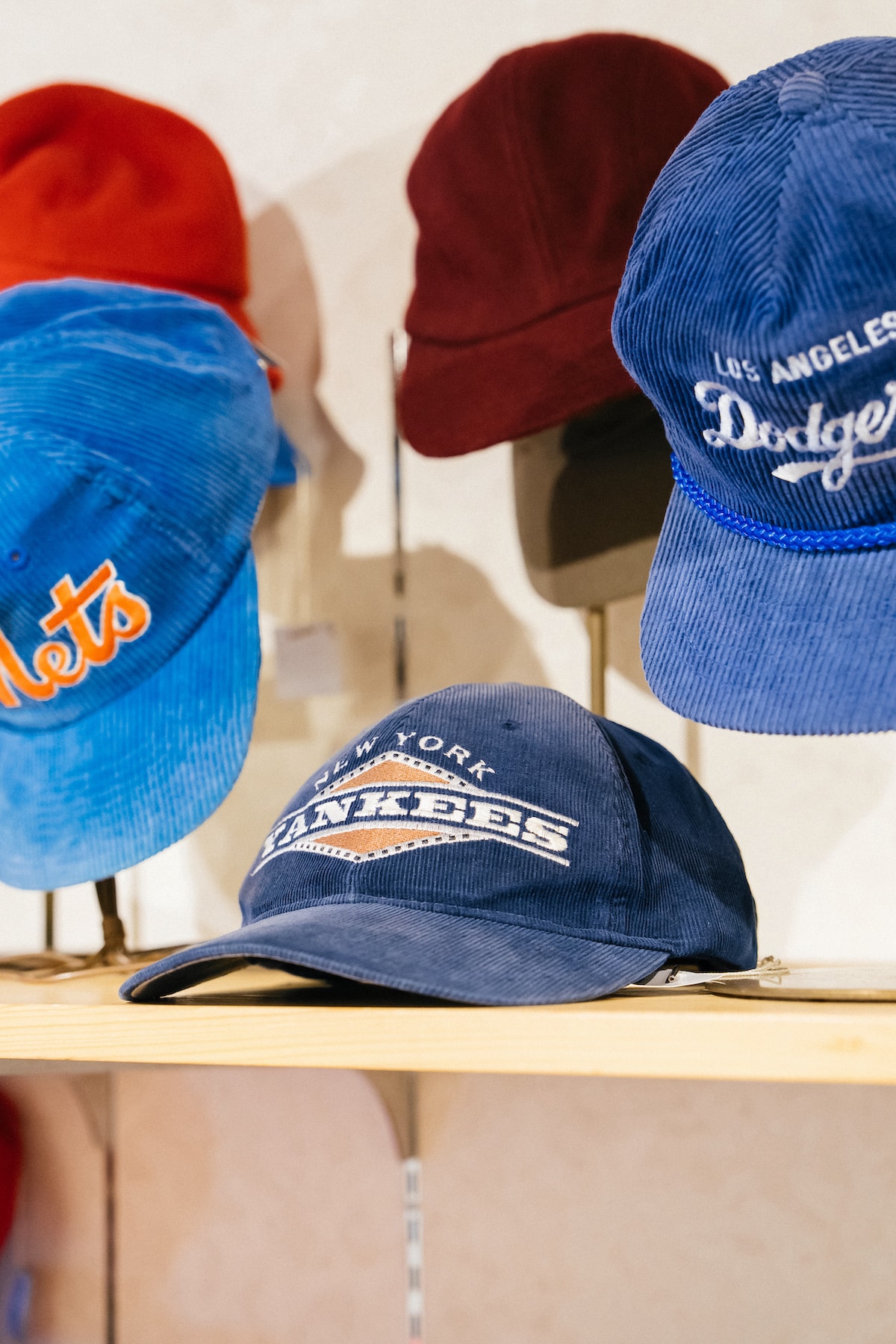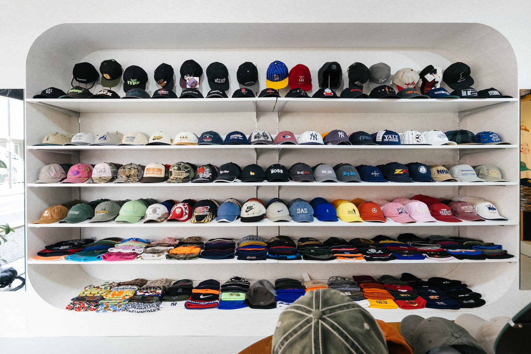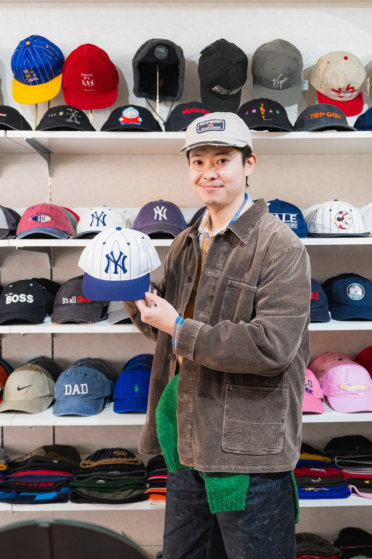 「現代のものとは違って、80〜90年代のアメリカ製キャップは、カラーやつばの長さ、クラウンの形や高さまで、本当にデザインが豊富なんです。だからこそ、帽子ひとつでスタイリングに個性を出すことができるんです」と太郎さん。