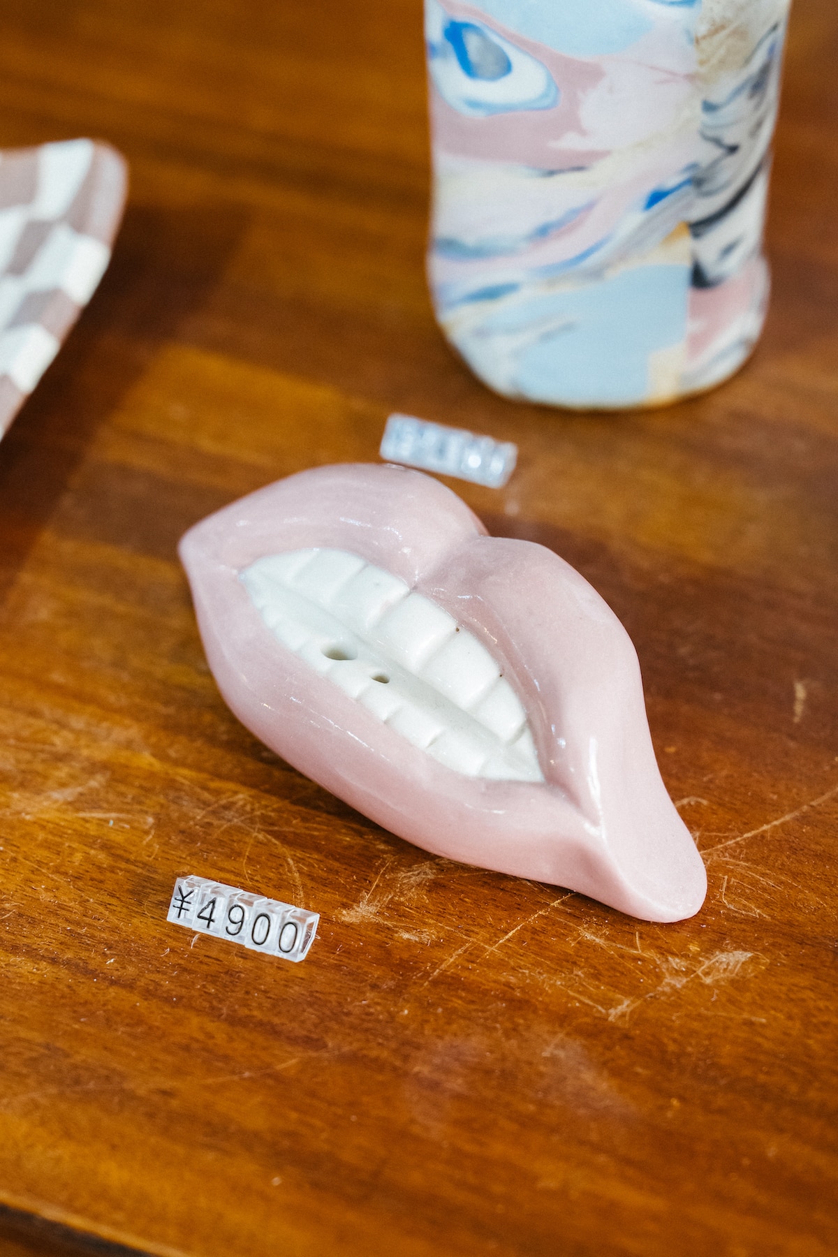 中へ入ると、まず目に入るのは白を基調とした明るい空間。ブラックやホワイトなどのベーシックカラーからピンク、イエロー、ブルーなどビビッドなカラーまで、キャップが色ごとに整然と並べられています。さらに、ポップなデザインの花瓶も並べられ、そのまわりにはオブジェやお香立てなどの雑貨もディスプレイ。美術館巡りが趣味だという佳純さんは、展示における光の当て方や物と物の間隔の取り方などを参考に、商品の背景にあるストーリーを加味してディスプレイしているそう。