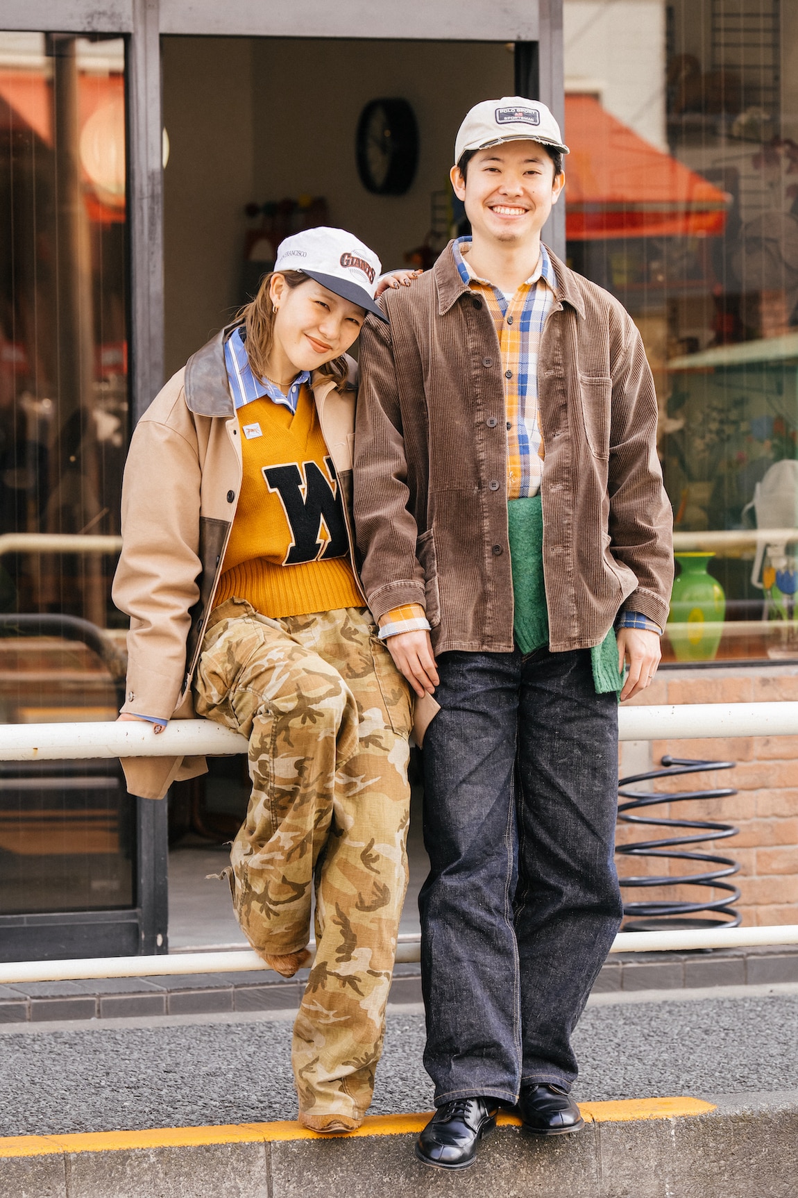 太郎さんは『ポロ ラルフ ローレン』のコーデュロイジャケットをチェック柄シャツに重ねたアメカジスタイルに『POLO SPORT』の90年代の武骨なキャップを合わせています。佳純さんは、プレッピーなカレッジニットとミリタリーパンツに80年代のサンフランシスコ・ジャイアンツの個性的なピルボックスキャップを合わせたミックススタイル。