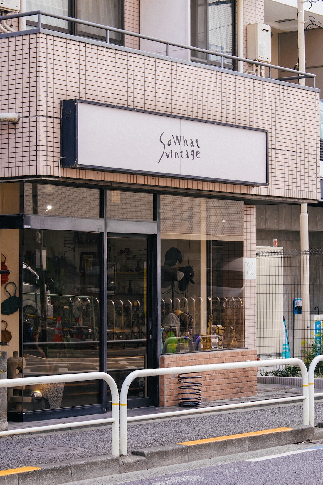 『sowhat vintage』は一面ガラス張りの外観で、通りから店内の様子をうかがえ、初めて足を運ぶ人でも入りやすい雰囲気です。