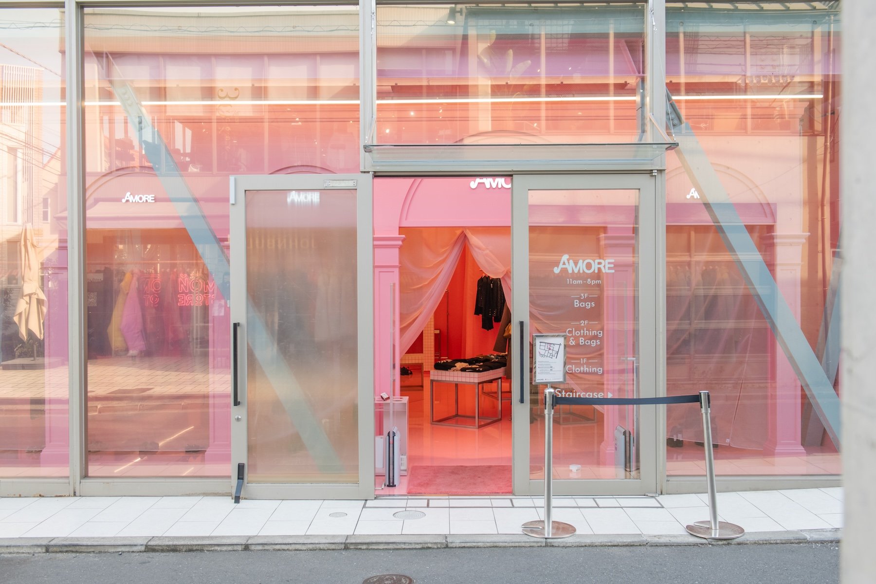 こちらが店舗の外観。壁一面ガラス張りのビルの中に、ピンクの柱やレースカーテンが透けて見えます。
